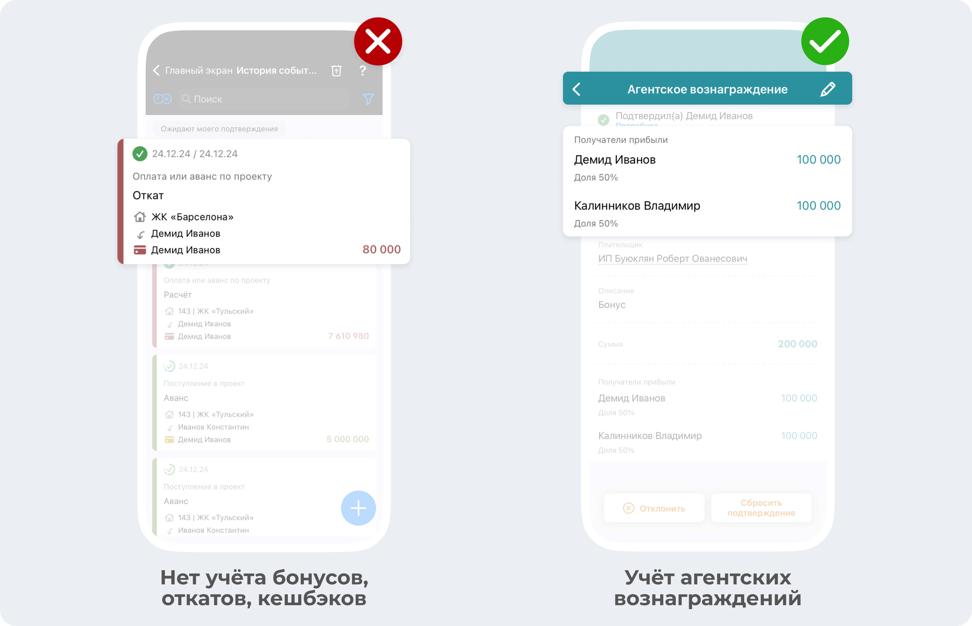Правильный учет «откатов», «процентов» и других агентских вознаграждений — ключ к долгому сотрудничеству с дизайнерами, брокерами, риелторами и застройщиками, которые приводят вам клиентов. Приложение 101 позволяет автоматически распределять прибыль от бонусов между всеми участниками, не нарушая учёт собственных средств.
