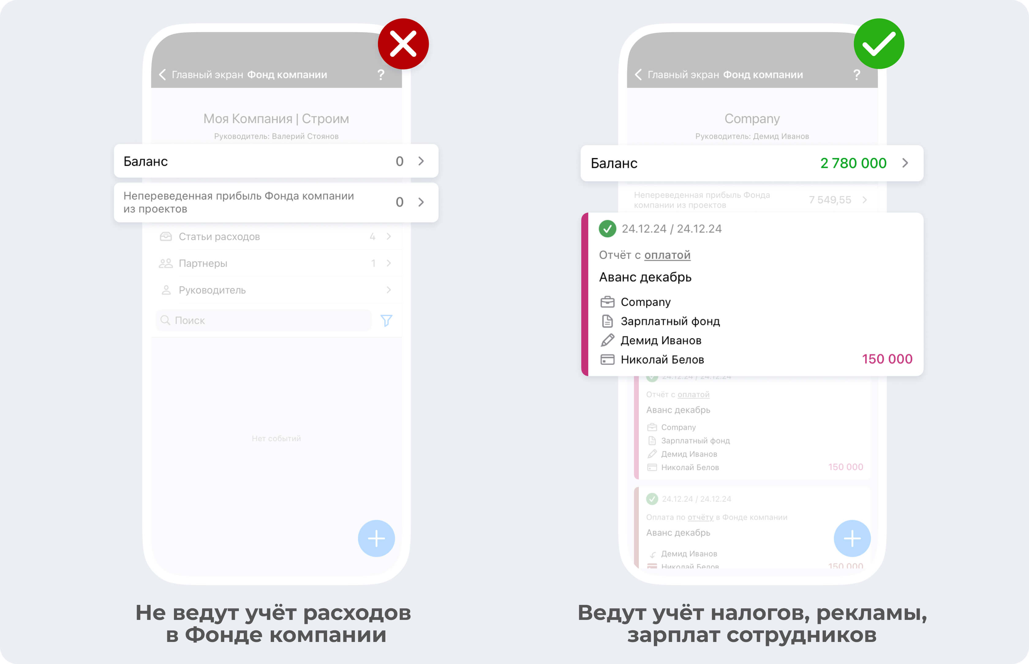 В фонде компании вы можете видеть сумму денежных средств у каждого участника по фонду и понимать, кто может осуществить какую-либо трату, потому что у него на руках есть деньги.