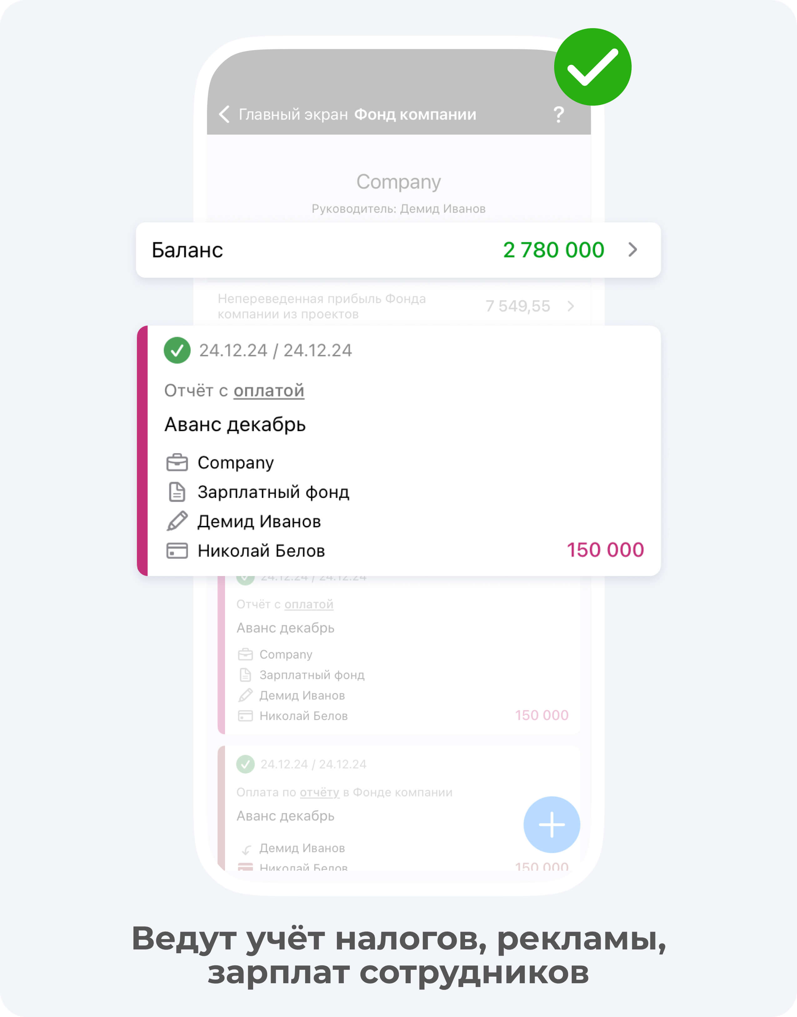 Фонд компании — это раздел в приложении, в котором предприниматели могут вести учет своих внутренних расходов, таких как: аренда офиса, реклама, зарплаты сотрудников. Создавать фонд компании не нужно, он по умолчанию доступен пользователю тарифа PRO+.