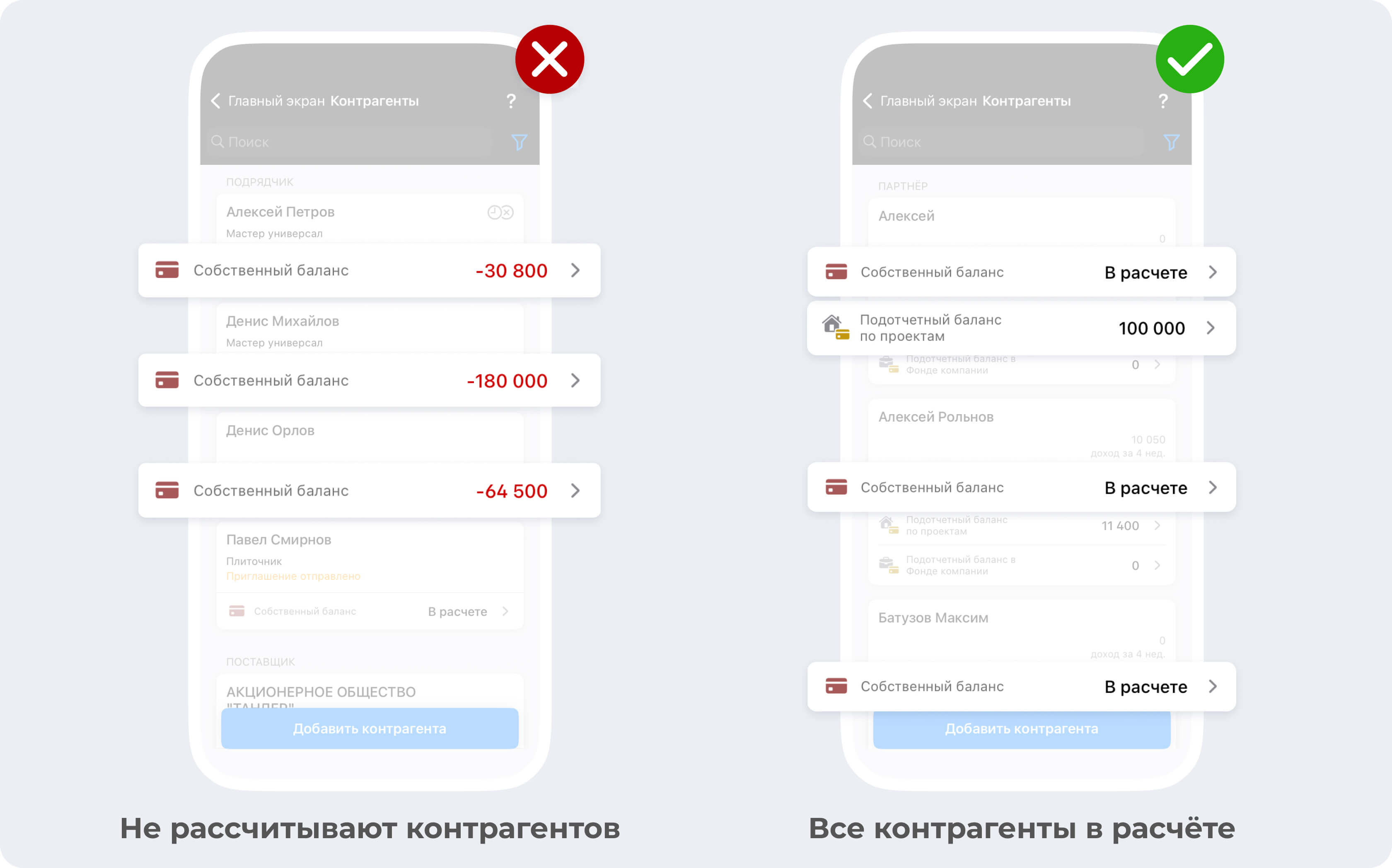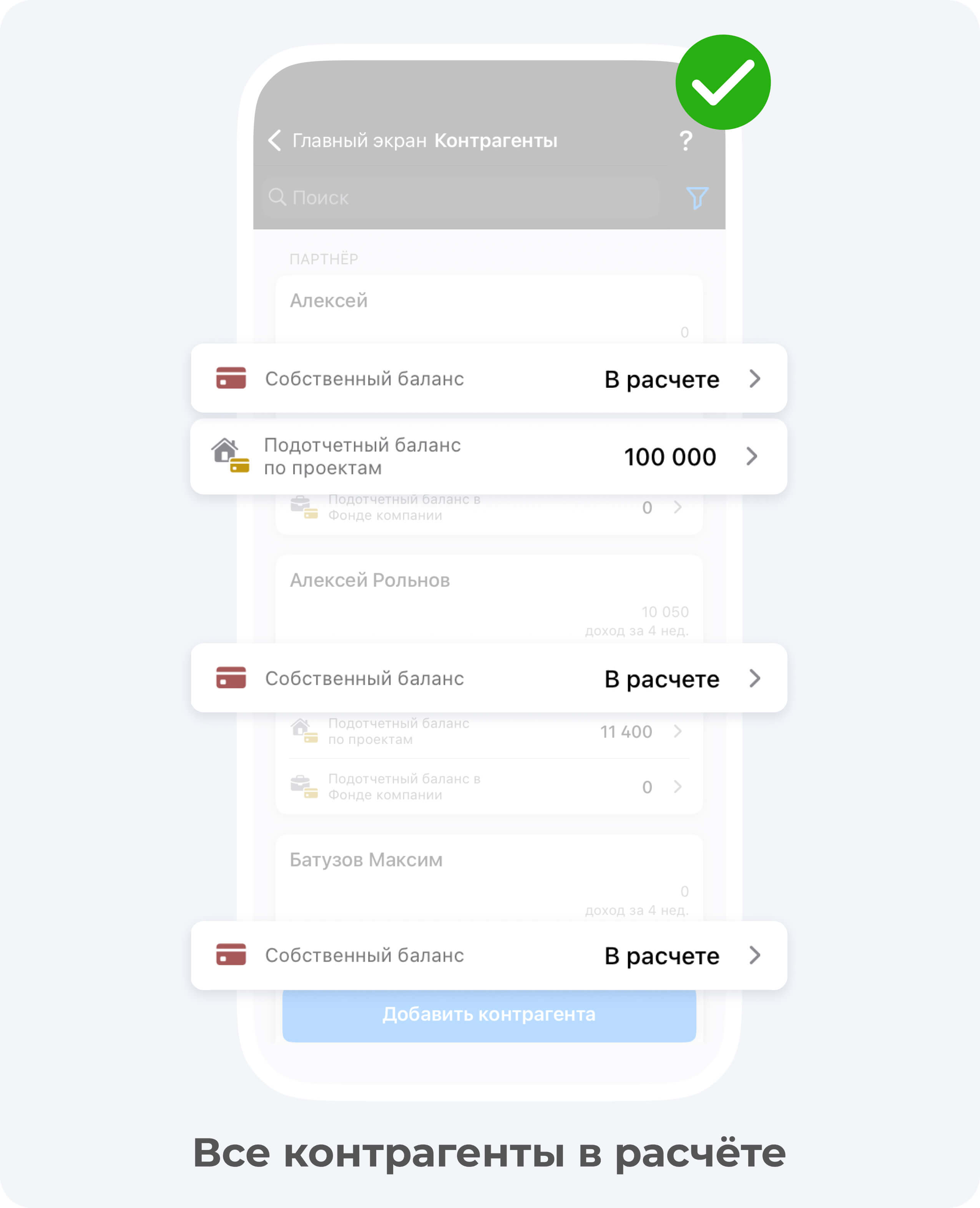 С помощью нашего приложения вы всегда будете знать, сколько средств осталось на балансе того или иного контрагента. Приложение 101 позволяет сделать на него перевод подотчетных средств, которые он не имеет права тратить без отчета в нашей системе.