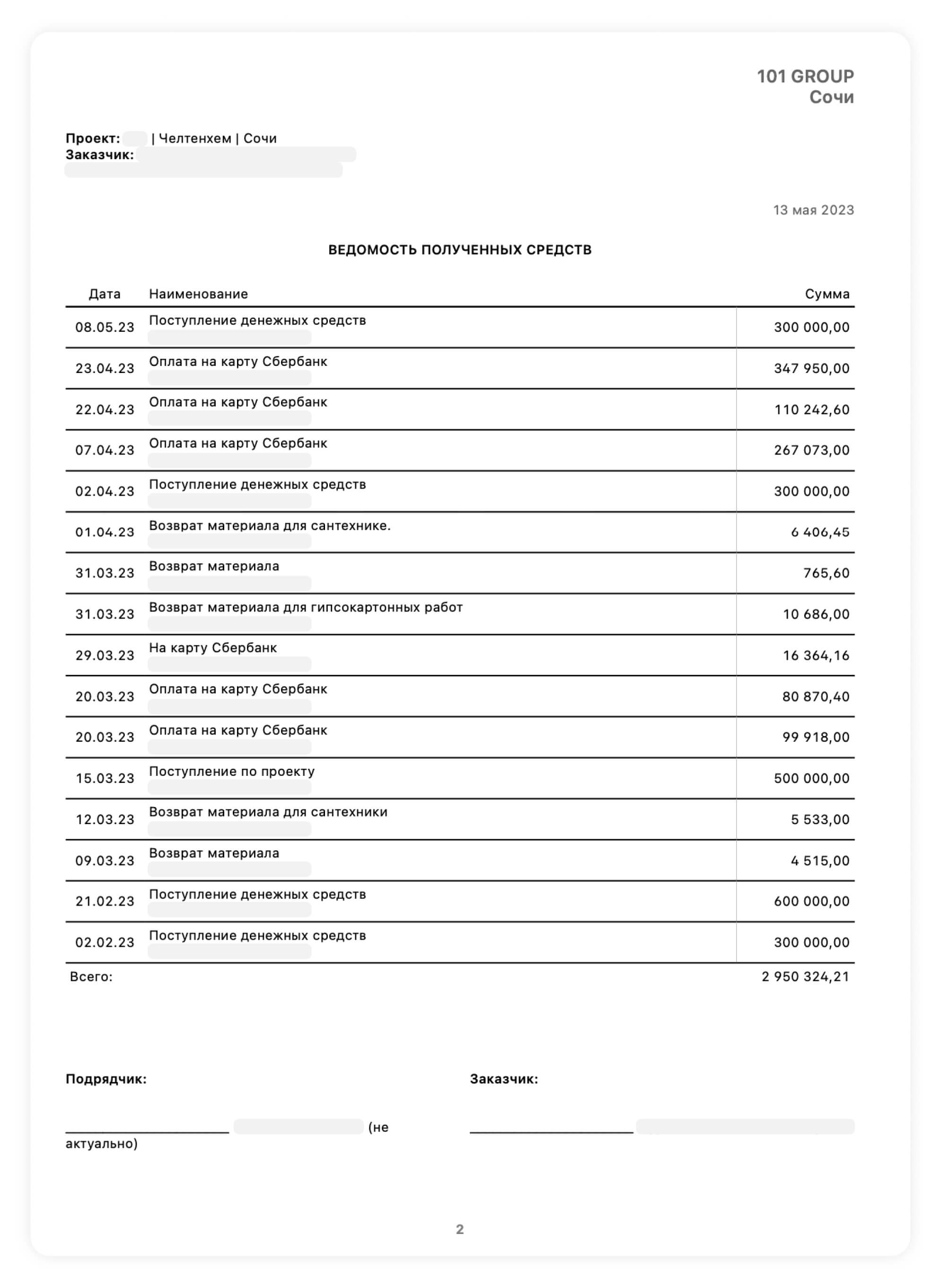 Вы можете сформировать отчет в любой момент времени, чтобы увидеть все затраты по статьям расходов и сверить сколько денежных средств вы передали на реализацию объекта.