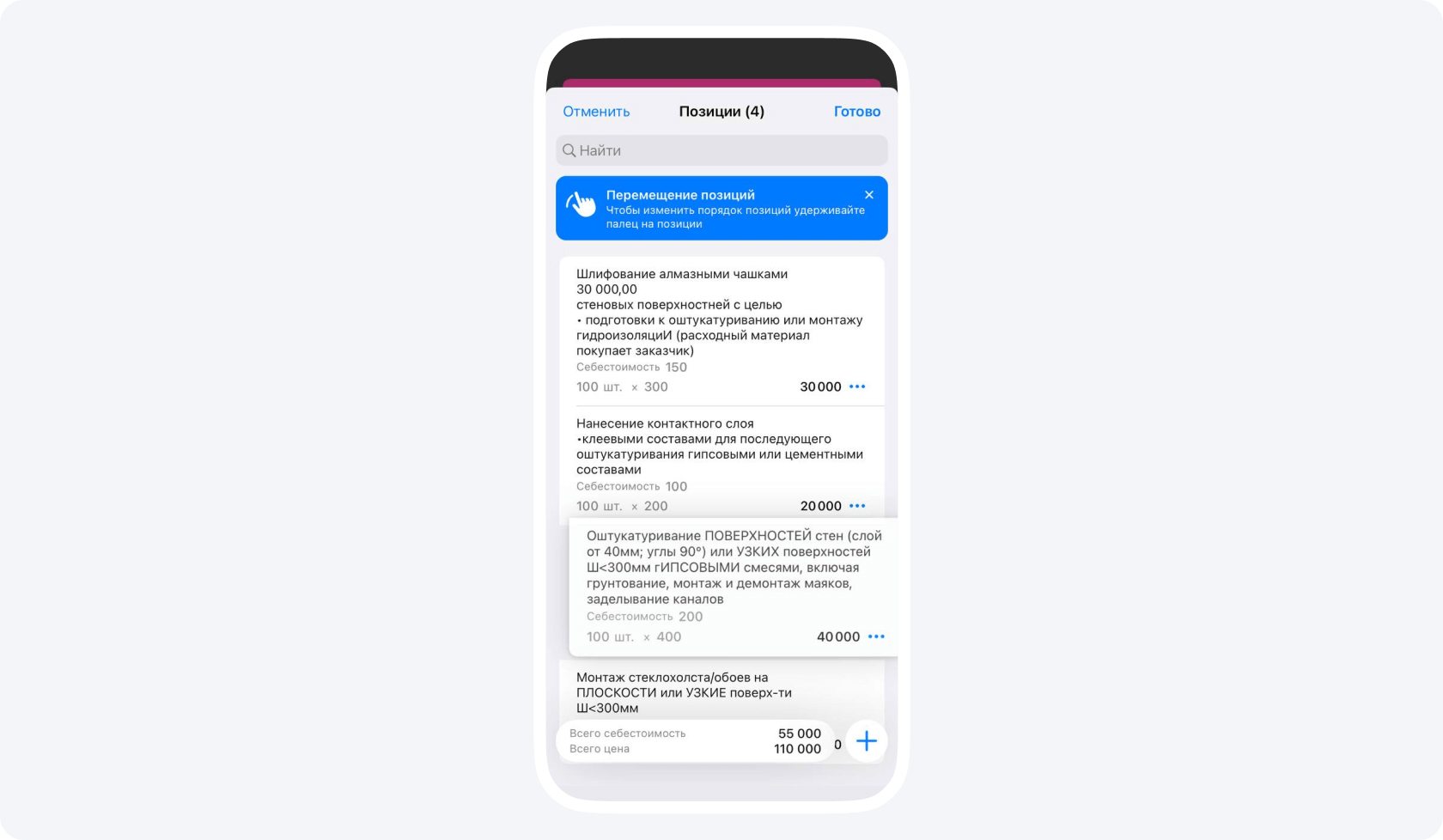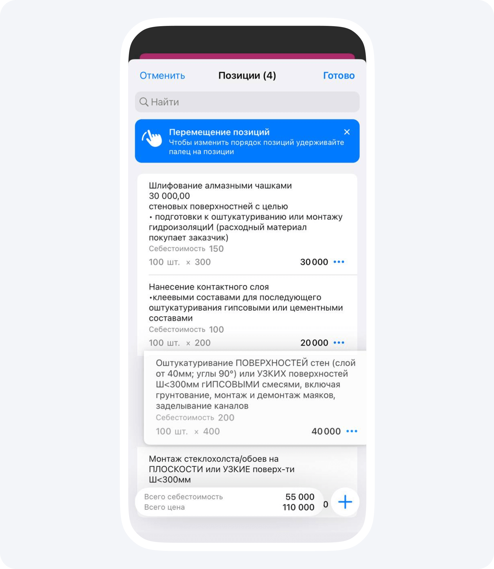 В новое обновление мы бесплатно вложили наш прайс-лист от 101 GROUP. Чтобы увидеть какие-либо позиции из него, введите в поиске нужные вам работы и система сама предложит вам совпадения из нашего прайса. Вы можете взять эти позиции и пользоваться ими.