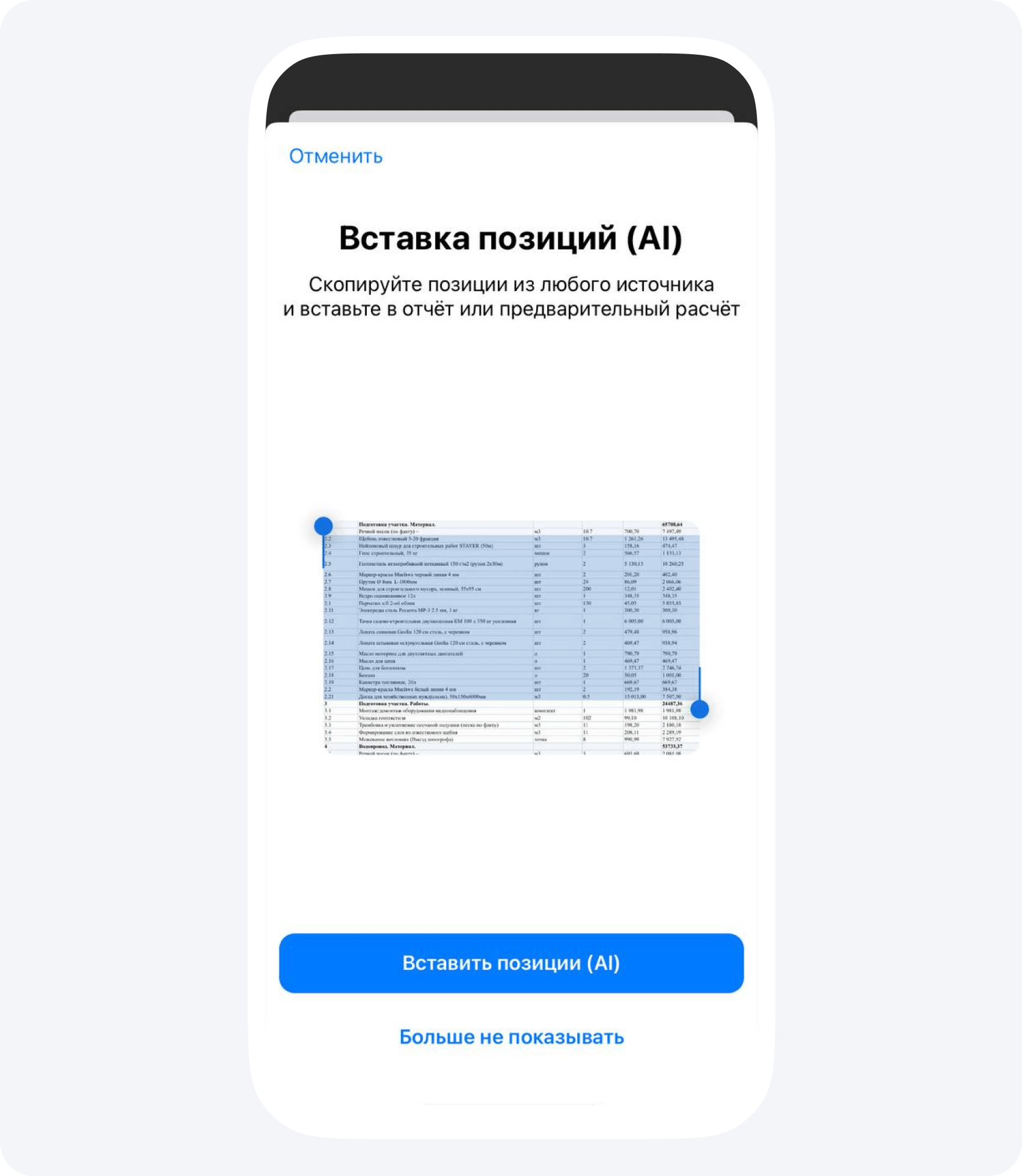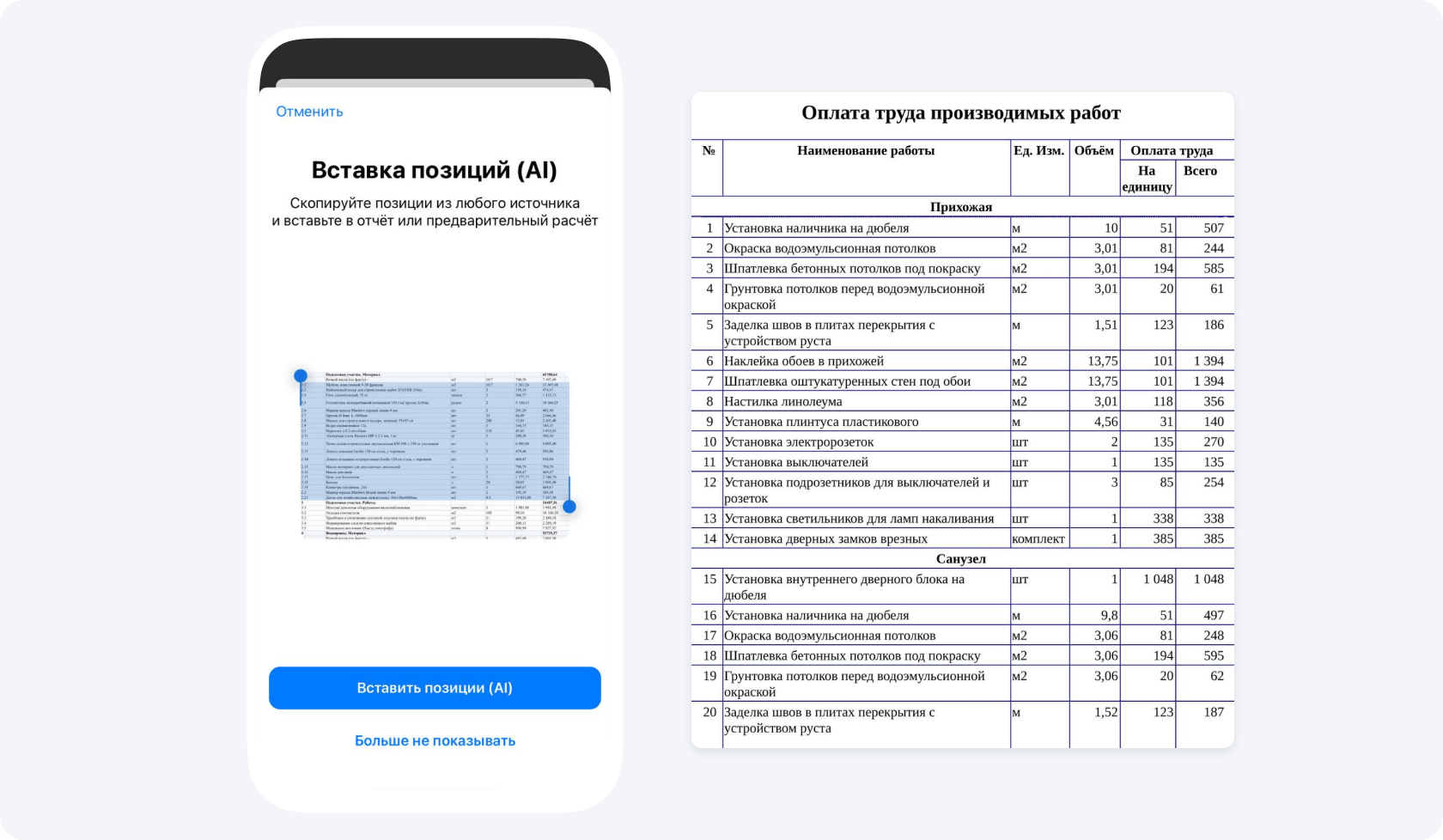 Это будет полезным для вас, если вы делаете отчет для заказчика и у вас бумажный чек/счет-фактура/накладная от подрядчиков. Раньше в этой ситуации было два пути: вносить все вручную или просто писать «Штукатурные работы». Это было не очень удобно и мы решили упростить вашу жизнь — теперь вам достаточно просто скопировать текст из таблицы или файла, вставить в приложение и ИИ сам определит, где стоимость, единицы измерения, описание и другие параметры, чтобы самостоятельно рассортировать данные и сформировать отчет.