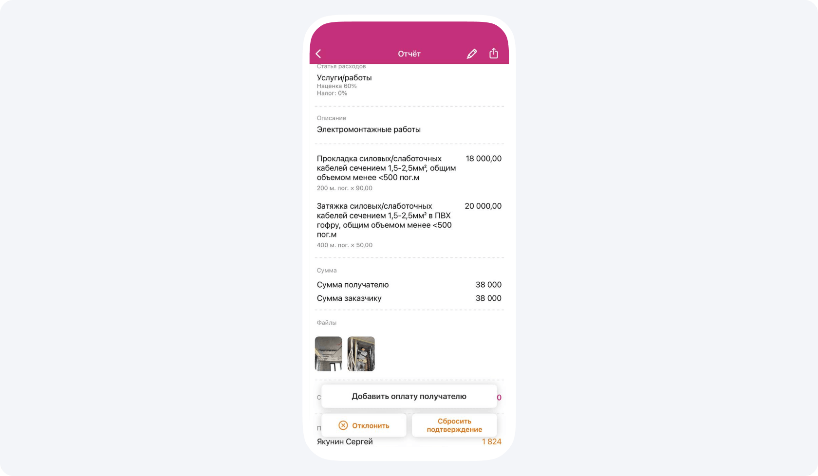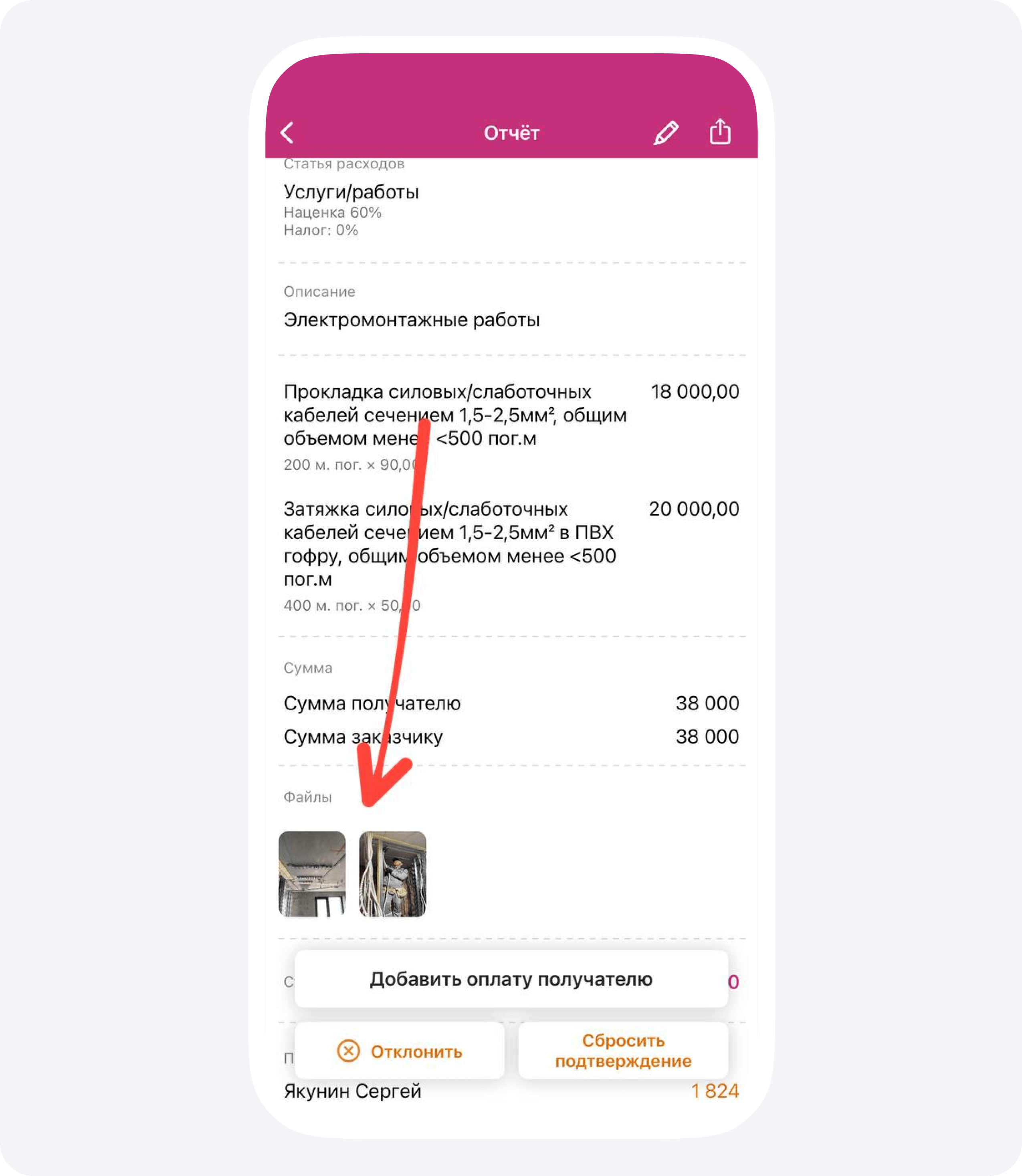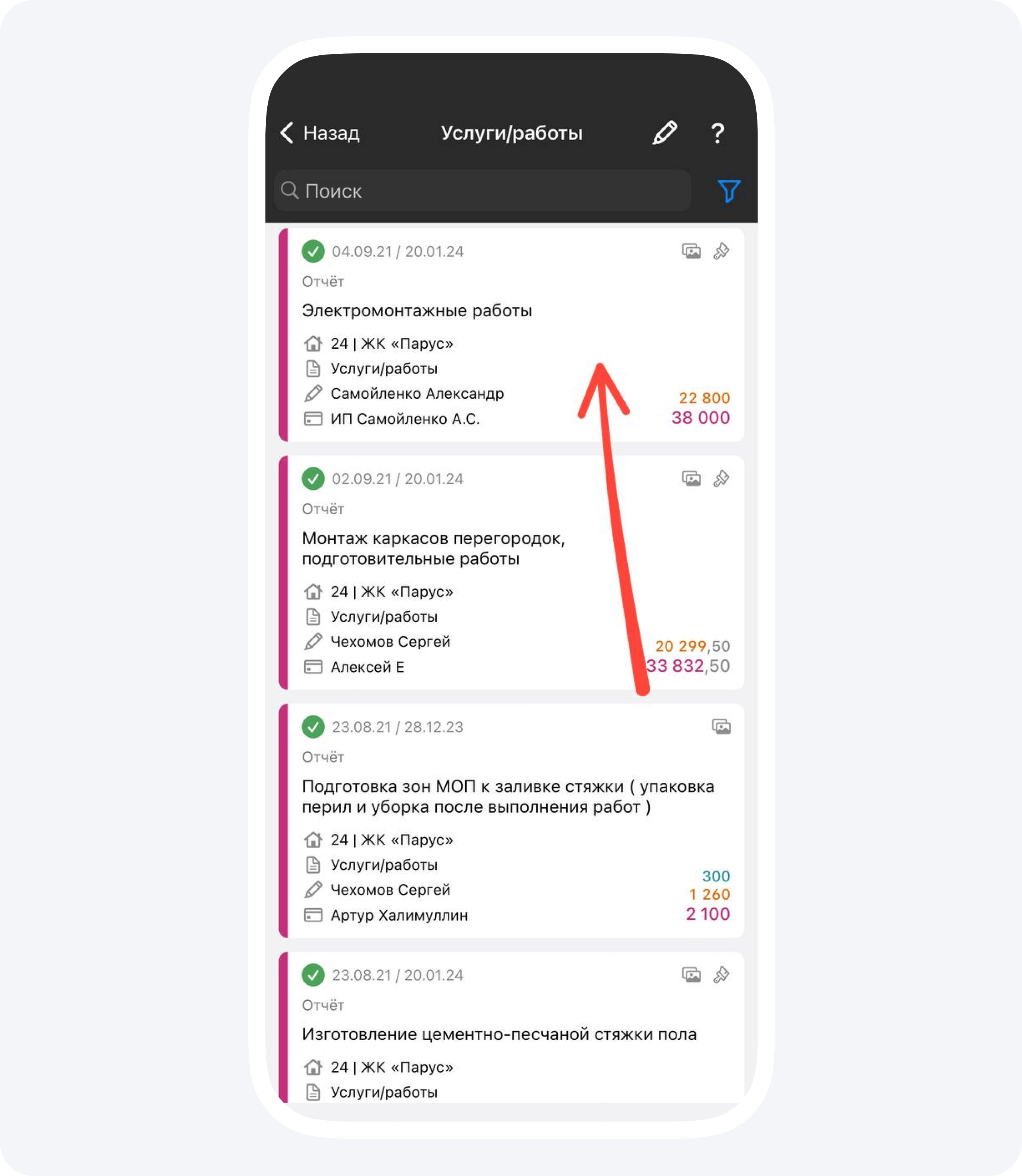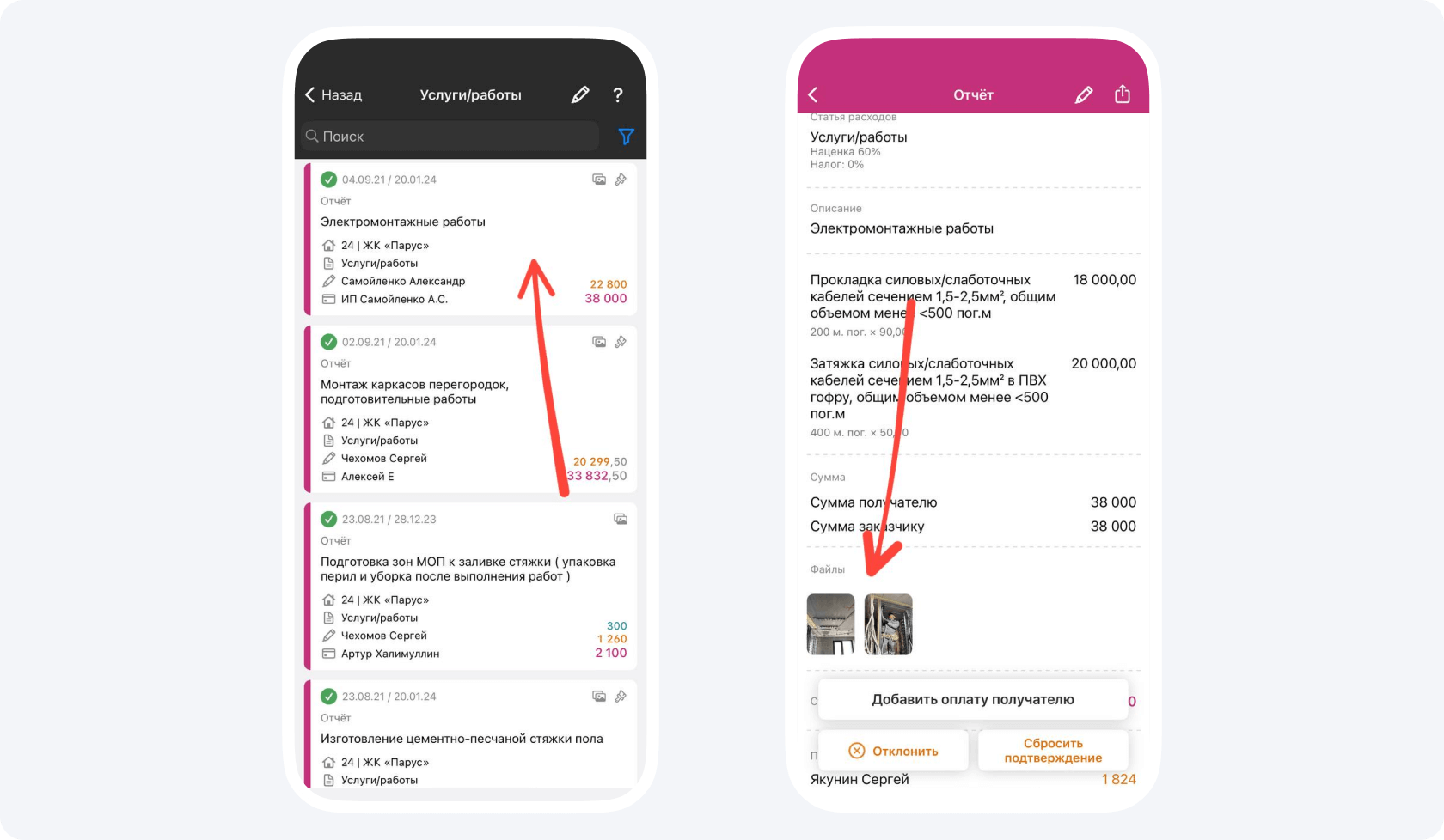 1. Я пошел изучать счета, которые накопились в приложении. К каждому из них прилагаются фотографии, чтобы заказчик мог визуализировать итоги работ, а не просто видеть, что его деньги куда-то тратятся.