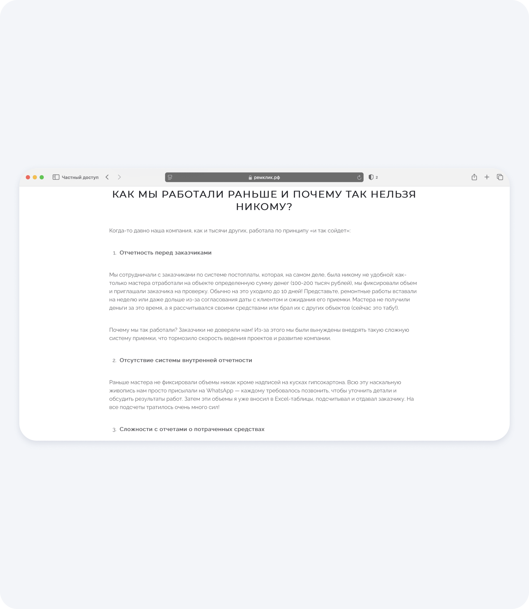 Представители компании поделились, что раньше вели учет в Excel, страдали из-за сложностей с подочетными средствами и не могли перейти на систему работы по предоплате.
