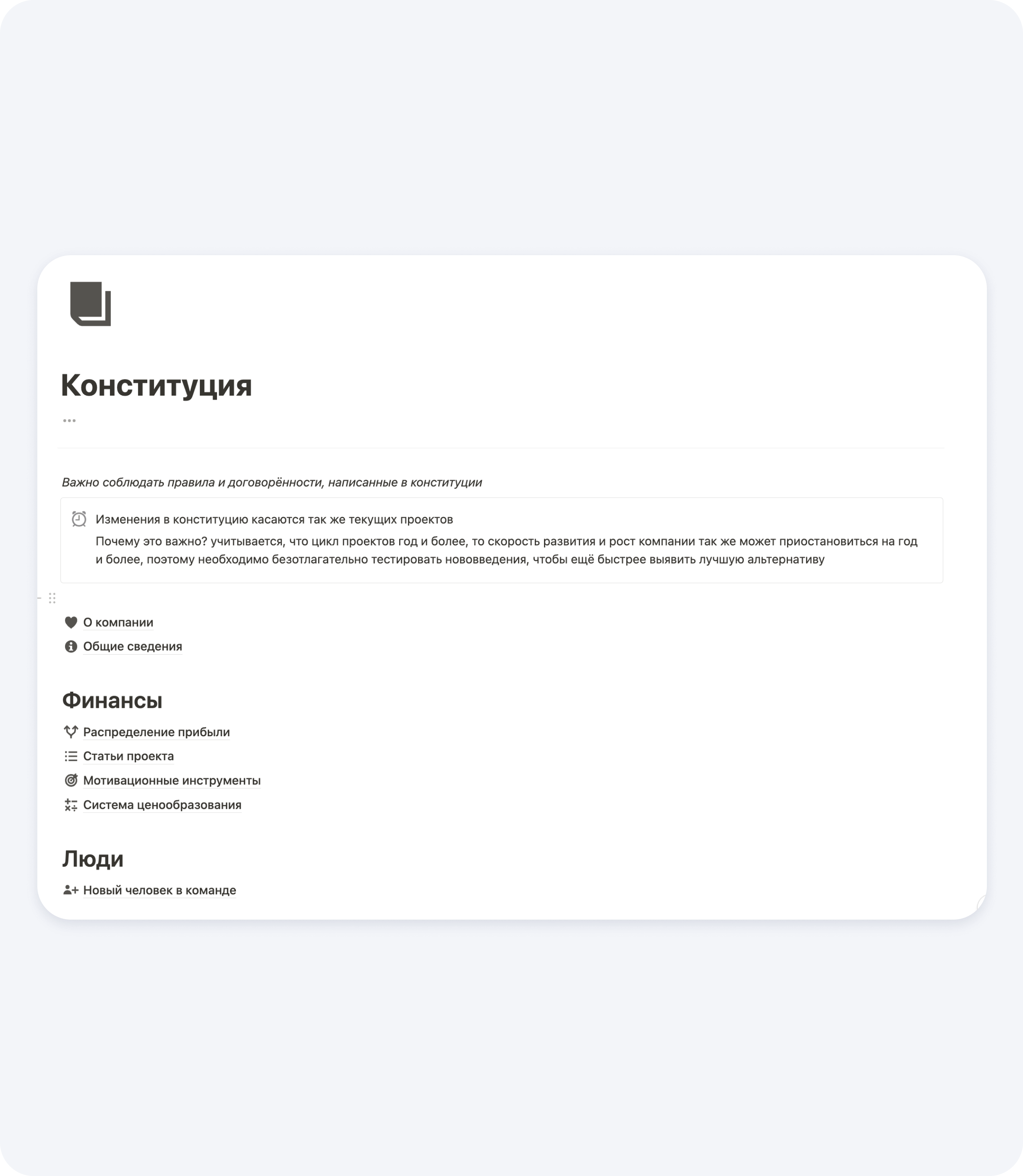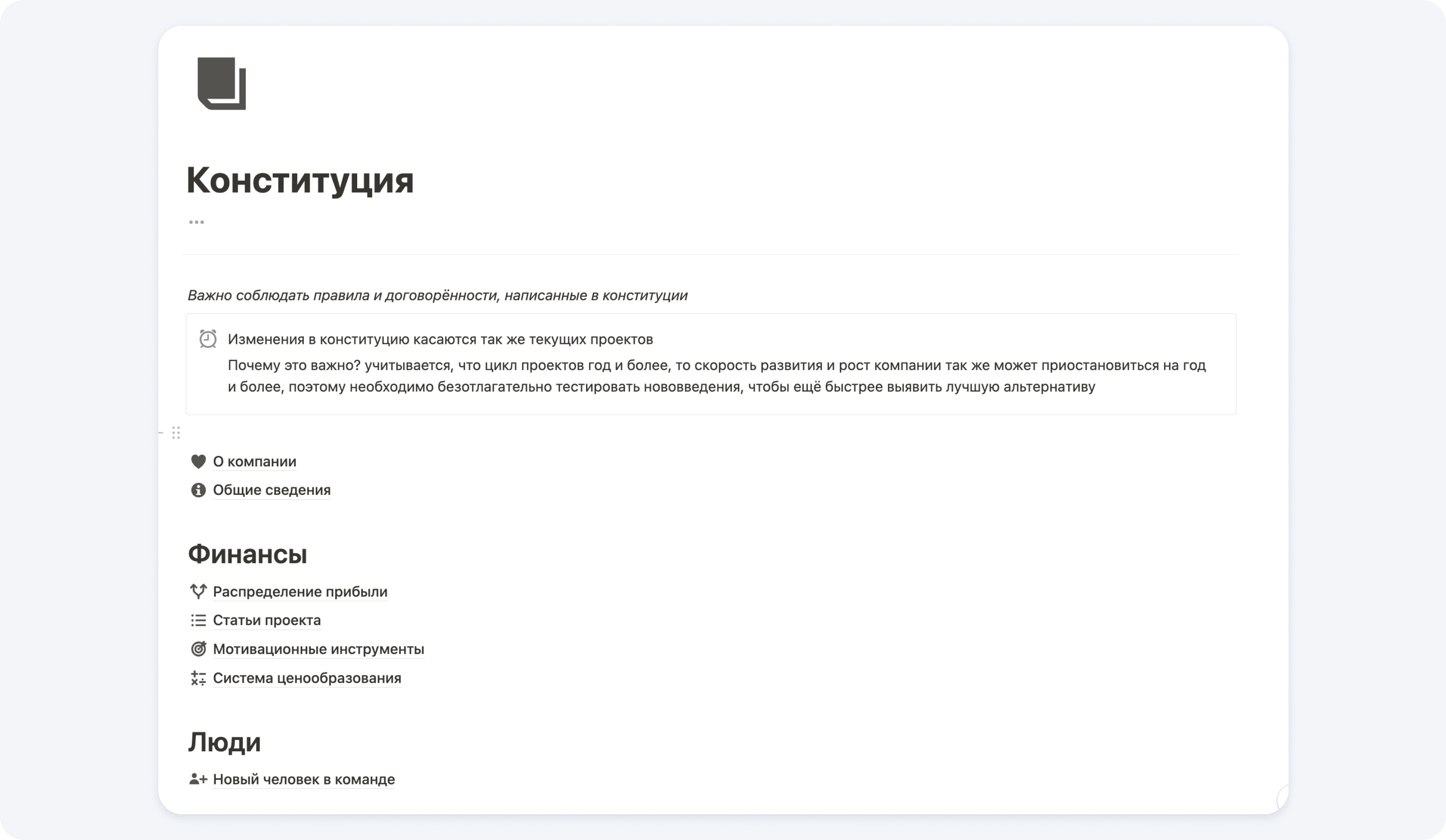 У нас есть «Конституция», с которой ознакомлен каждый сотрудник. В ней — множество разделов с различными правилами по распределению прибыли между руководителями, регламенты работы и информация для анбординга новых людей в компании.