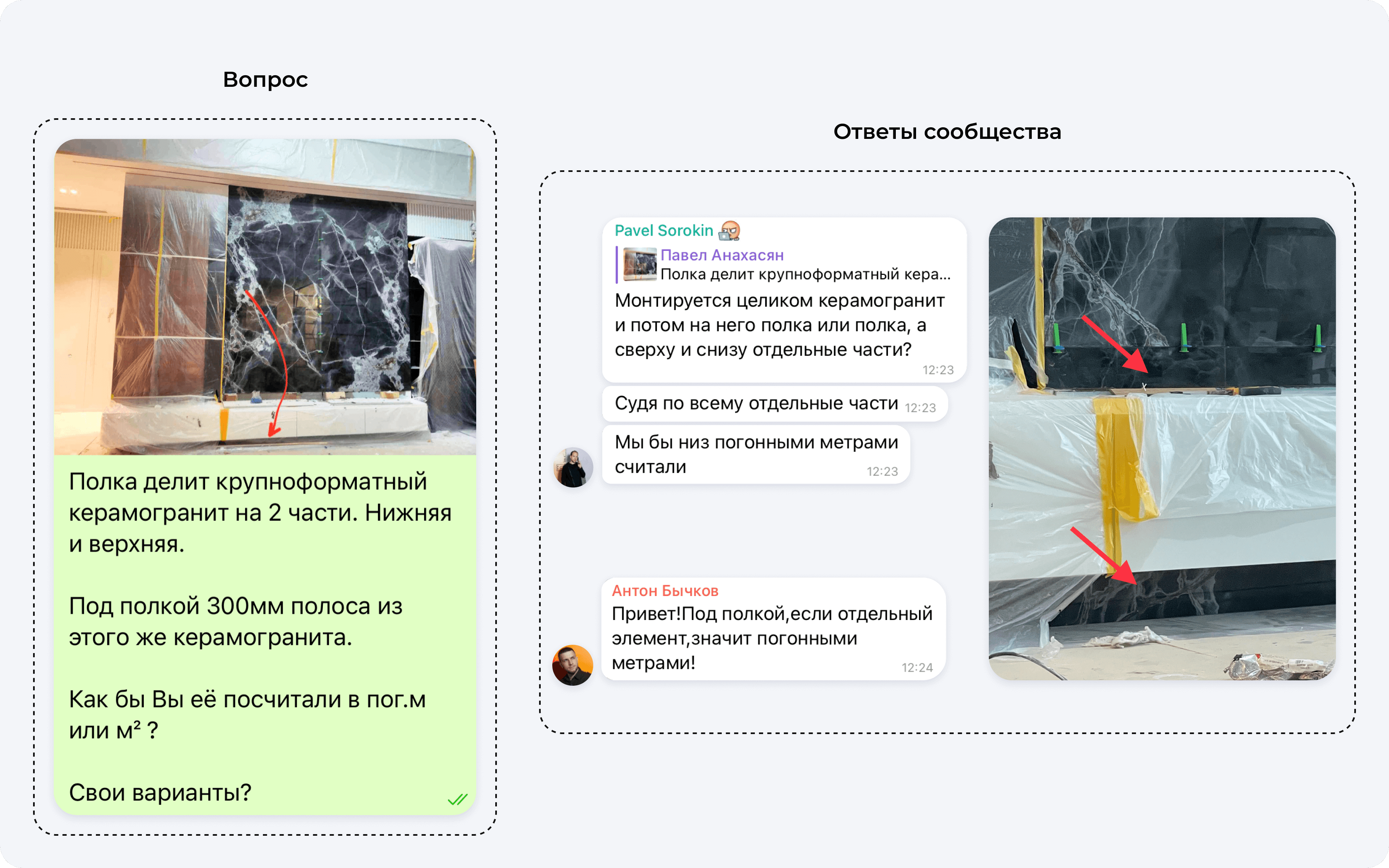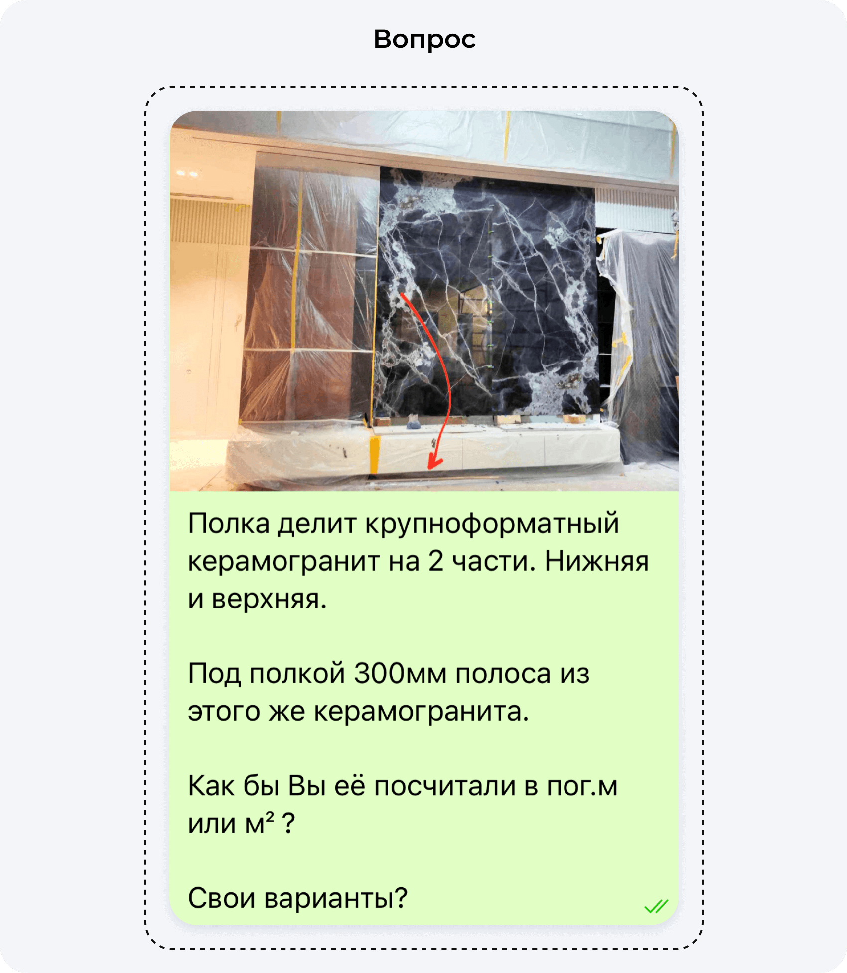 В одном из наших сообществ мы задали мастерам, прорабам и руководителям вопрос «на подумать»: «Как бы вы посчитали стоимость укладки керамогранита на полосу под полкой и над полкой?»