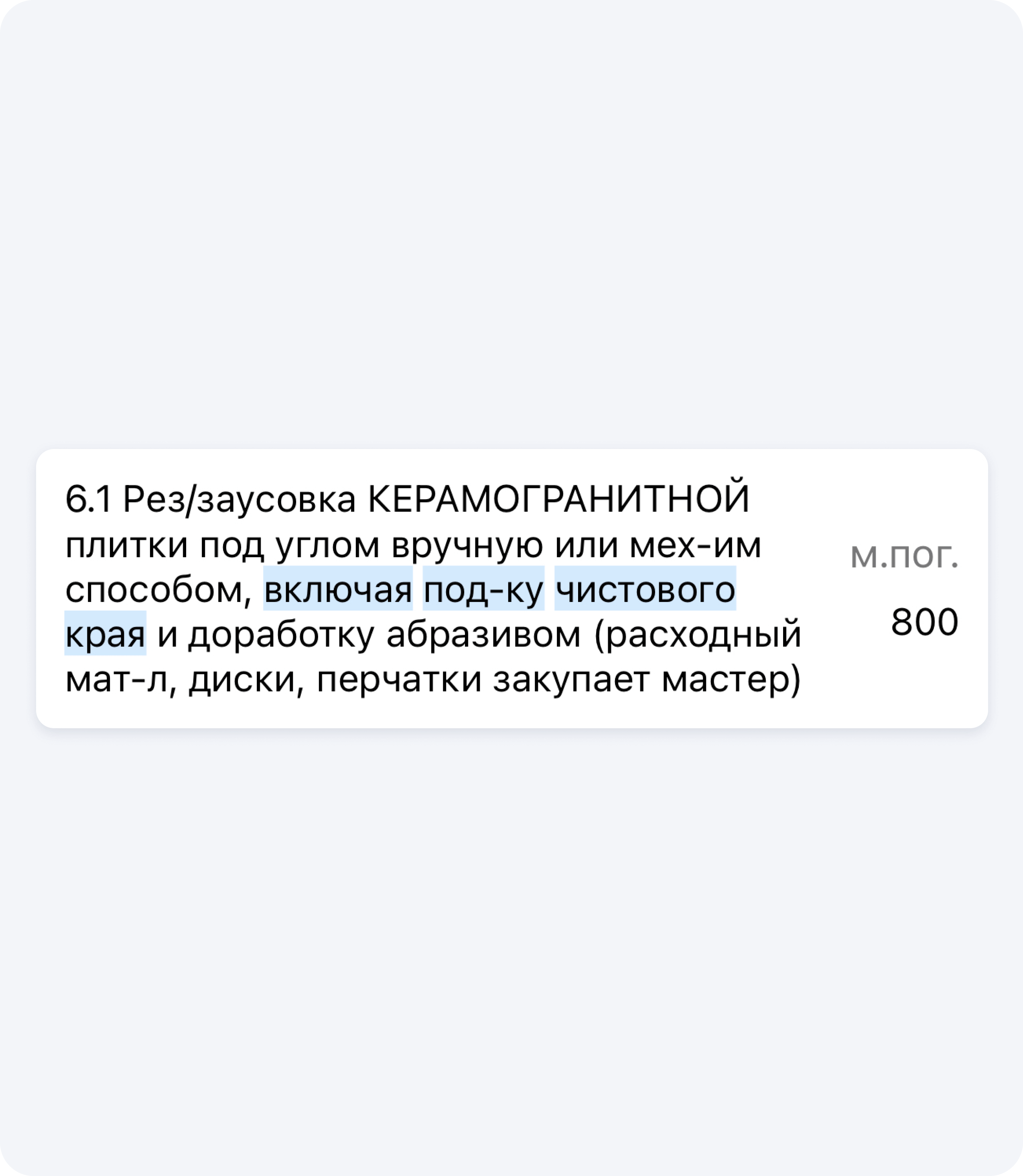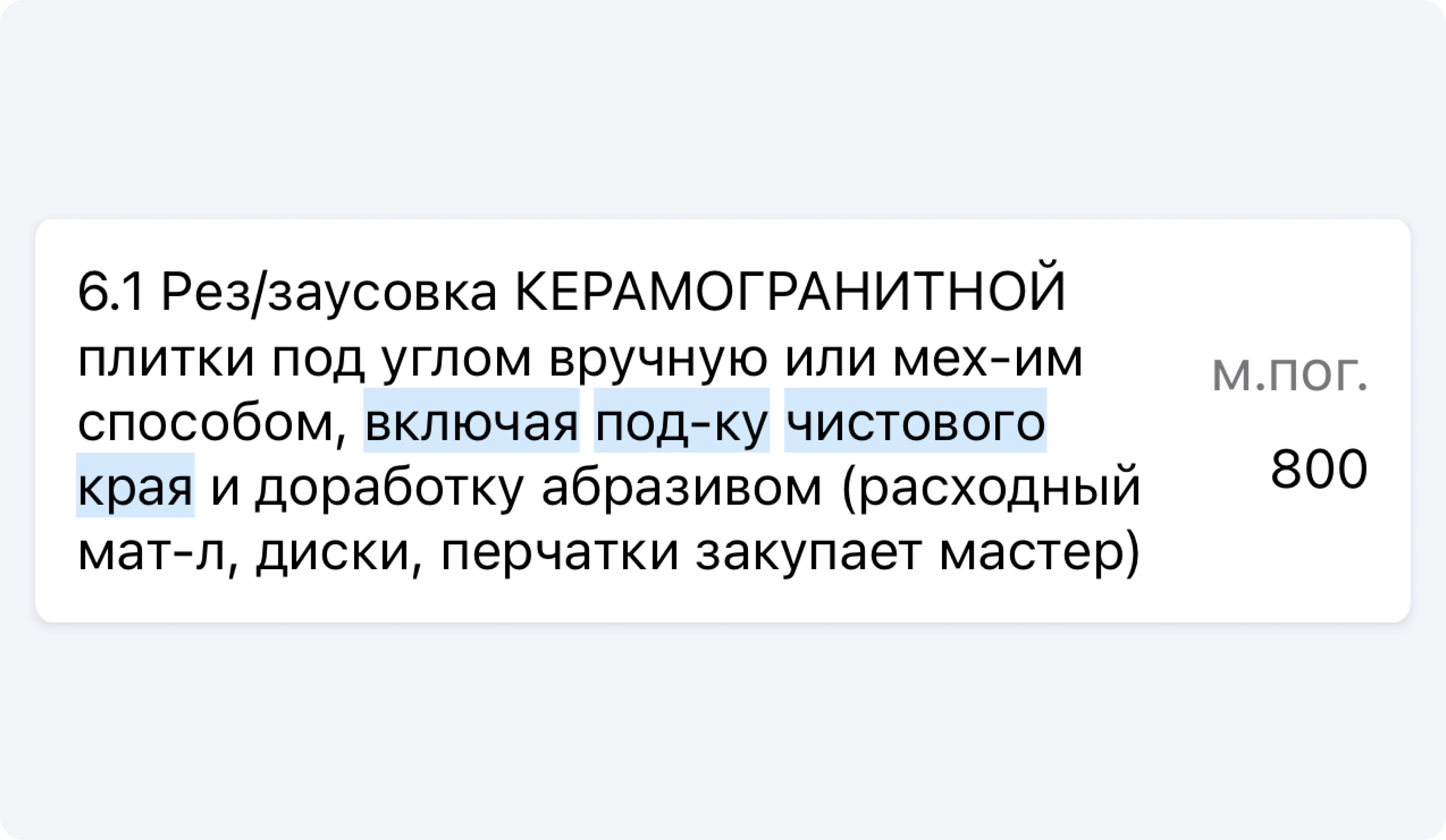 Например, черновой рез плитки. Если вы все ещё считаете его отдельно, то, возможно, оставляете мастерам лишний манёвр для обмана. При заусовке плитки они могут делать черновой рез, даже если он не нужен. Такое часто случается, когда черновой рез идёт отдельным пунктом прайса.