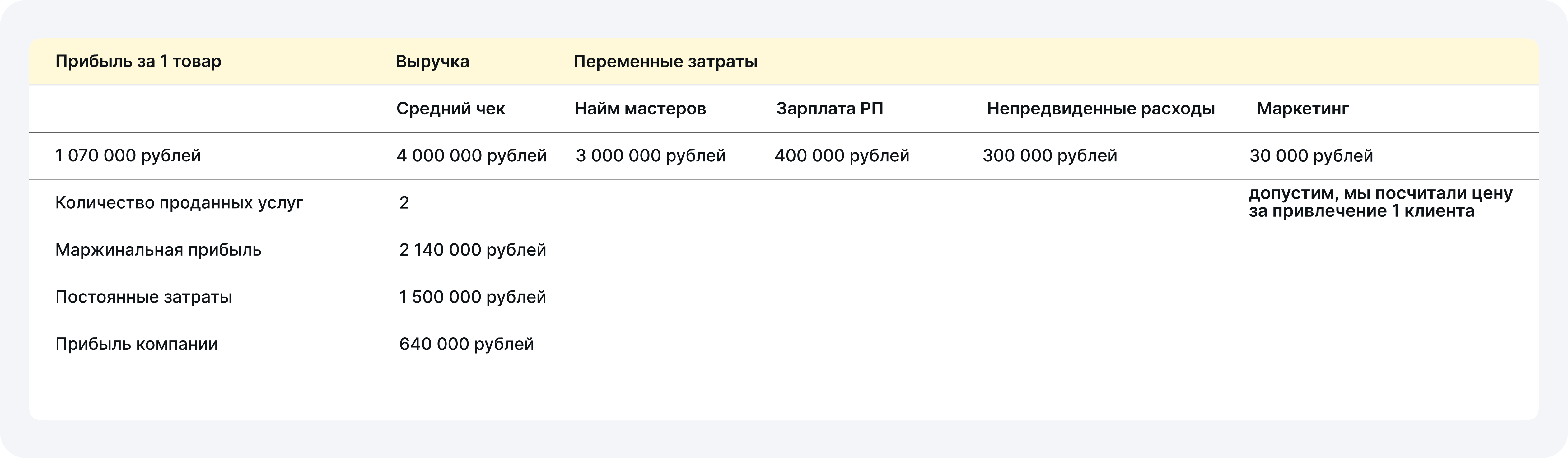 Из этого примера мы видим, что один юнит приносит компании 1 070 000 рублей прибыли. Это неплохое значение, и при 10 проведенных ремонтах за год компания находится в неплохом плюсе, который позволяет ей развиваться, откладывать деньги в резервный фонд и нанимать новых сотрудников. Даже увеличение средств на привлечение клиента не станет трагическим событием при таких цифрах.