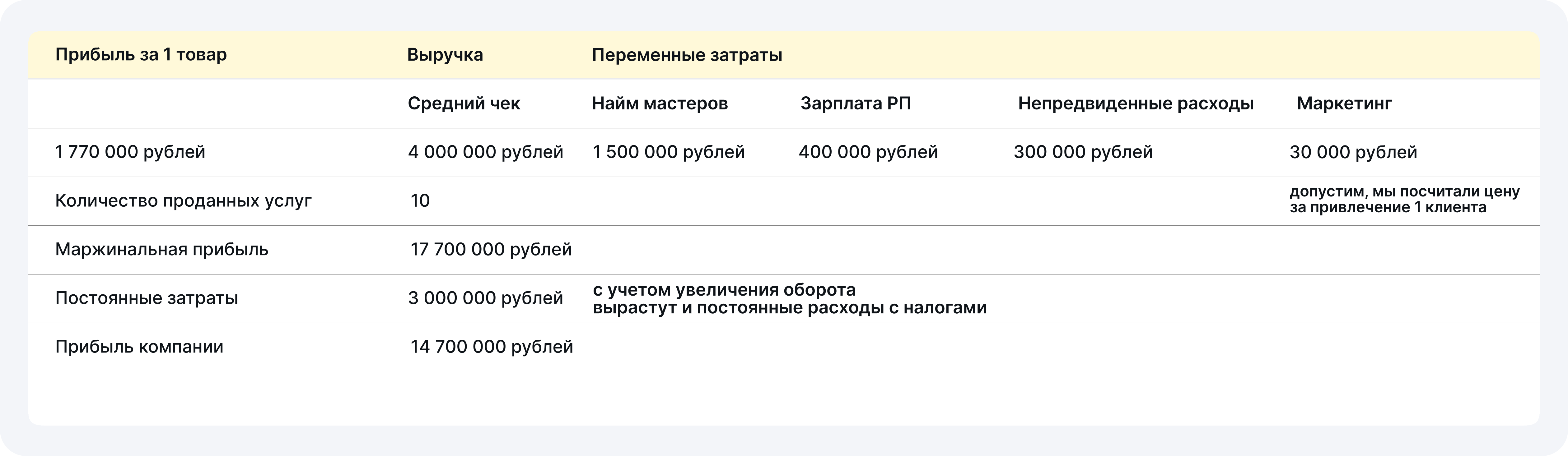Представим расчеты в виде таблицы, где CAC (затраты на привлечение клиента) уже подсчитаны для удобства. Вы можете рассчитать эту метрику по формуле выше. В таблице мы рассчитали прибыль за 1 товар с помощью вычитания переменных затрат из выручки. Маржинальная прибыль были получена через умножение прибыли за один товар на количество проданных услуг. Постоянные затраты взяты как усредненное число, в которое включаются налоги на патенте, аренда офиса и склада.