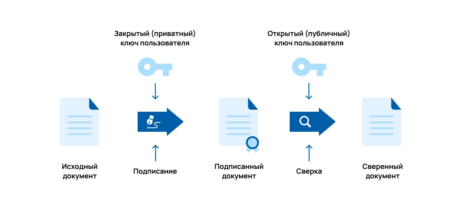Электронная подпись — это процедура шифрования документа, состоящая из открытого ключа (так называемый сертификат, по которому каждый может распознать подпись) и закрытого ключа (он зашифровывает подписанный документ).