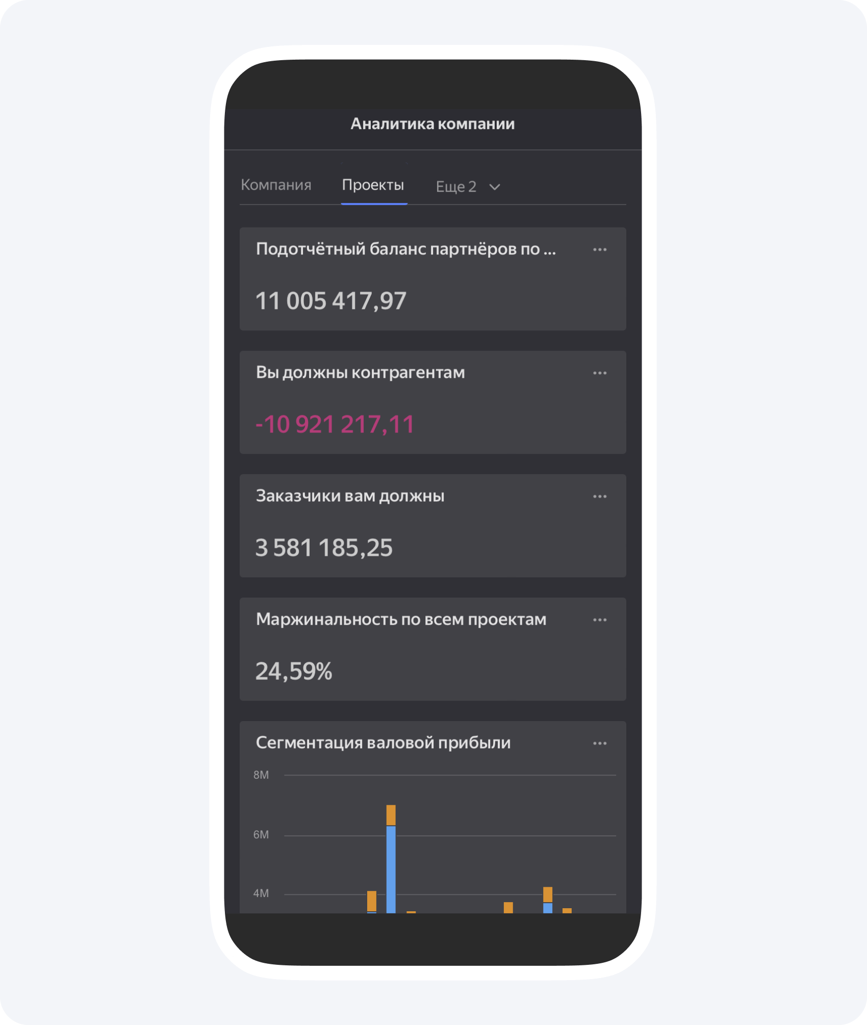 В отслеживании расходов и доходов вашего бизнеса вам поможет тариф PRO+ с обновленной аналитикой. Теперь прямо со смартфона вы сможете наблюдать за ключевыми показателями бизнеса: прибылью, маржинальностью, долгом контрагентам и подотчетным балансом парнеров.