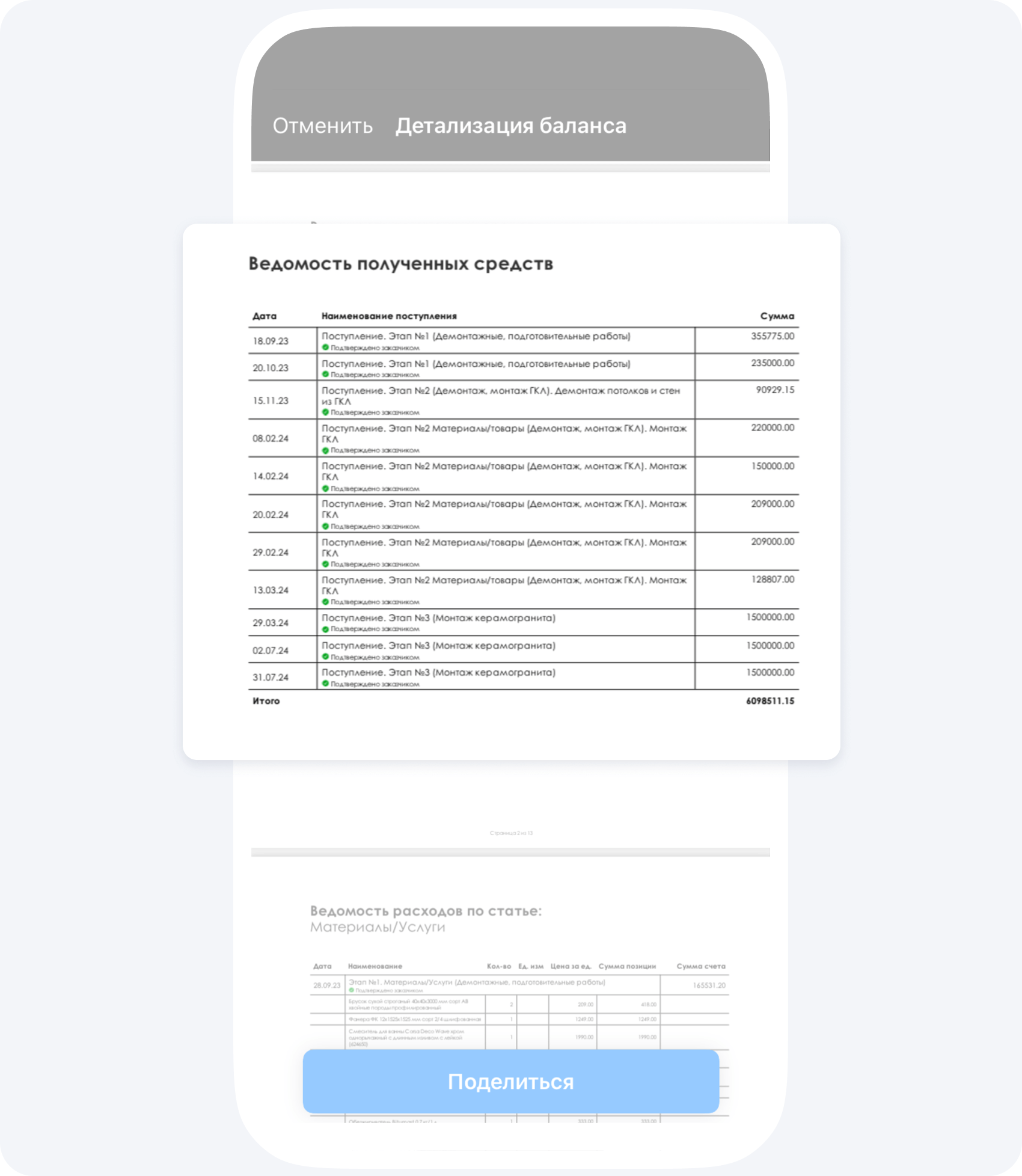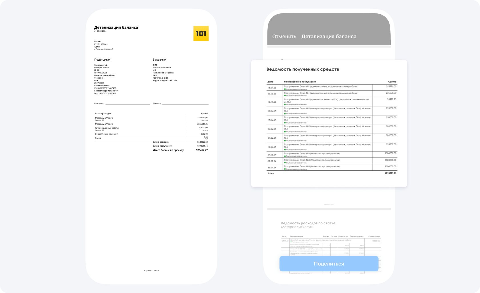 В Приложении 101 фиксируются все зачисления на счет и их траты — на работы и материалы. Через детализацию баланса и руководитель проекта, и заказчик могут узнать, на что именно были потрачены деньги.