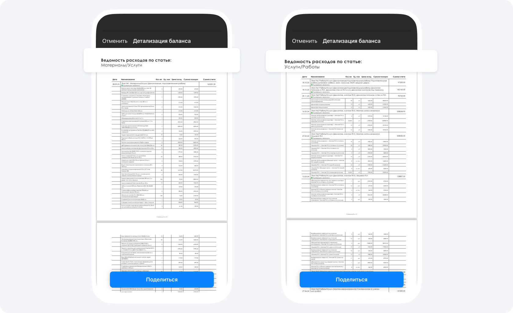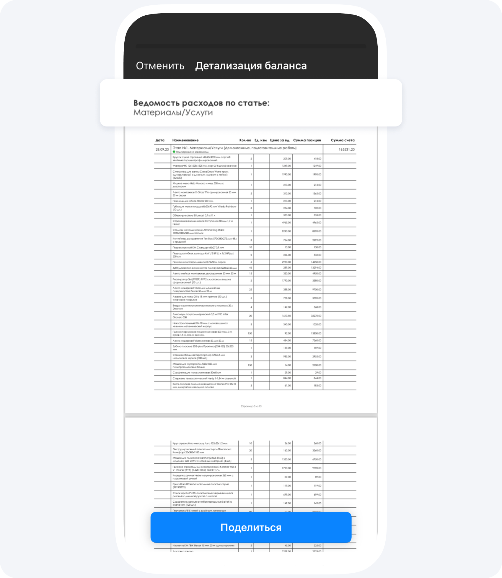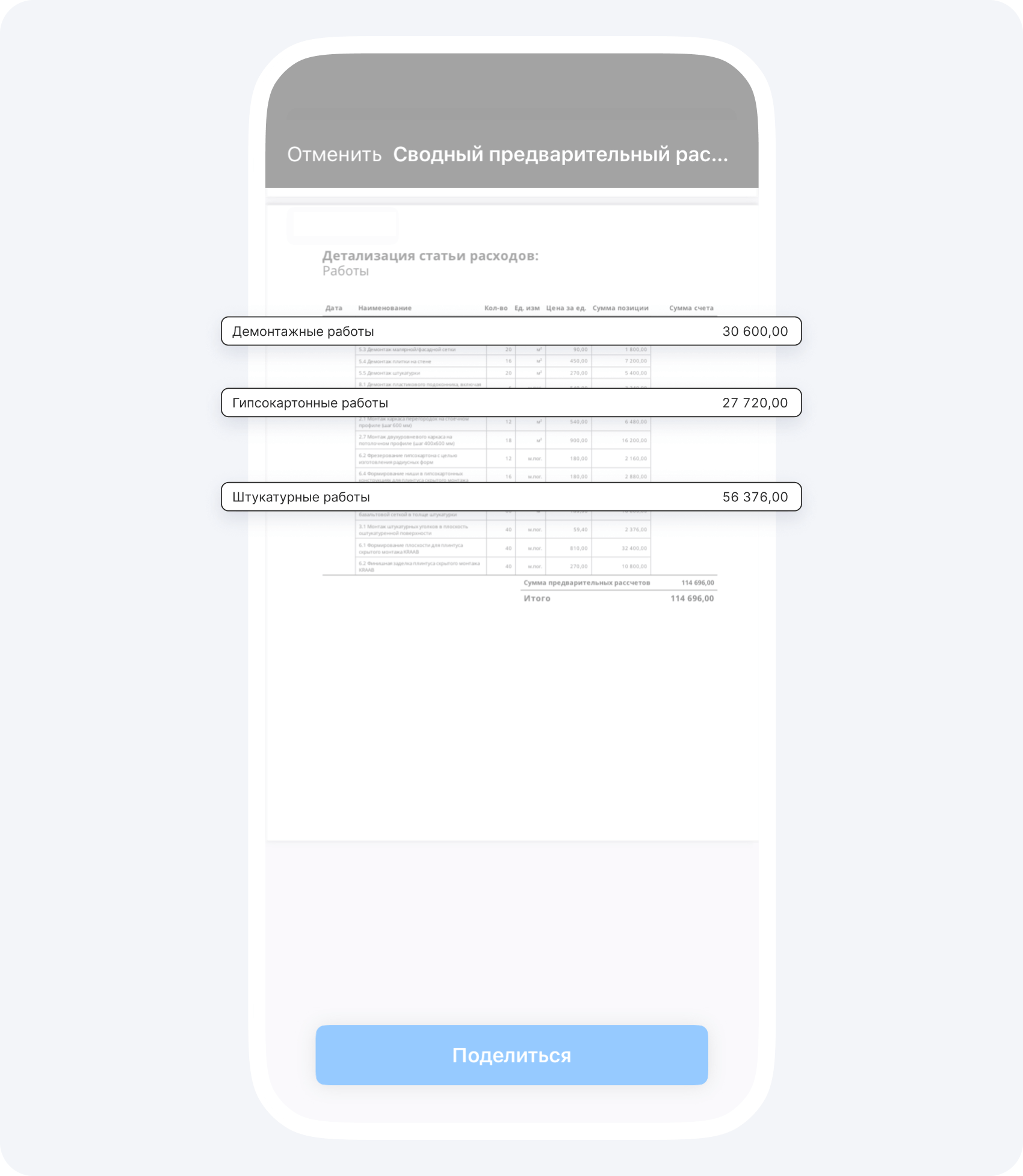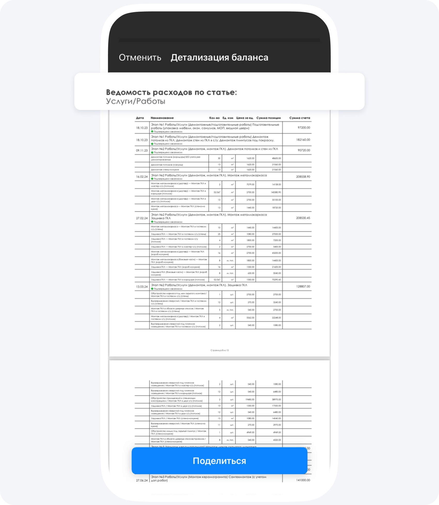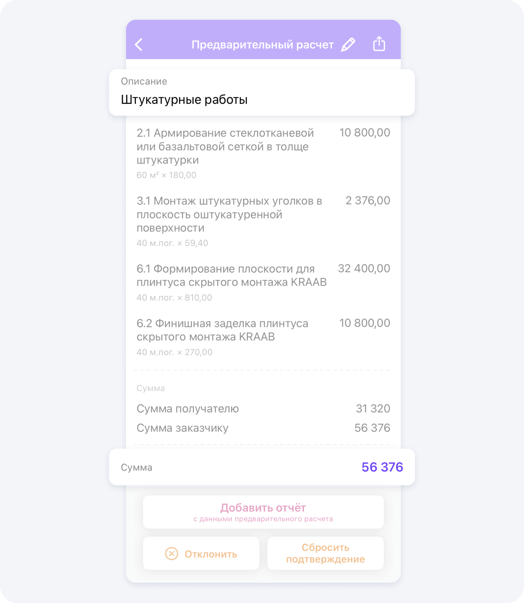 С помощью распределения ролей каждый маляр, плиточник или гипсокартонщик в вашей команде может отчитаться о выполнении работ с помощью простых команд в приложении, а вы просто соедините их в один документ. При этом, расходы будут отображены не просто в виде списка, а по статьям и с итоговыми суммами.