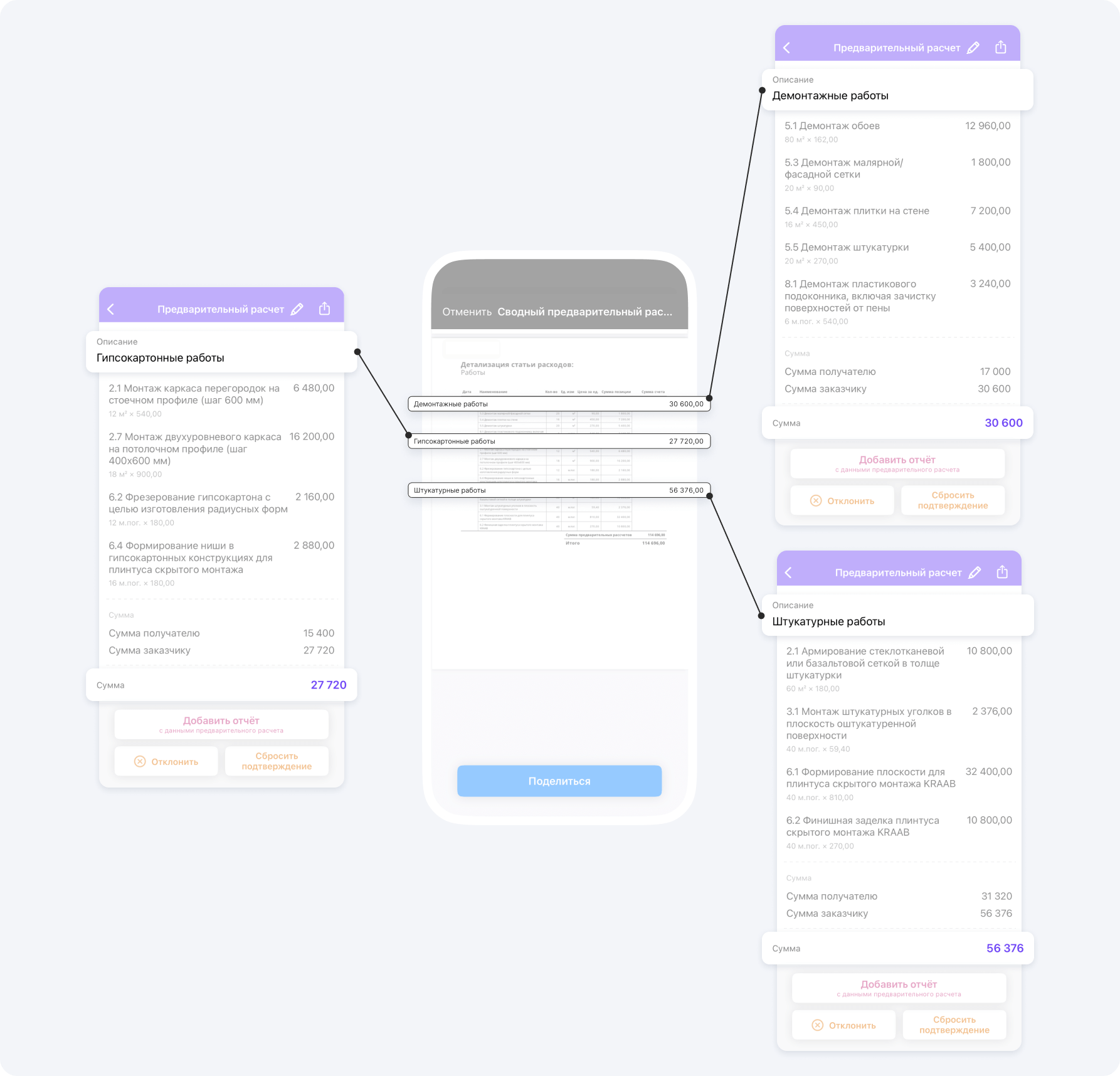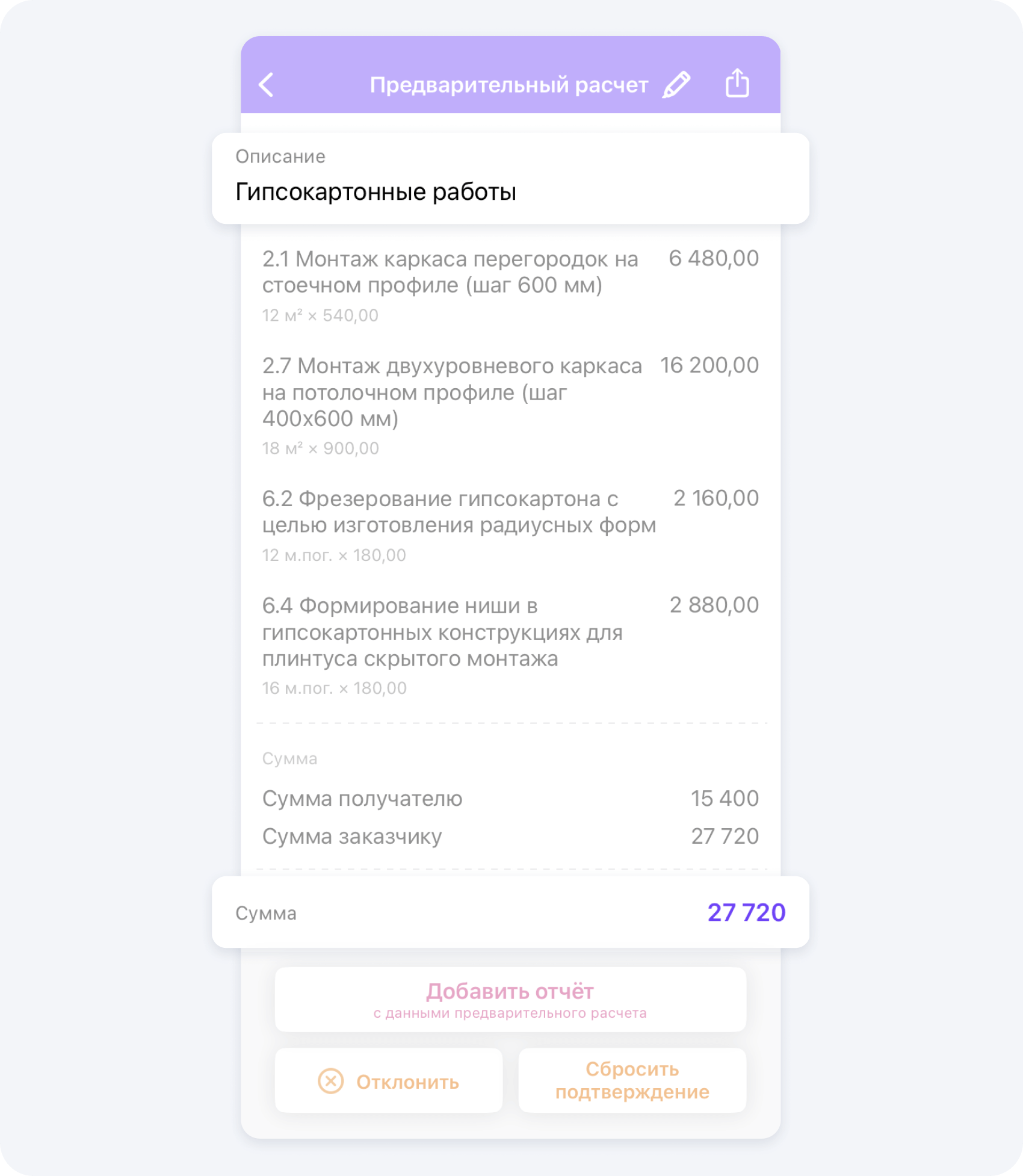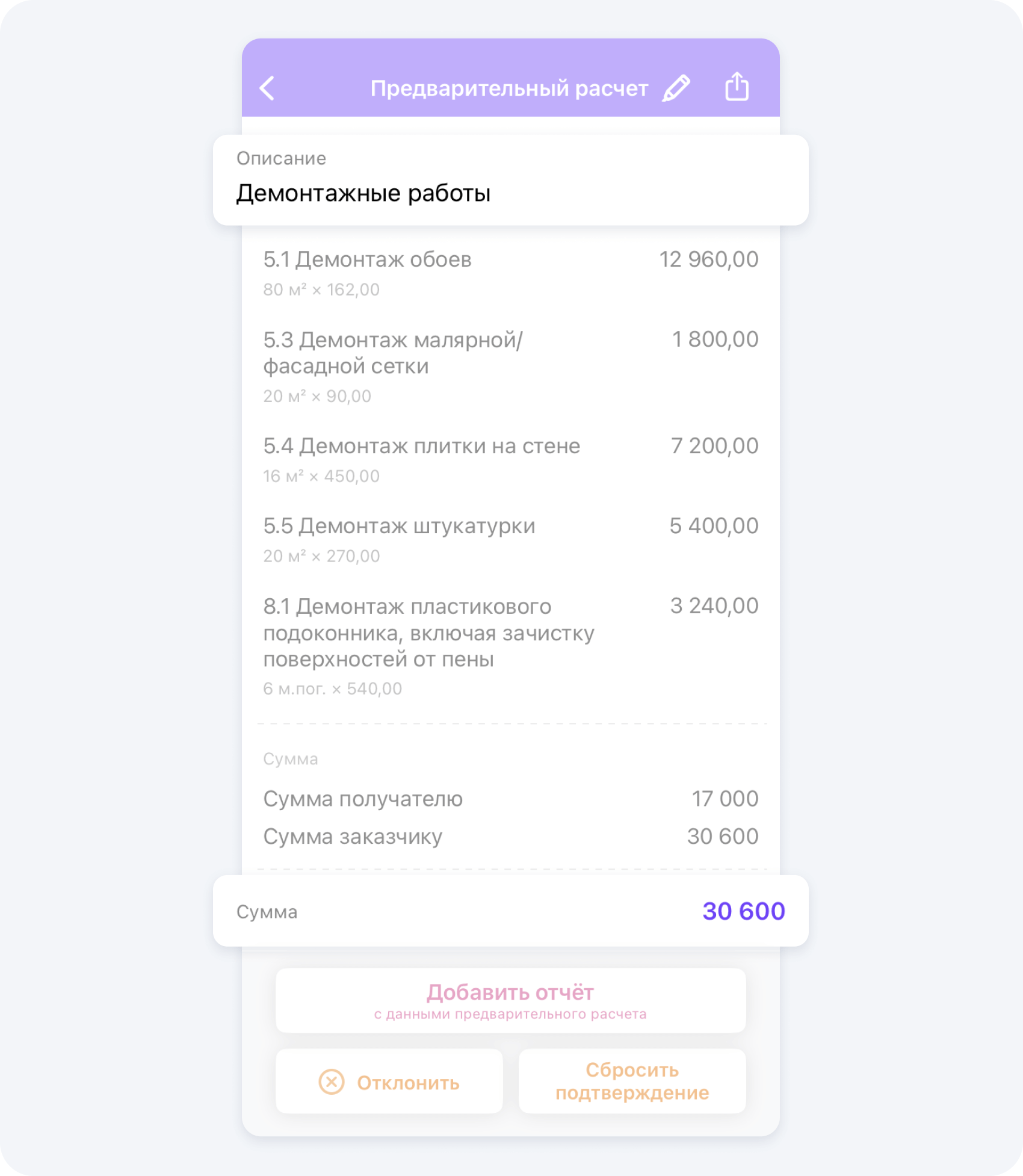 - Заказчик получает подробную смету, составленную на основе данных от узких специалистов, которые оценили объем работ на его объекте и назвали свои цены на них.