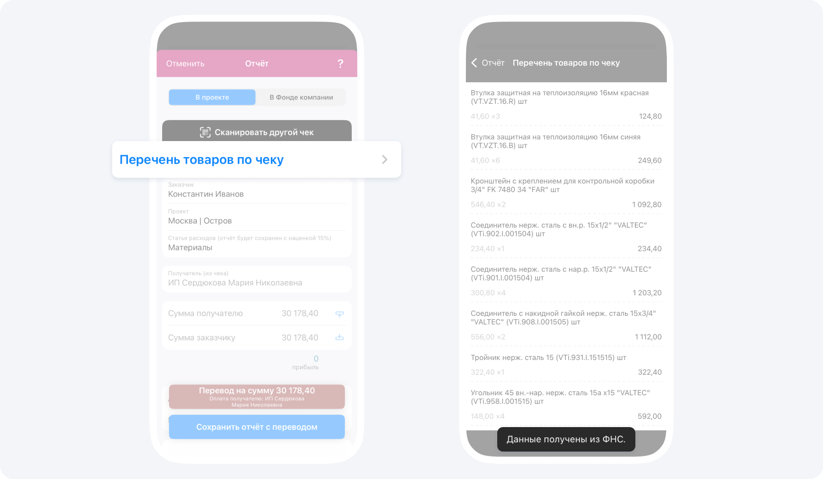 Сравните вымученную (иначе не сказать) таблицу с закупками и быстрое добавление чека по QR-коду. Когда вы сканируете код с чека в Приложении 101, туда автоматически подгружается список покупок! Больше не нужно искать чеки по разным чатам или хранить их в карманах, чтобы отчитаться перед заказчиком. У чеков есть нехорошее свойство теряться.