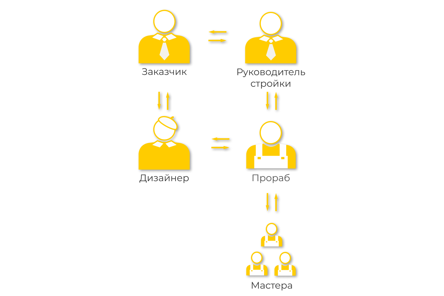 К каждому из участников проекта прораб должен найти подход, чтобы получить результат, наилучший из возможных. Например, вместе с руководителем строительства (РС) прораб решает все глобальные вопросы по ходу ремонта/стройки. А он в свою очередь решает с клиентом все финансовые вопросы и обсуждает какие-либо изменения в проекта. Все непредвиденные обстоятельства, сложности и задержки РП и РС обсуждает вместе.