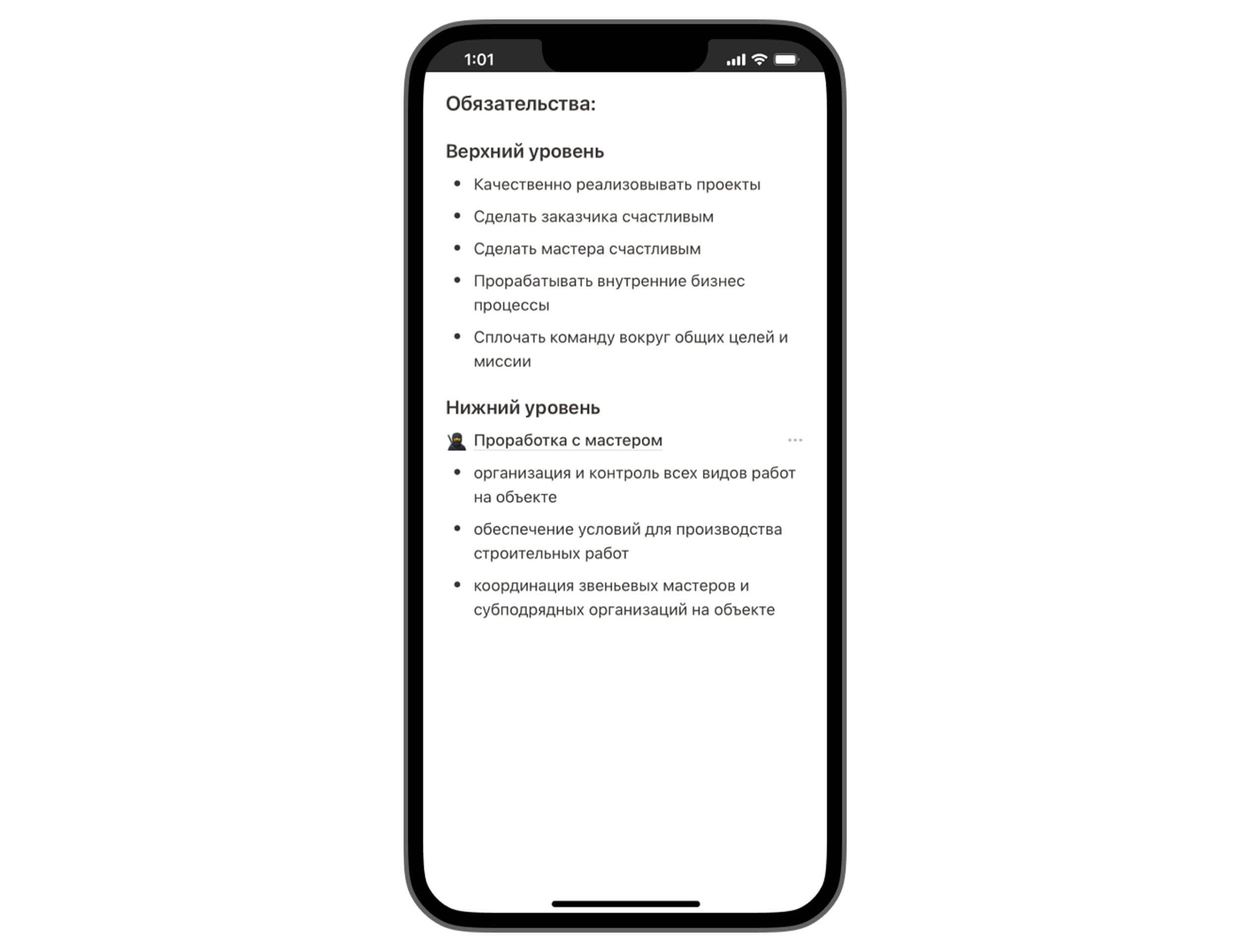 Список обязательств для руководителя проекта — довольно длинный, в нём учли все важные моменты работы. Как вы видите, на первых местах стоит качество + счастье заказчика и мастера. Это взаимозависимые понятия, поэтому качественная должностная инструкция прораба включает их в себя.