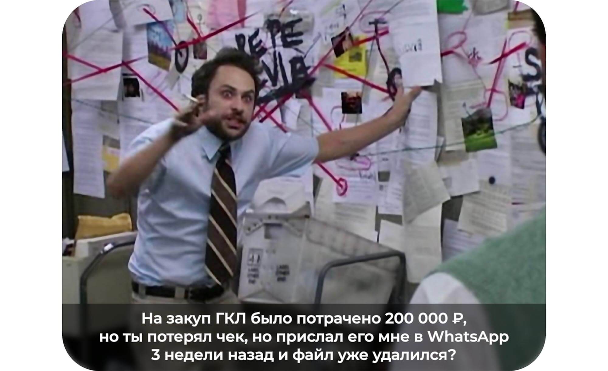 А это очень сложно! Часто сотрудники приносят отчеты в разном формате, с разными ценами, неупорядоченной разбивкой по работам — что-то на бумаге, что-то в WhatsApp, что-то вообще на кусочке ГКЛ или в голосовом сообщении.