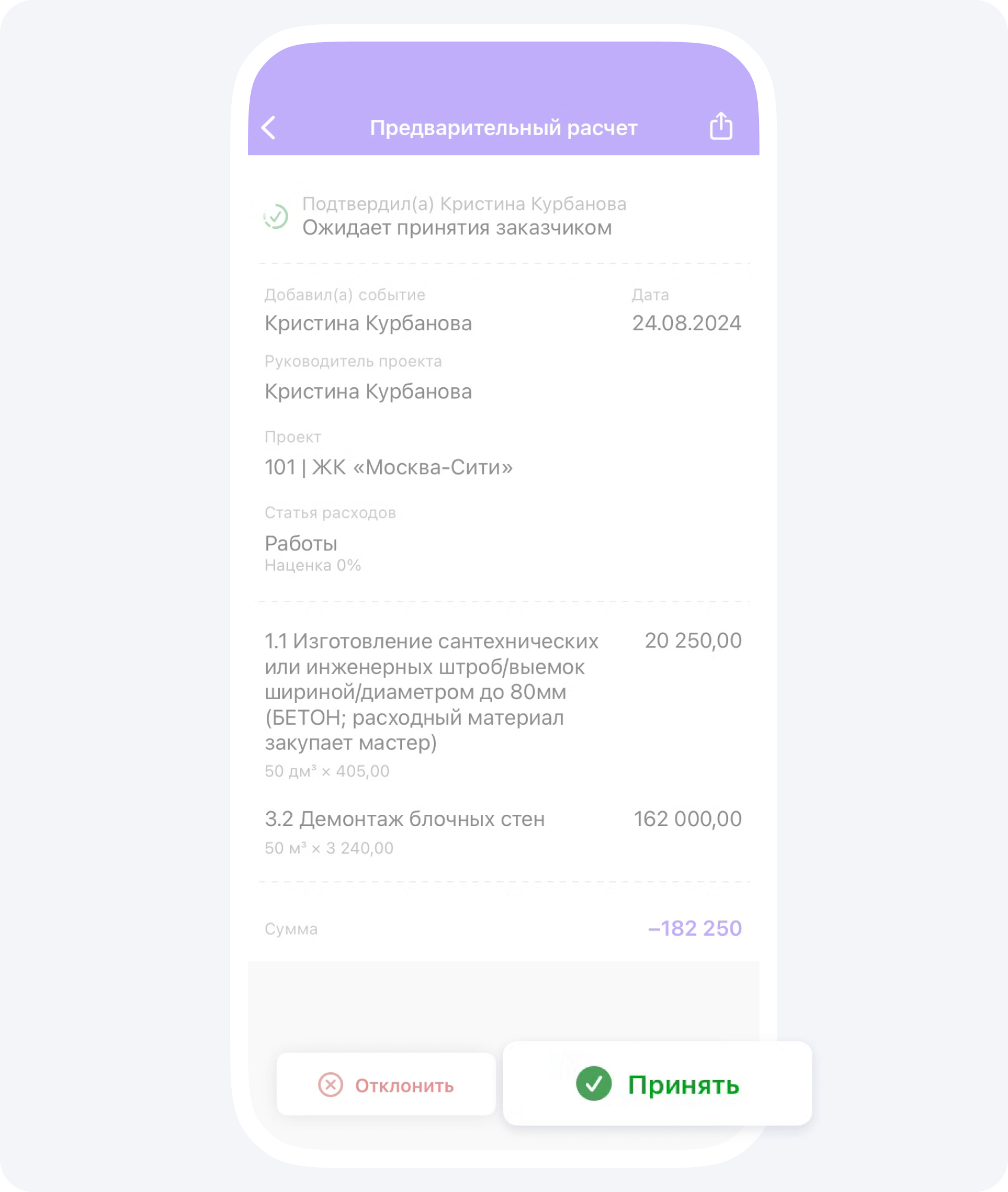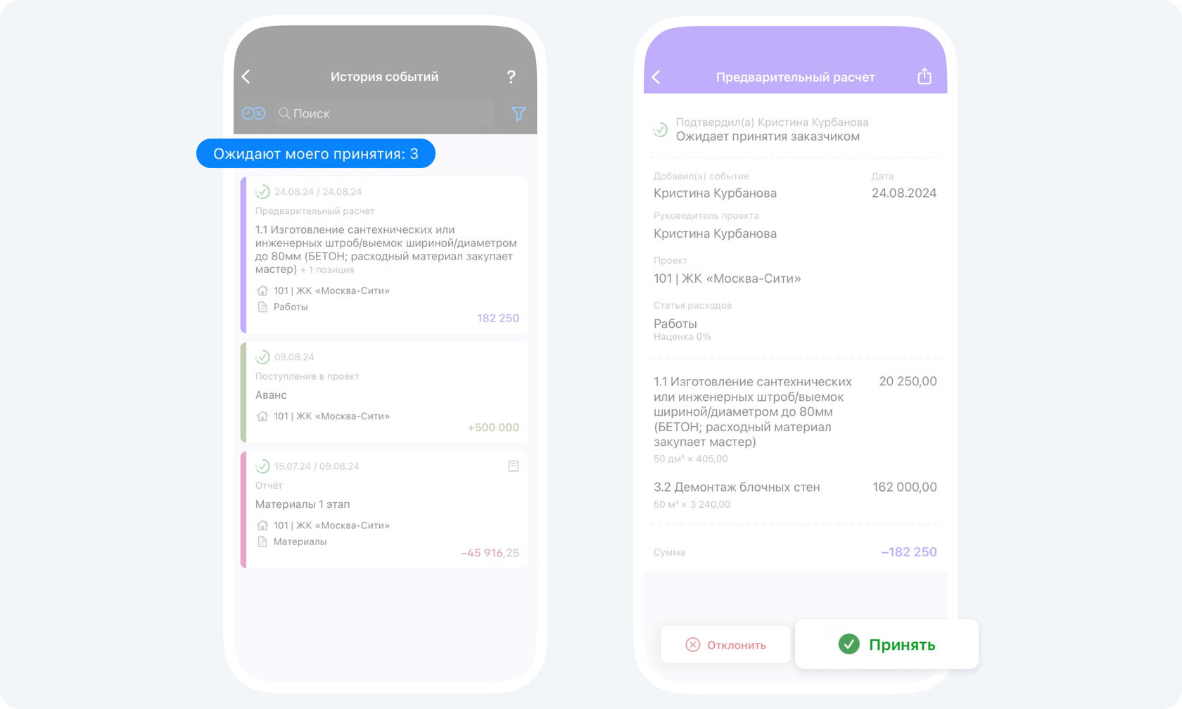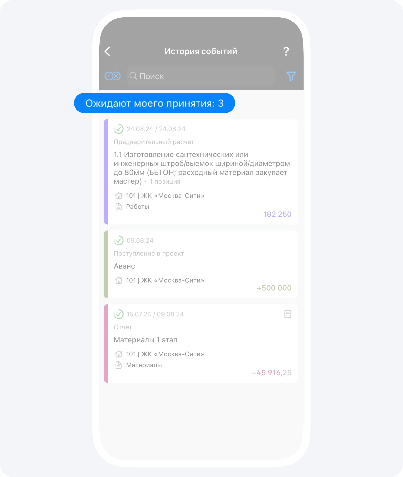 Важно своевременно подтверждать (или отклонять) события в приложении. Когда подрядчик загружает какой-либо отчет, заказчик получает push-уведомление.