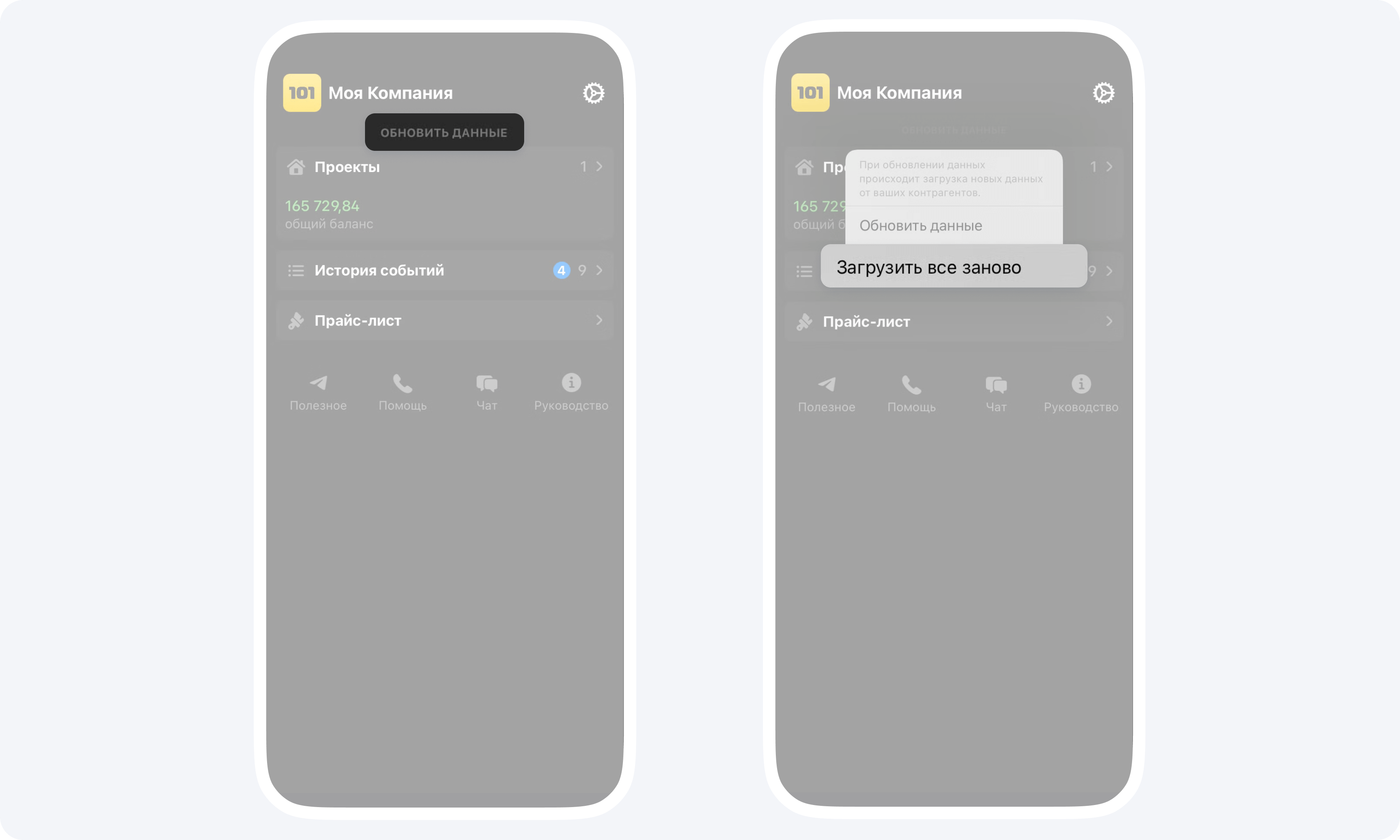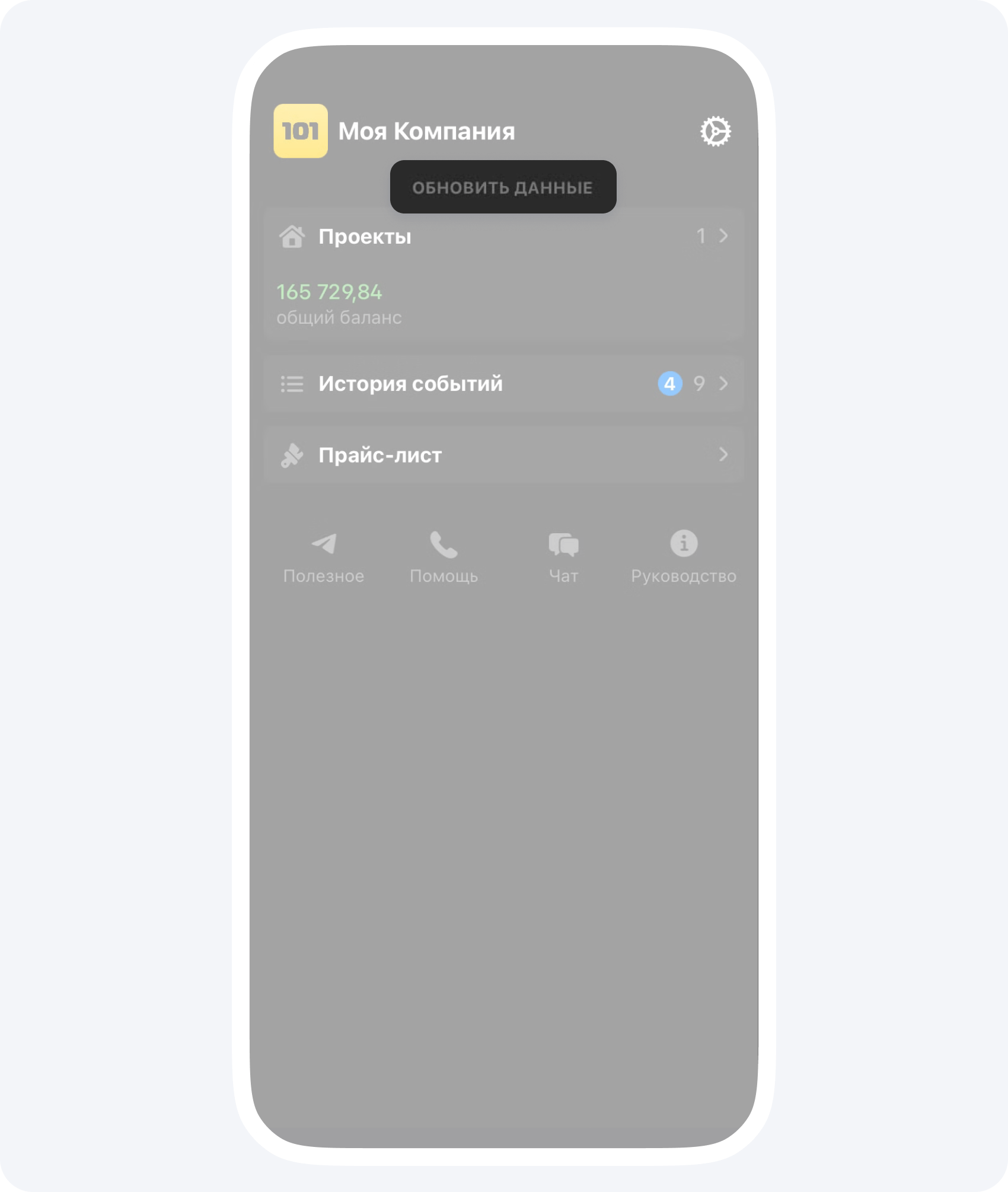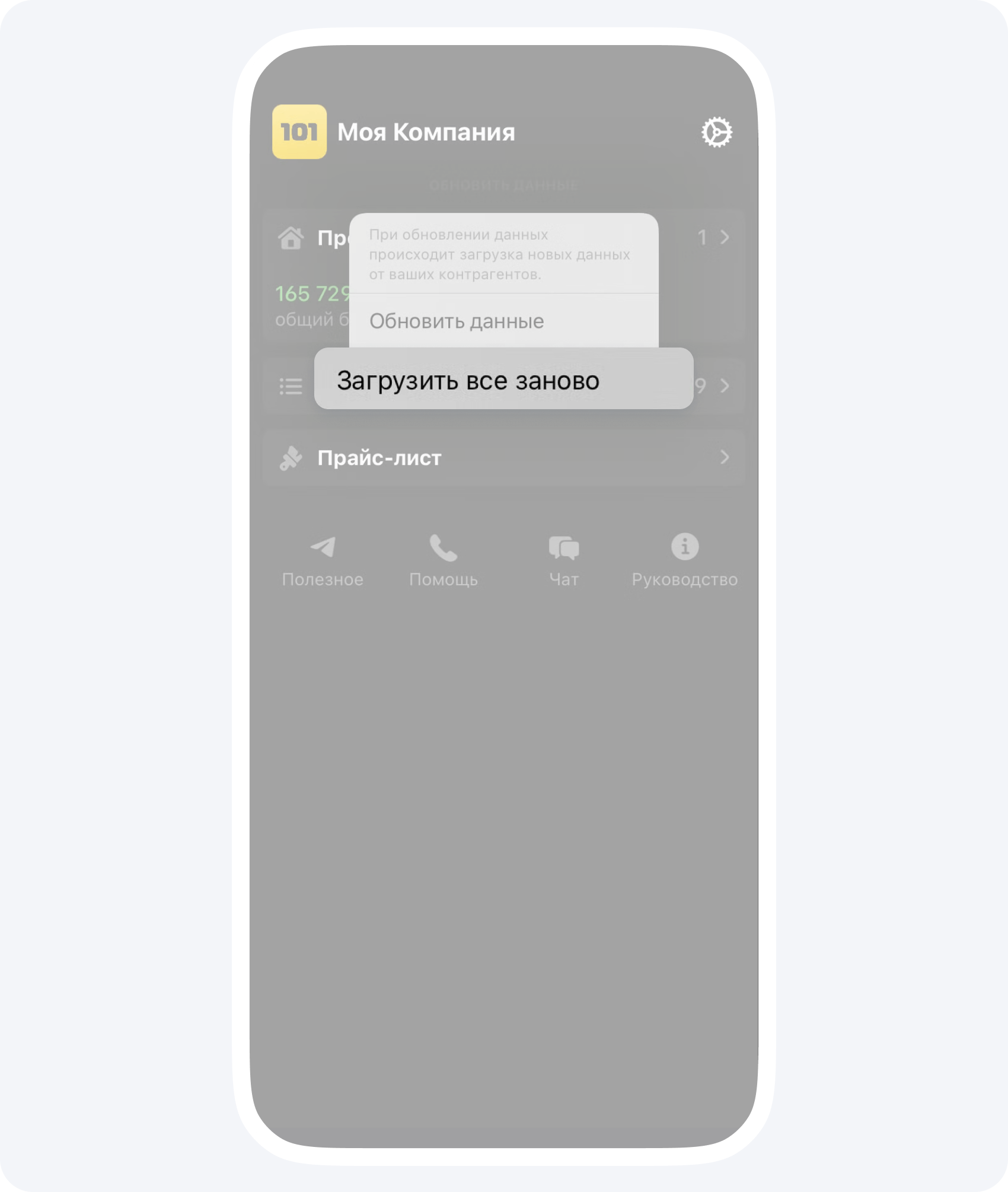 - На главном экране зайдите в Настройки и нажмите кнопку Обновить все данные