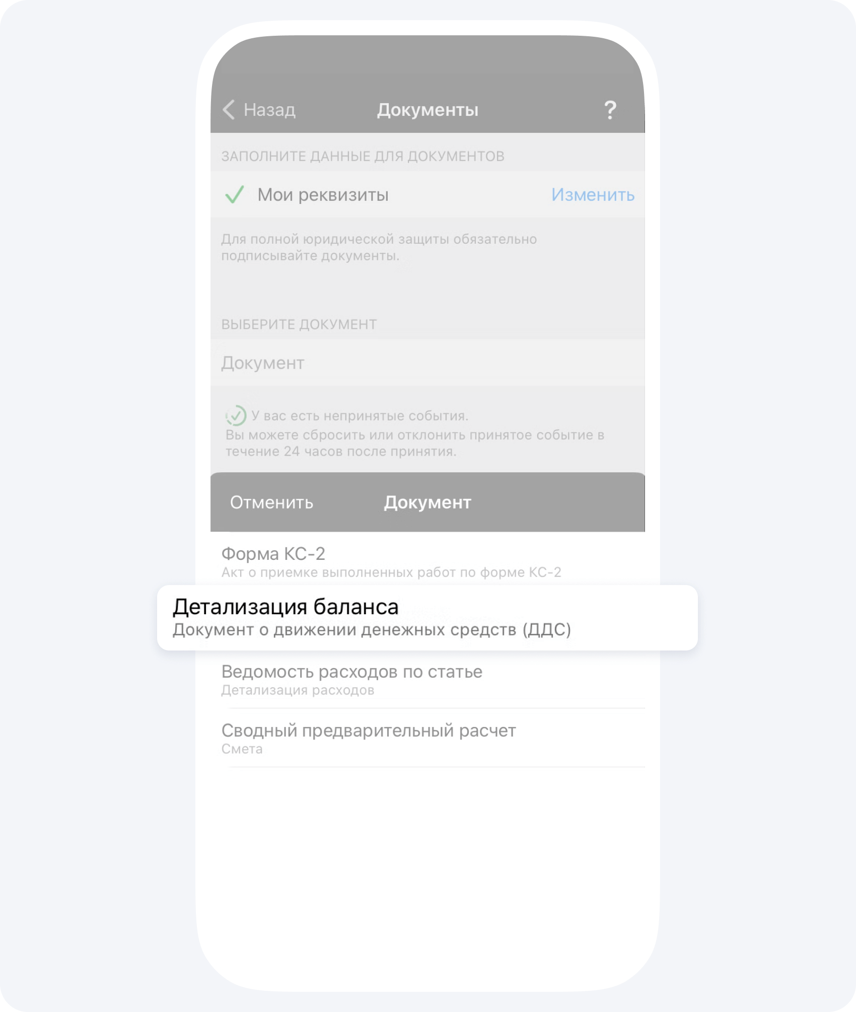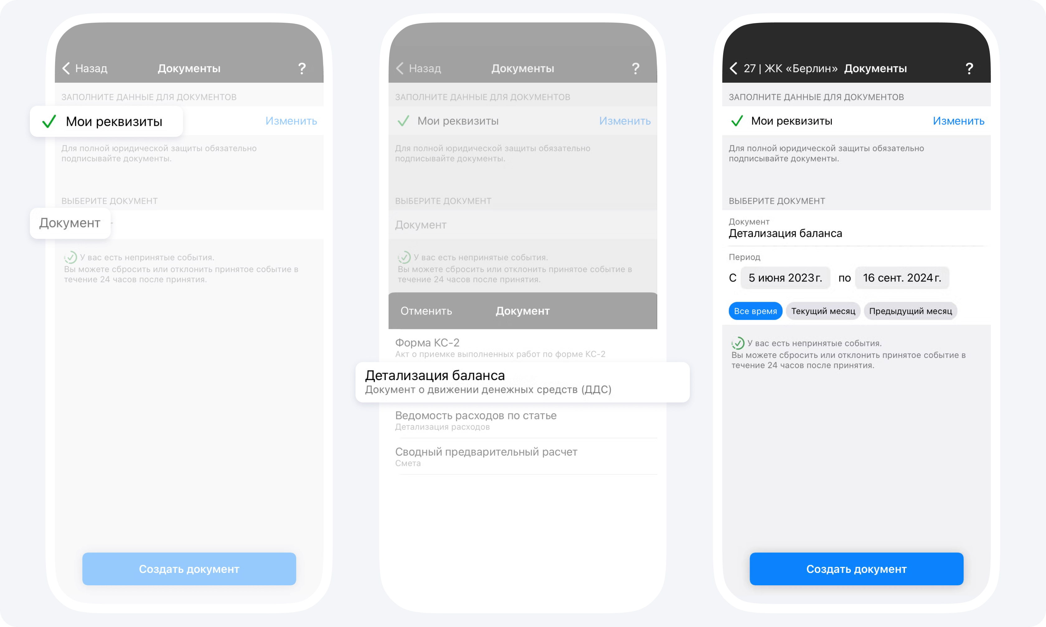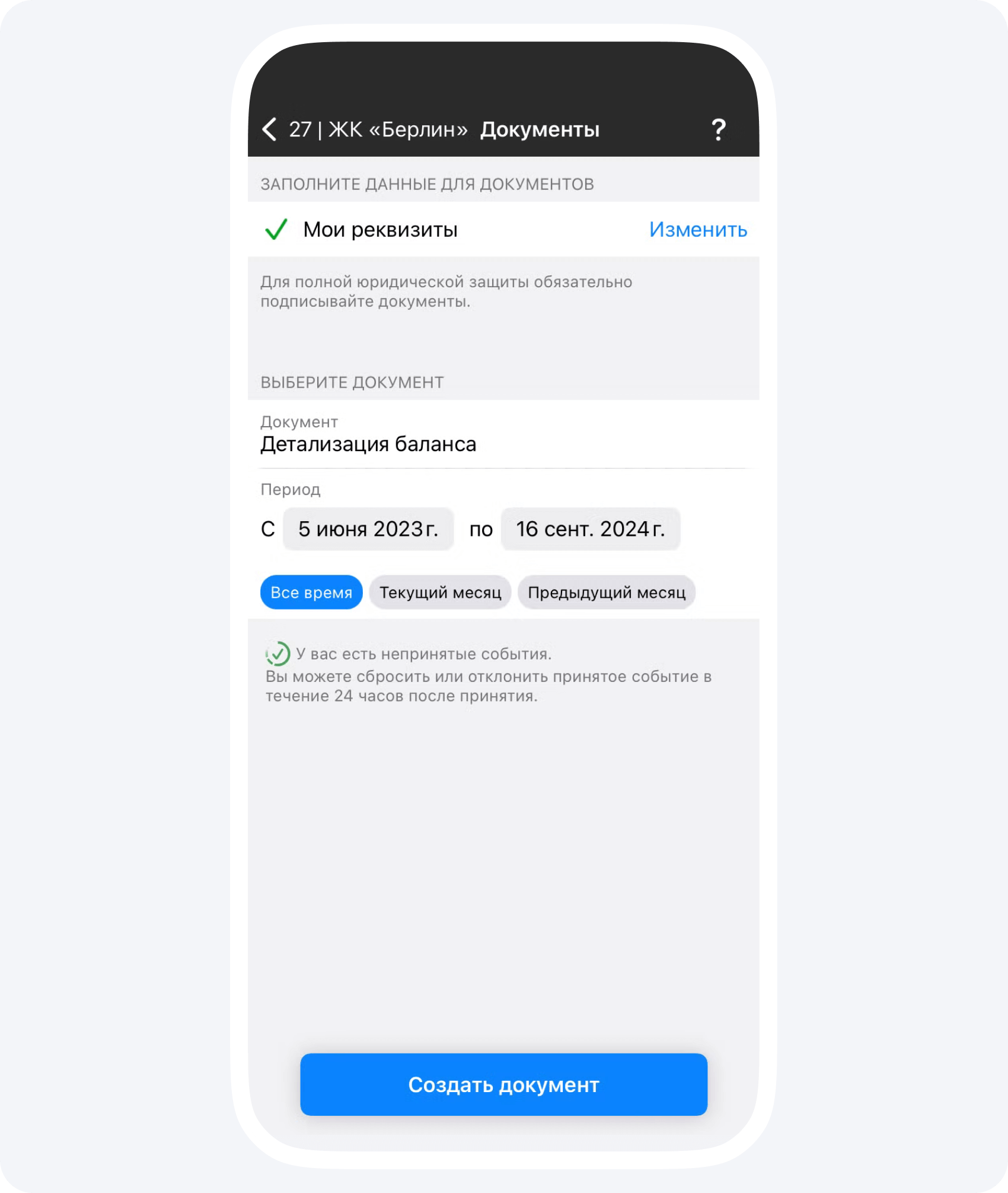 - Нажмите в поле Документ и выберите Детализация баланса. Вы можете сформировать отчёт за все время либо выбрать конкретный период. Далее нажмите Создать документ
