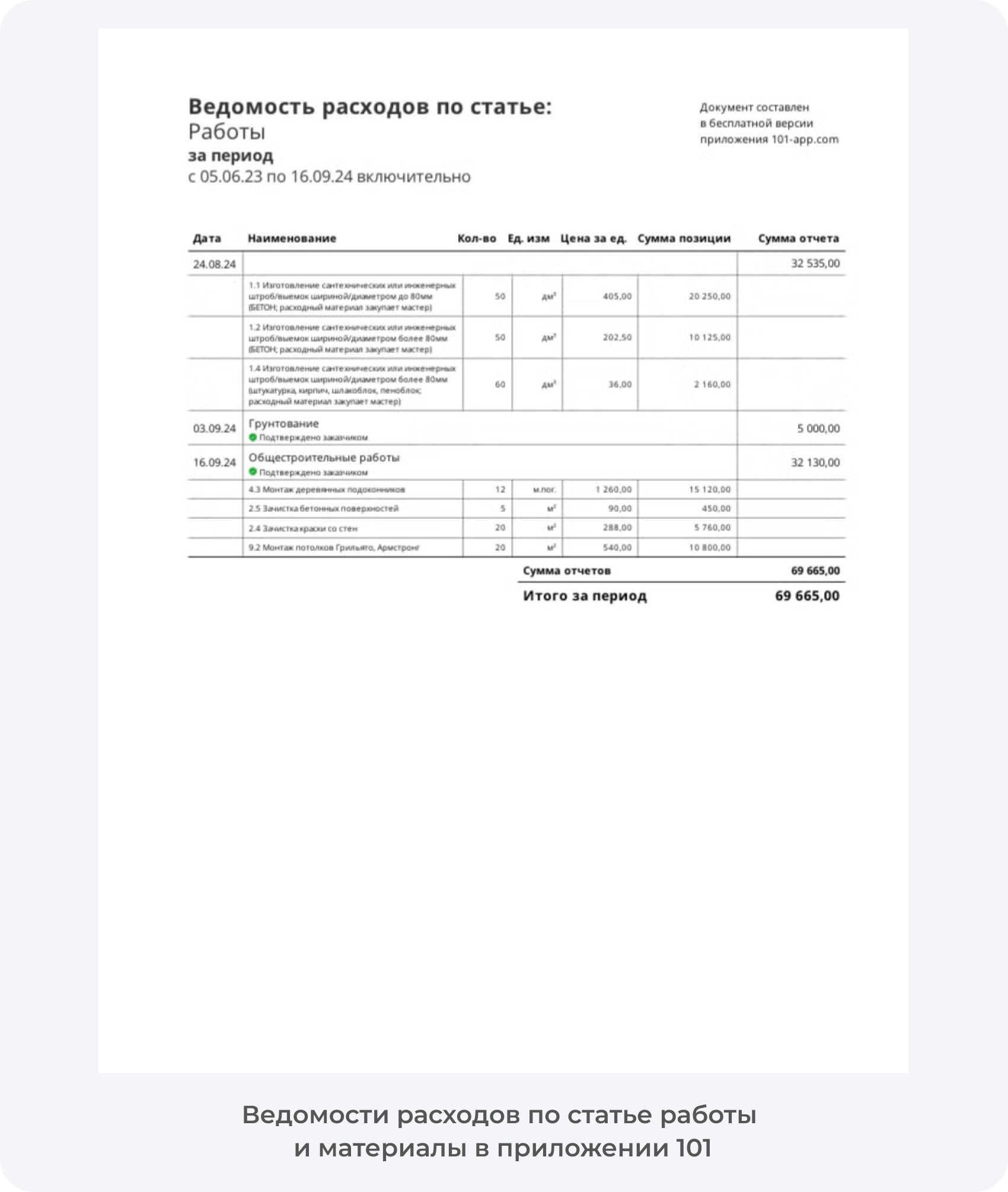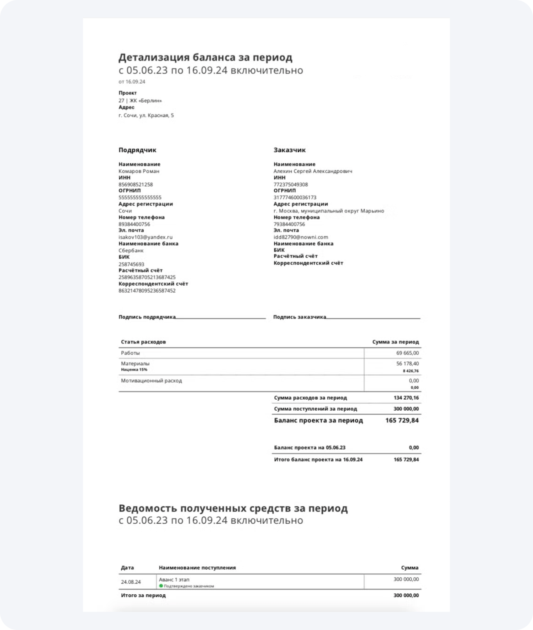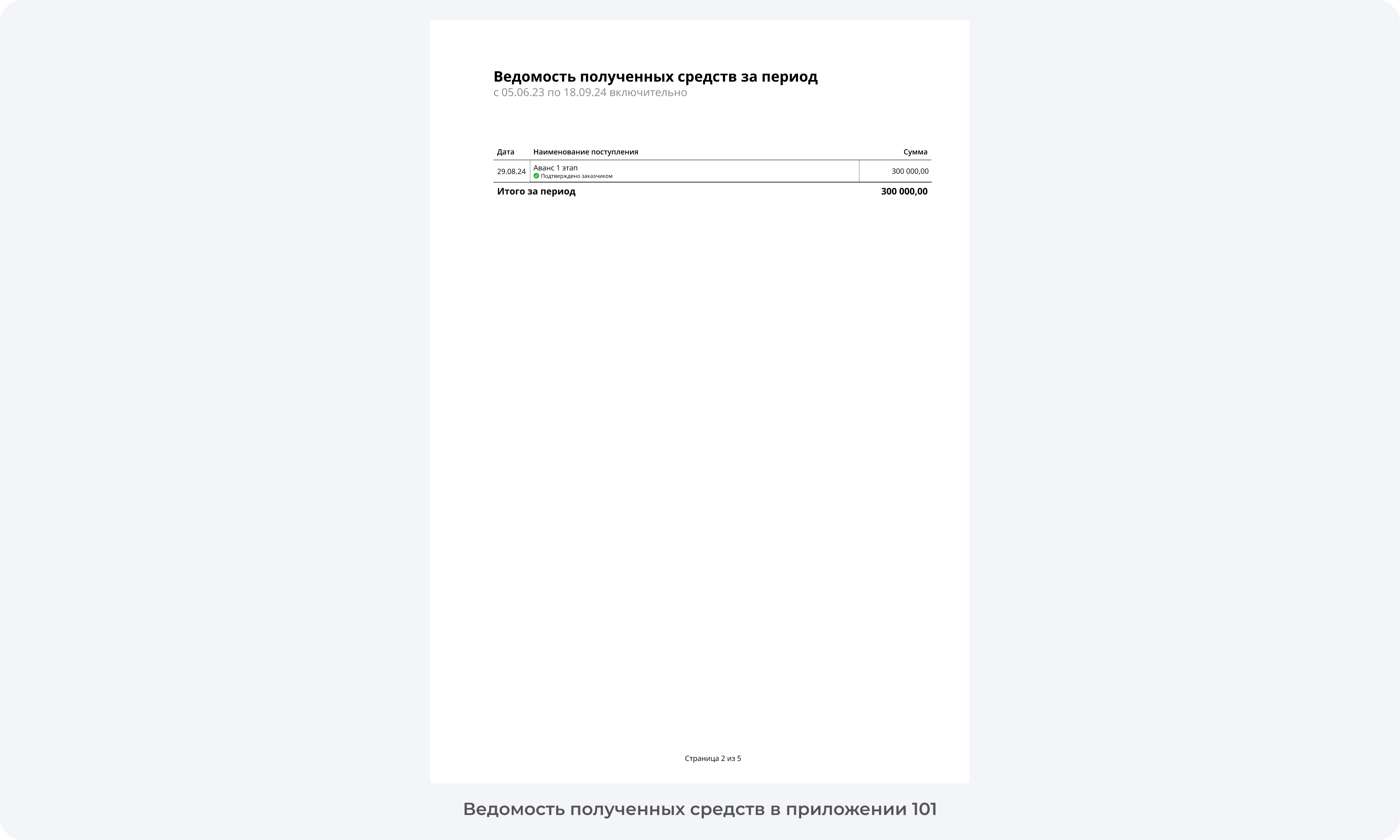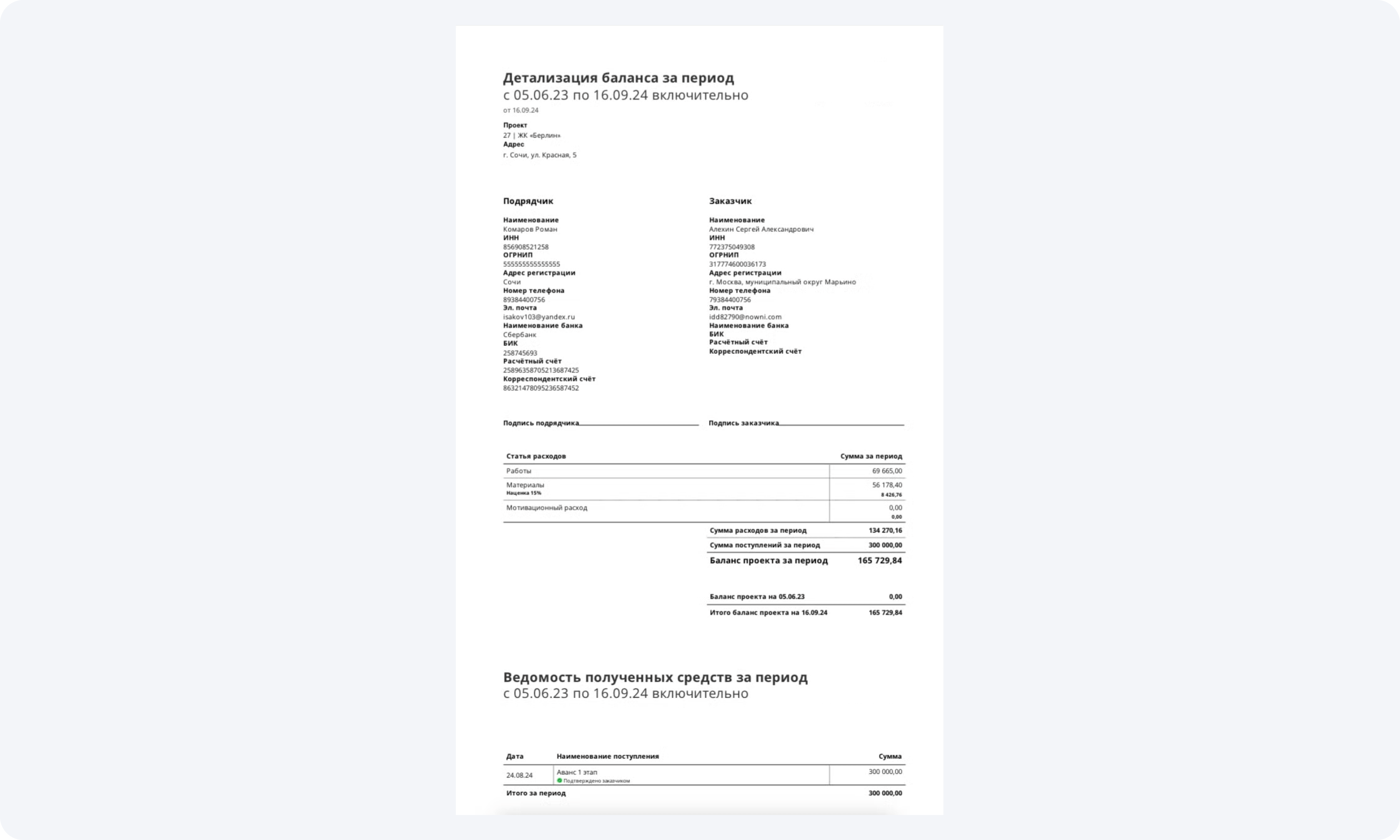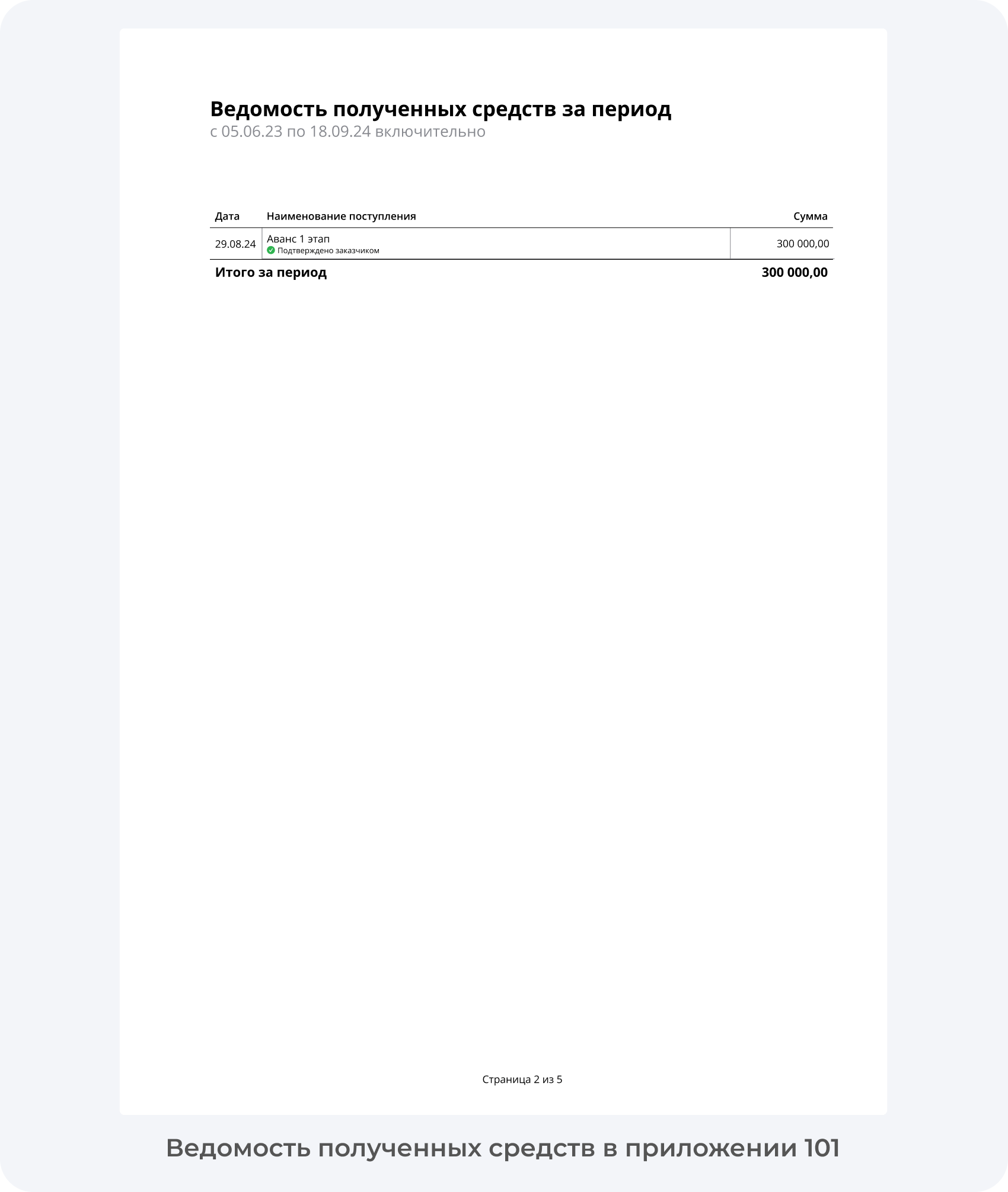 2. Второй лист отчёта — ведомость полученных средств, вы можете сверить сколько денежных средств вы передали на реализацию объекта подрядчику.