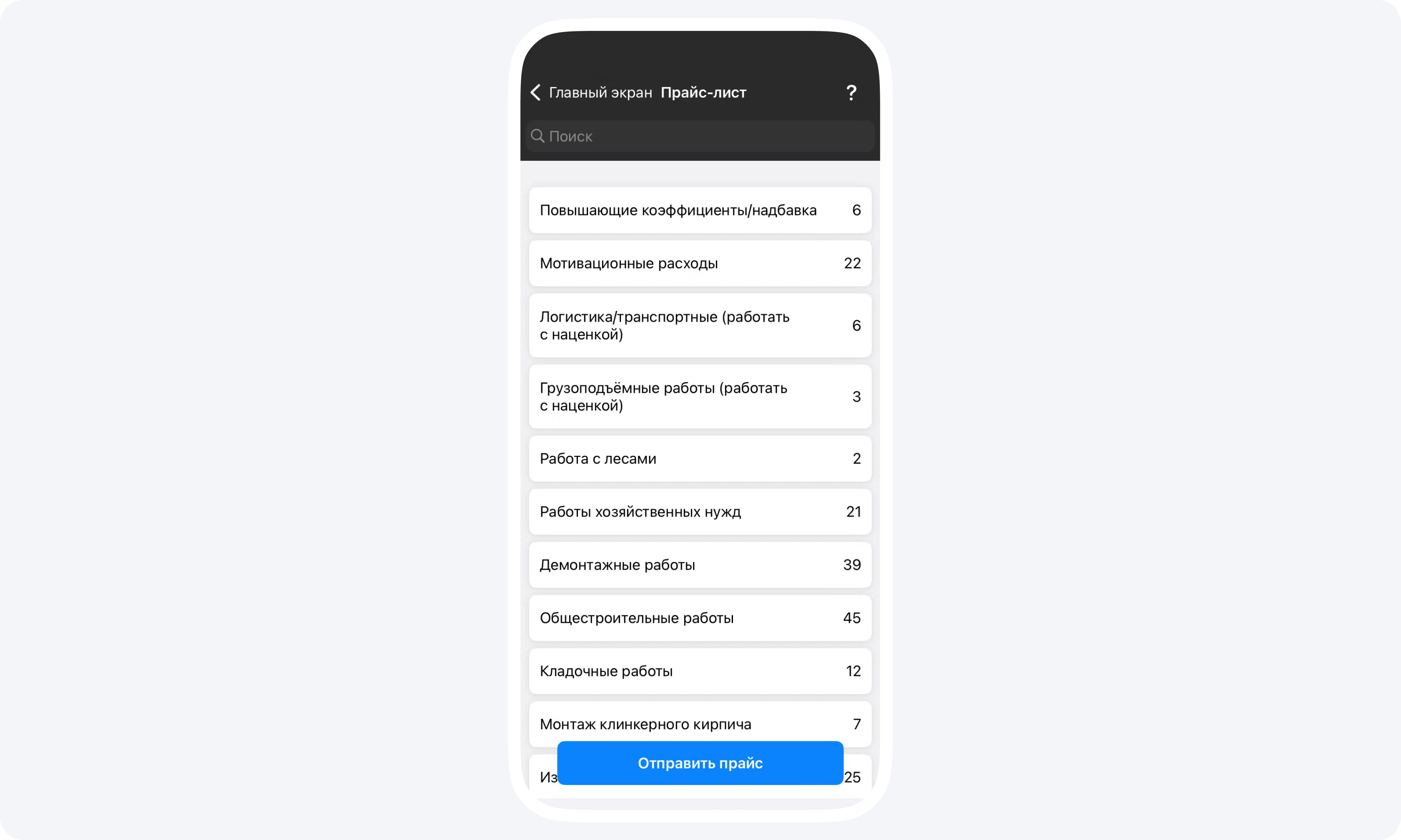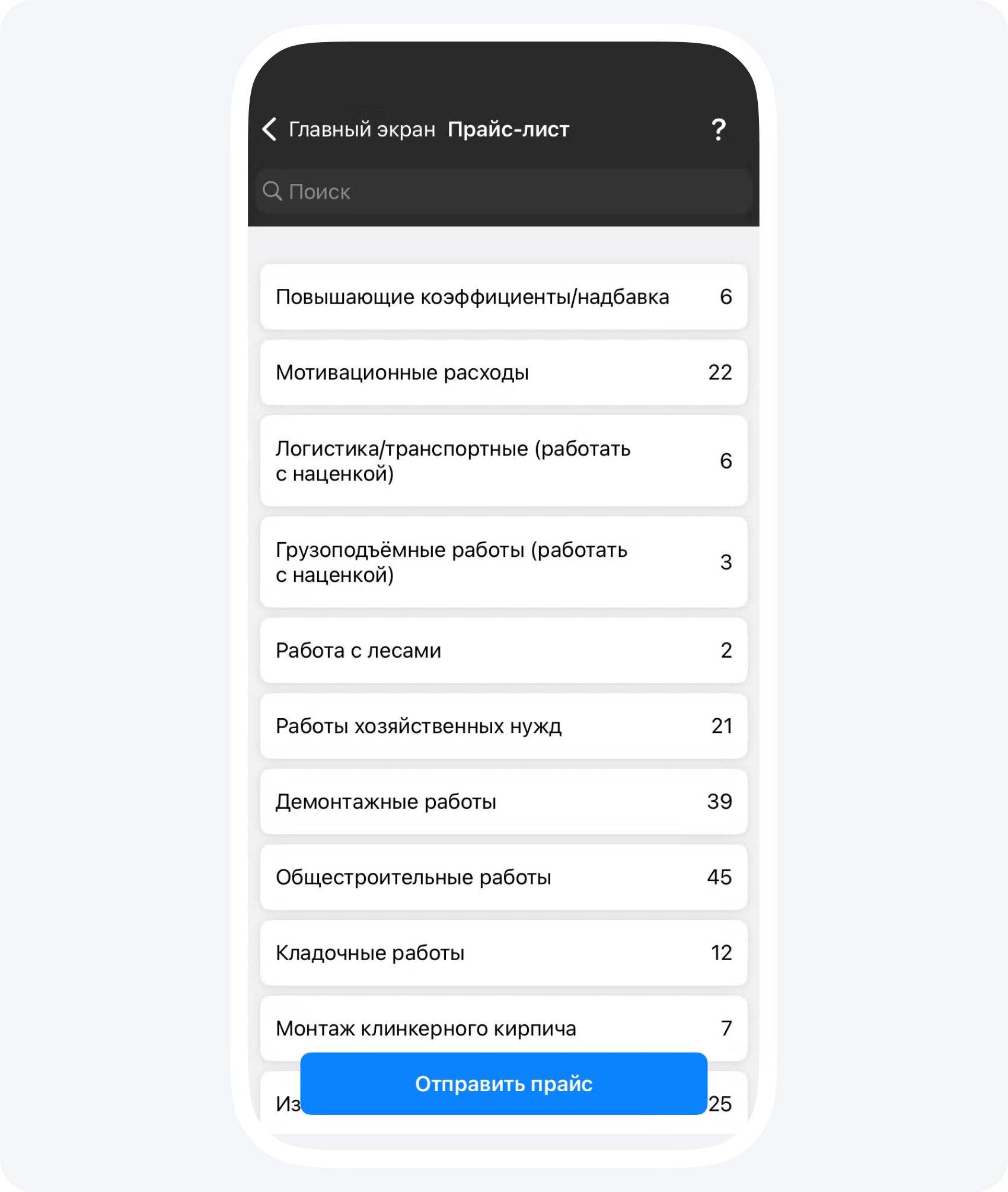 Чтобы напечатать прайс-лист подрядчика или отправить его в любой удобный мессенджер из приложения в формате PDF, нажмите кнопку Отправить прайс.