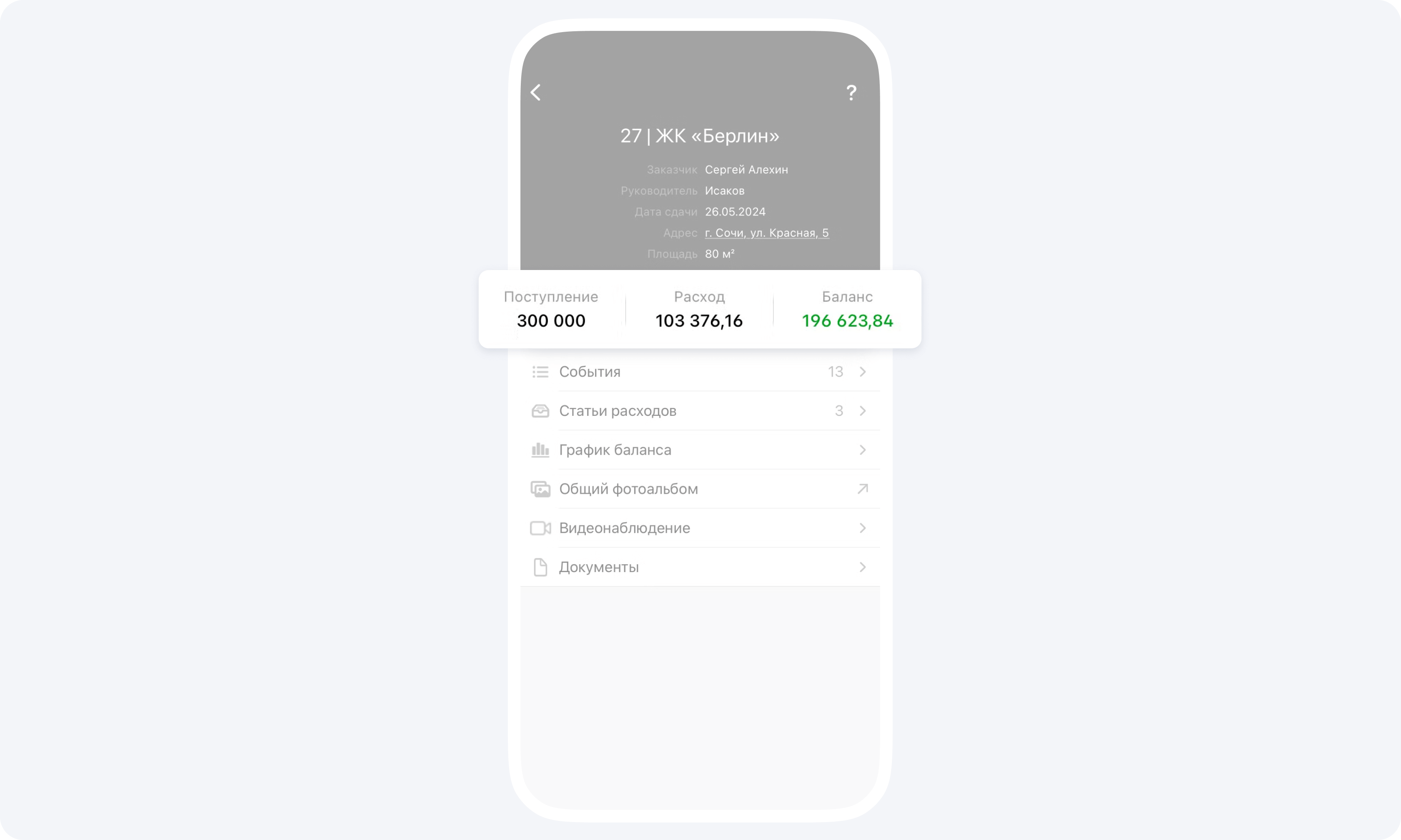 В разделе Проекты вы видите итоговые значения по вашему проекту:- поступление — это сумма всех авансовых платежей которые вы передаете подрядчику