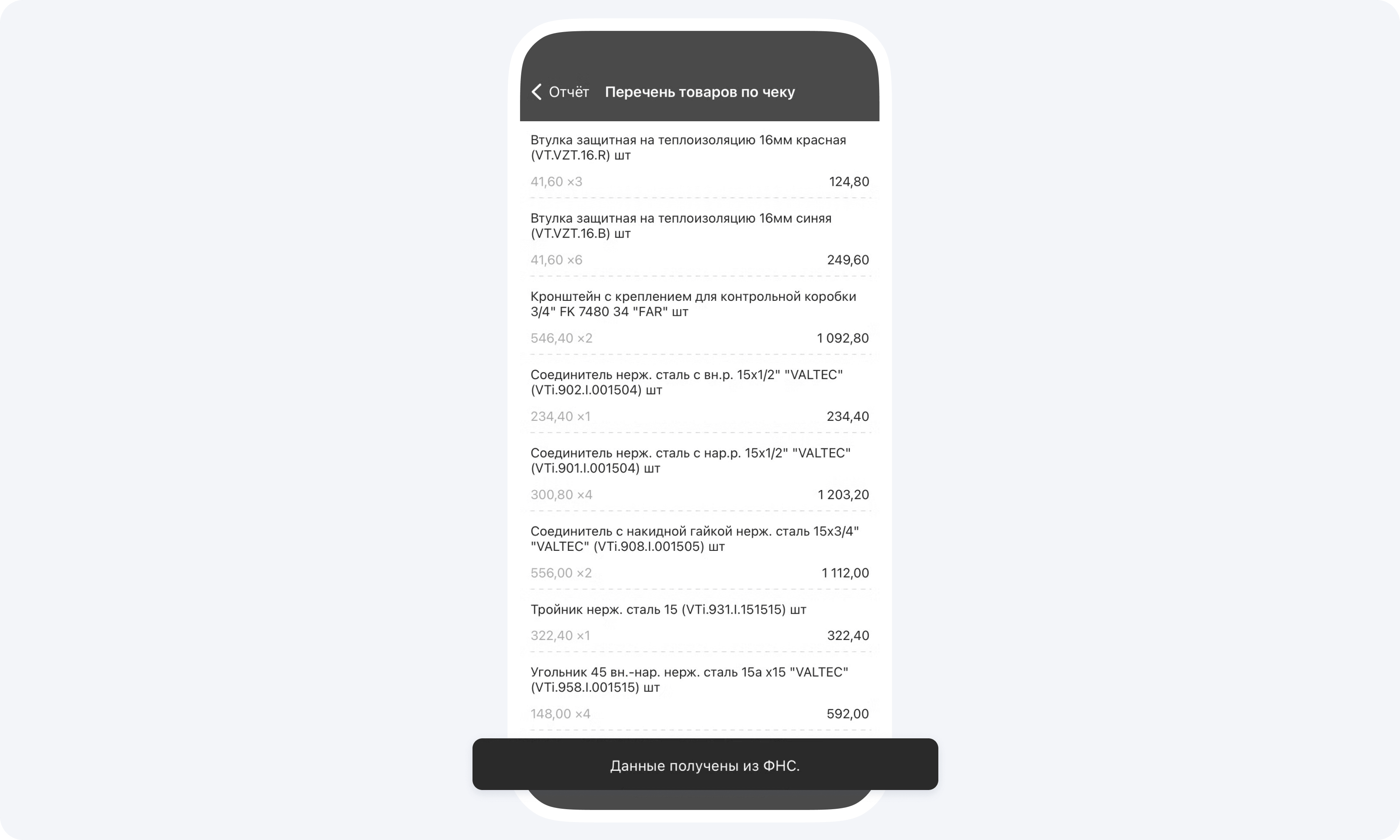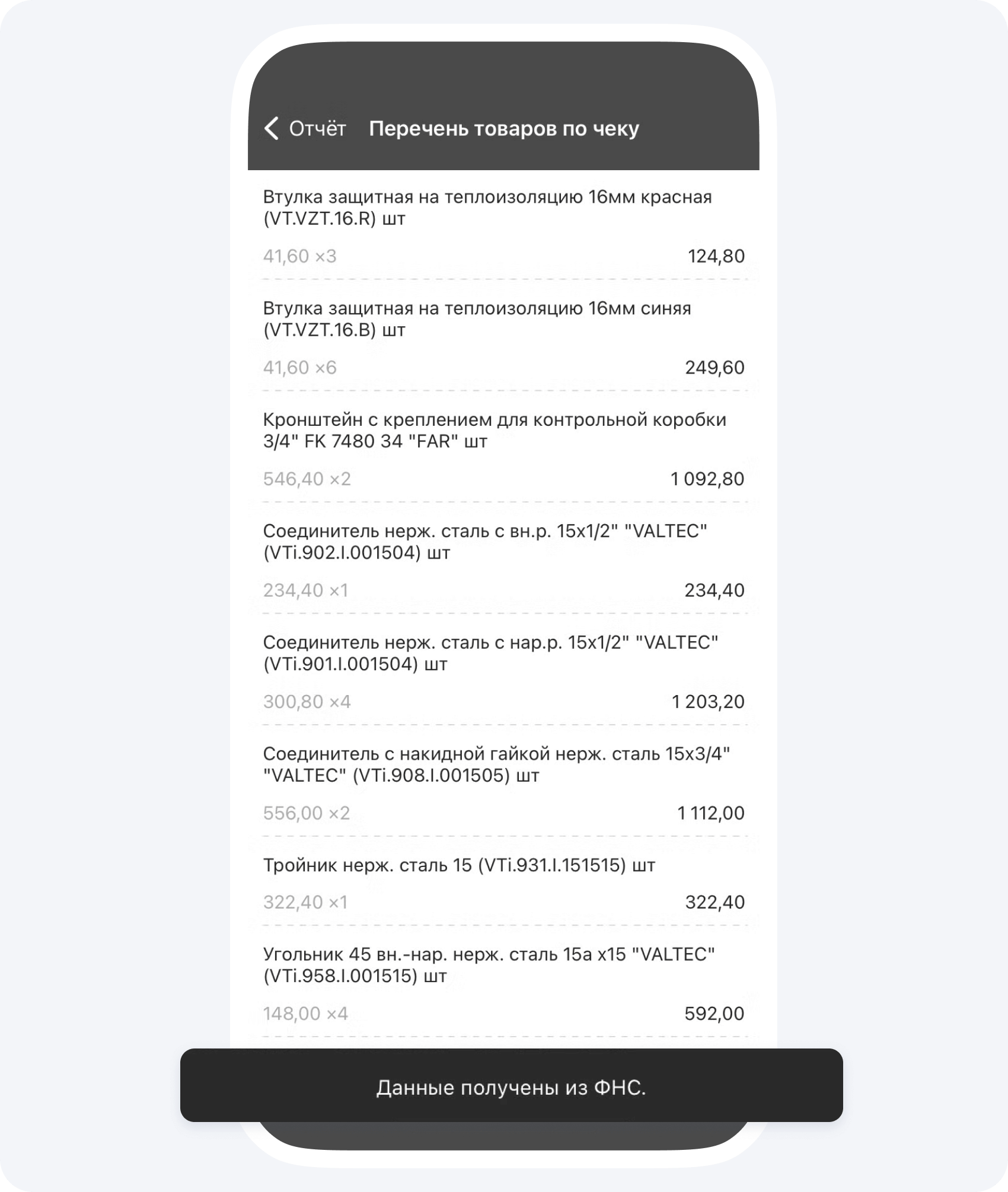 - При закупке материалов, ваш подрядчик заносит данные из чека, используя функцию сканирование QR-кода, все данные берутся из ФНС. Для вас все прозрачно! Перечень товаров и получатель денежных средств подгружаются автоматически