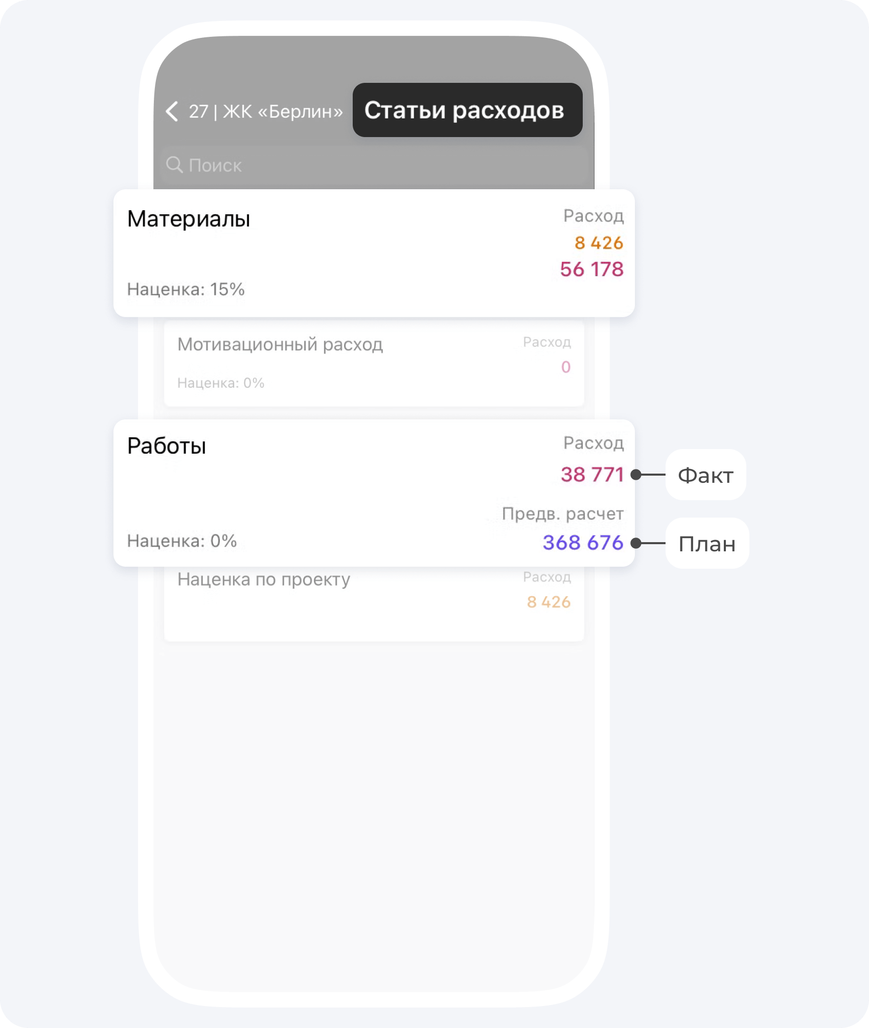 - Статьи расходов позволяют вам отслеживать затраты отдельно по каждой статье. Вы наглядно видите сколько денежных средств потрачено на материалы, а сколько на работы. Также в статьях расходов вы можете отследить план-факт выполнения работ