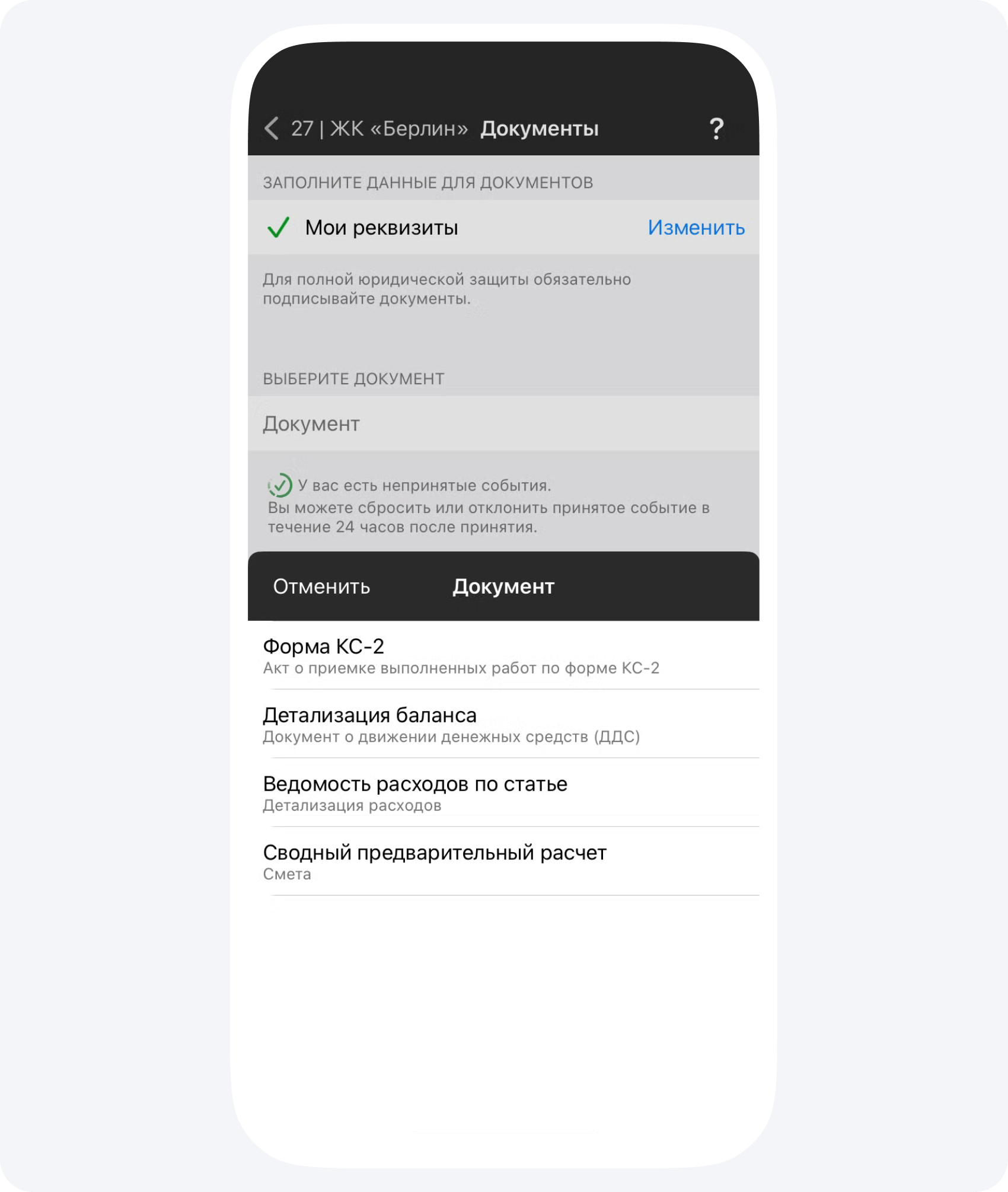 - В разделе Документы Вы можете сами сформировать отчет по проекту в любой момент времени для того, чтобы узнать все затраты по статьям расходов, сверить сколько денежных средств вы передали на реализацию объекта. И все это с помощью одной кнопки!