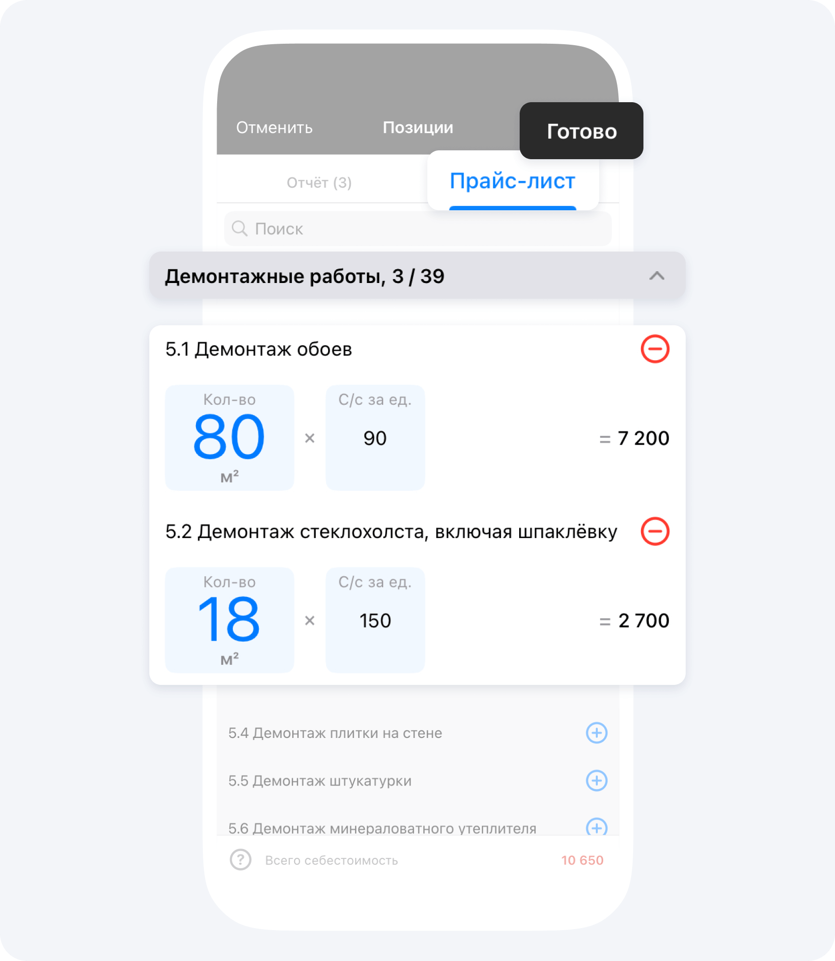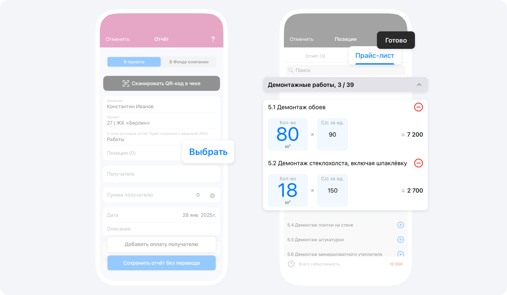 - В поле Позиции нажмите Выбрать и перейдите на вкладку Прайс-лист. Выберите работы, которые вы выполняли и укажите объемы выполненных работ. Нажмите Готово.
