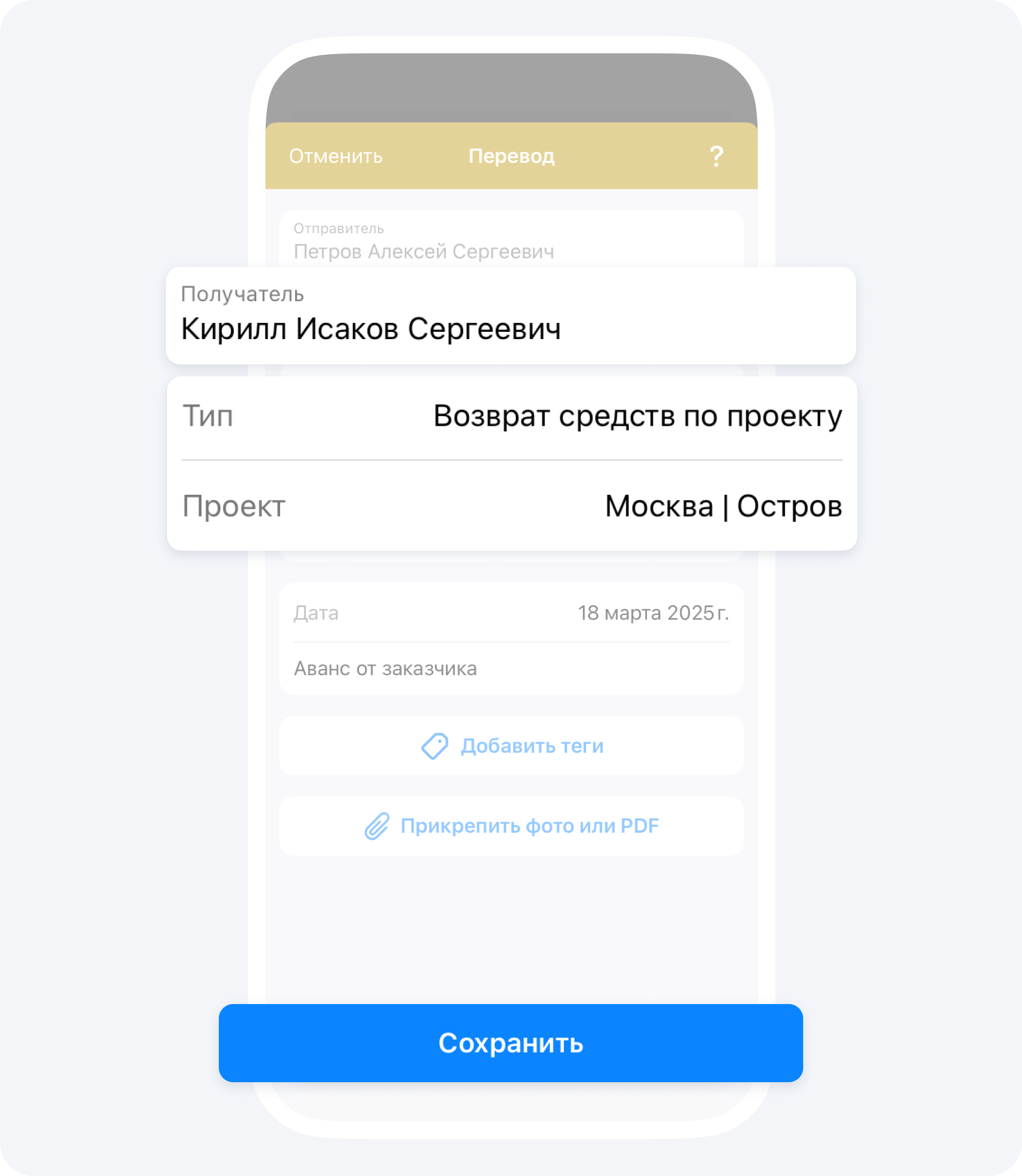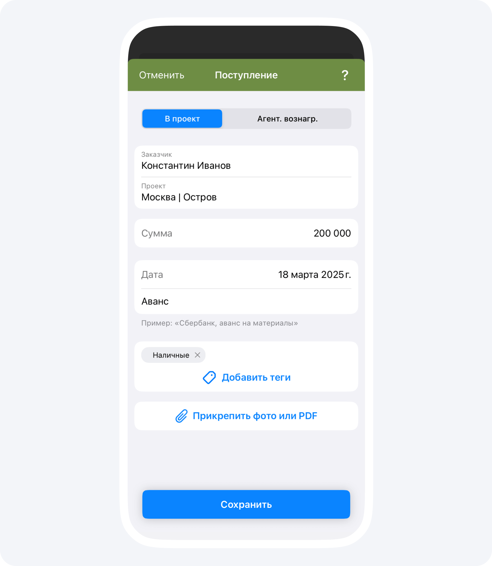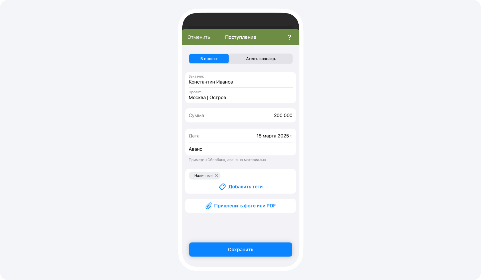 Если заказчик передал вам деньги по проекту, создайте в приложении событие Поступление: