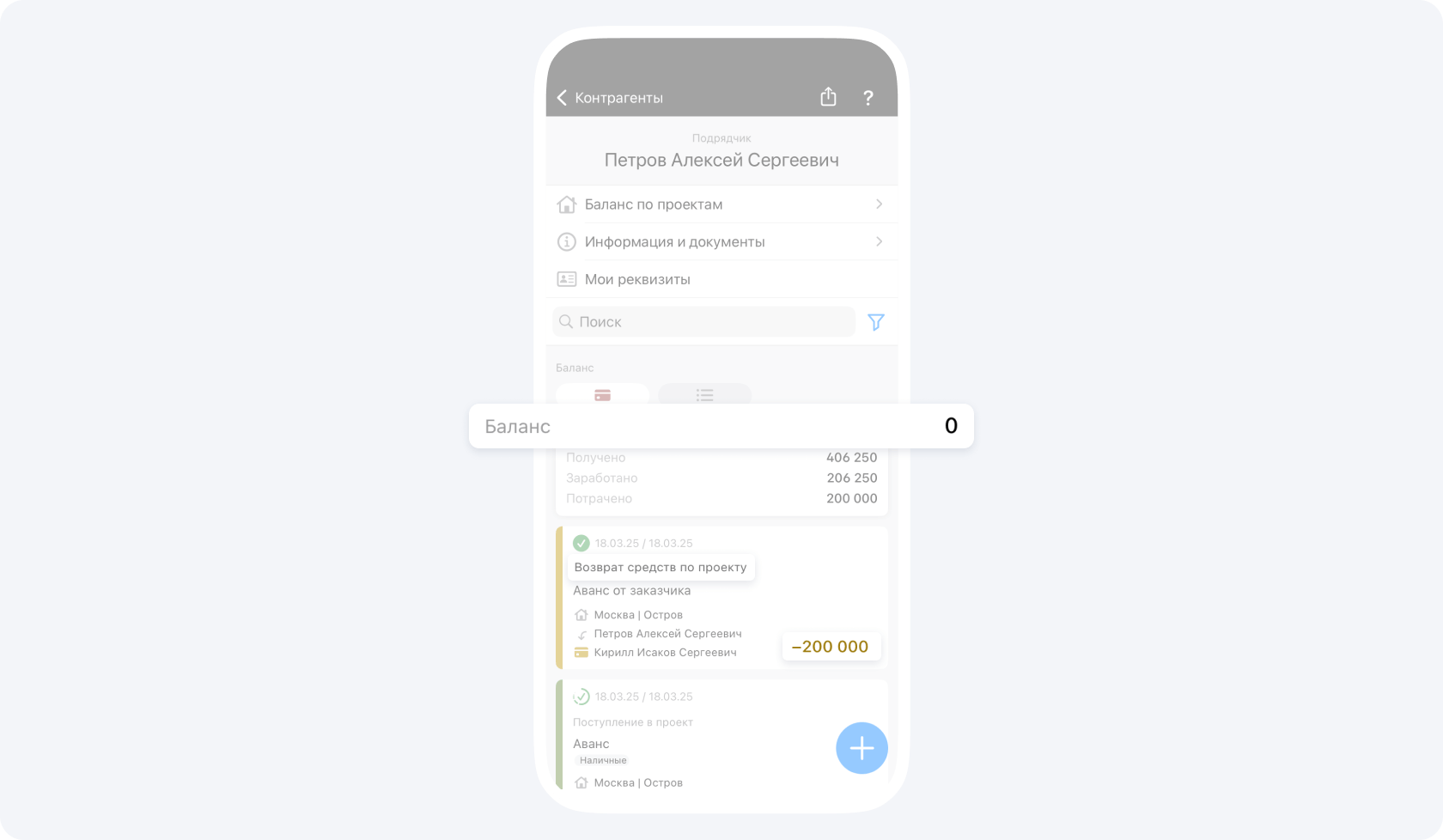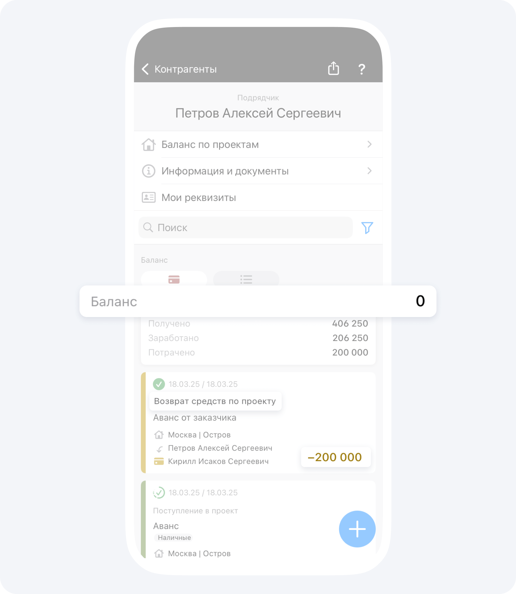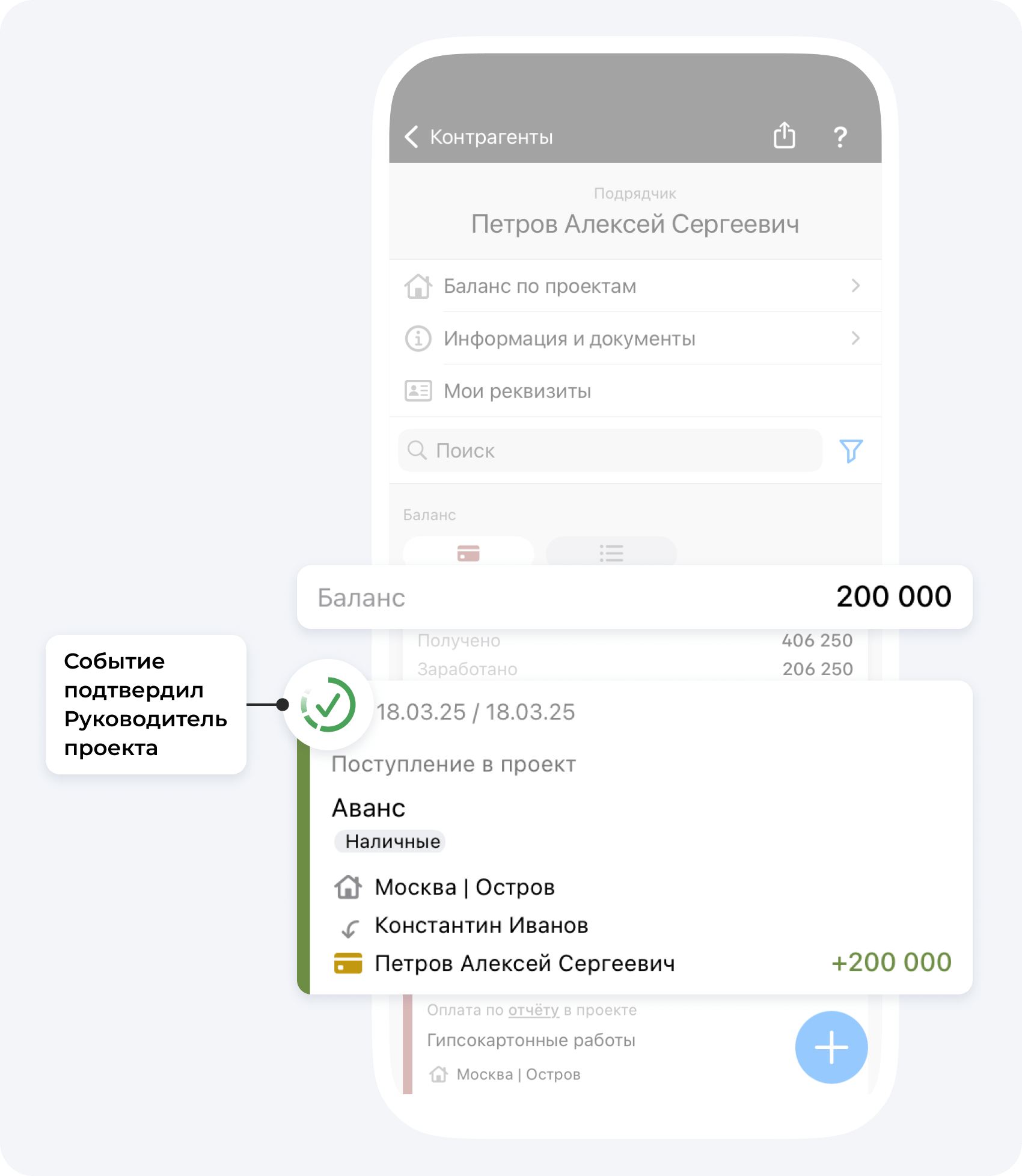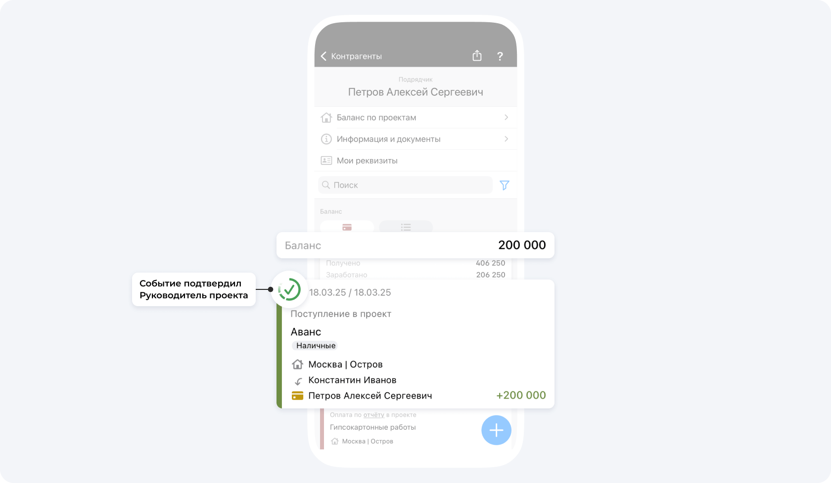 После подтверждения события Поступление Руководителем проекта, ваш баланс баланс увеличится на сумму Поступления.