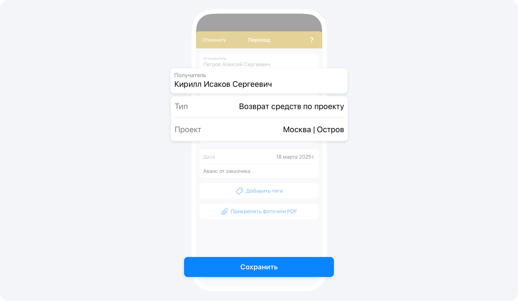 - Тип перевода — возврат средств по проекту
