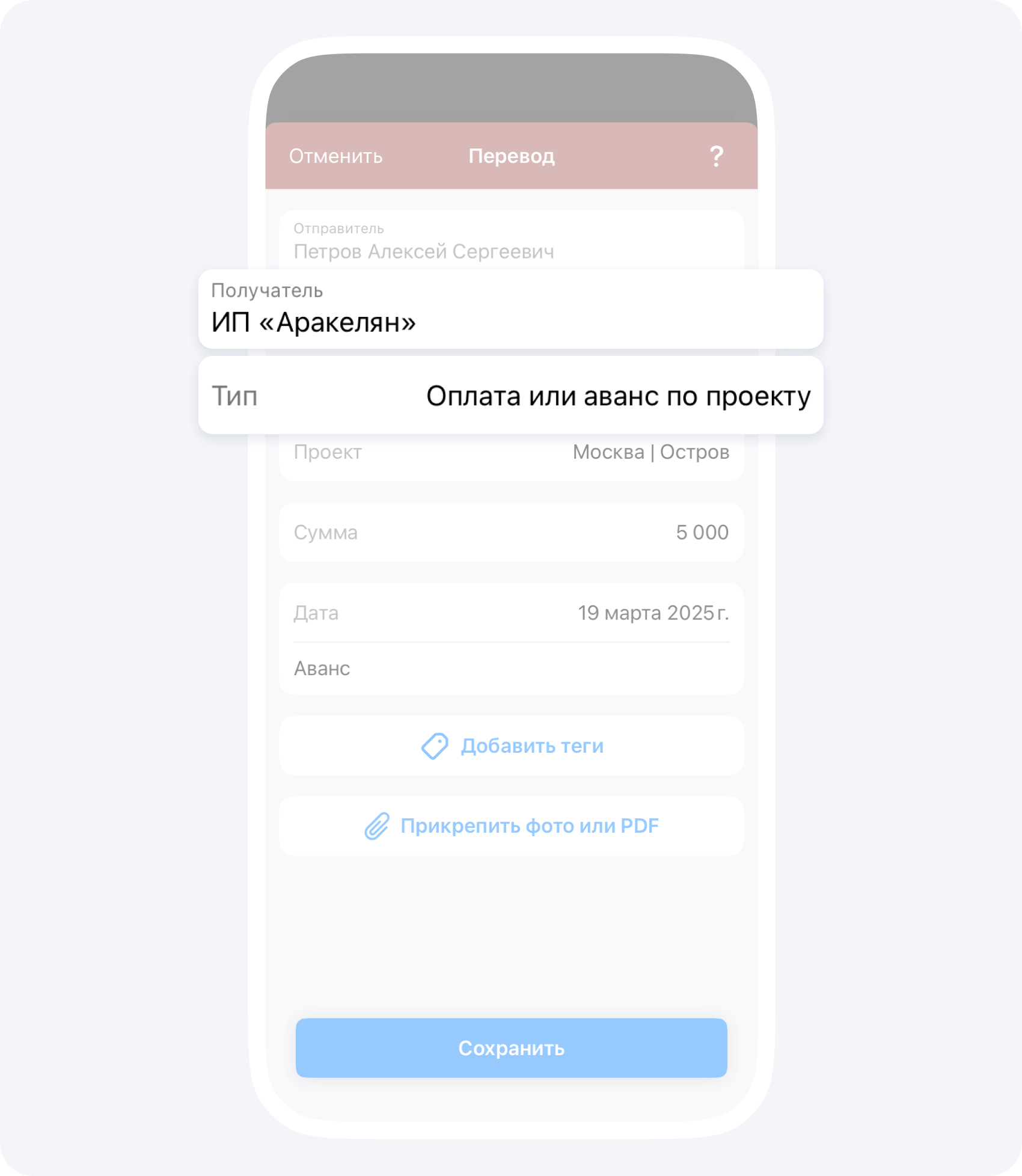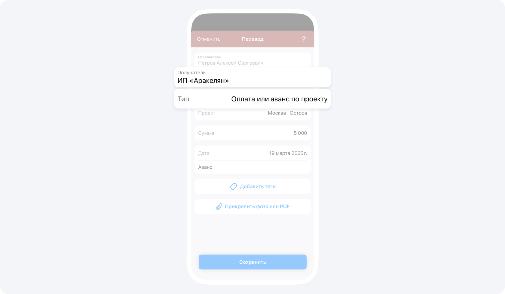 - Если расходы связаны с проектом, выберите тип перевода — Оплата или аванс по проекту