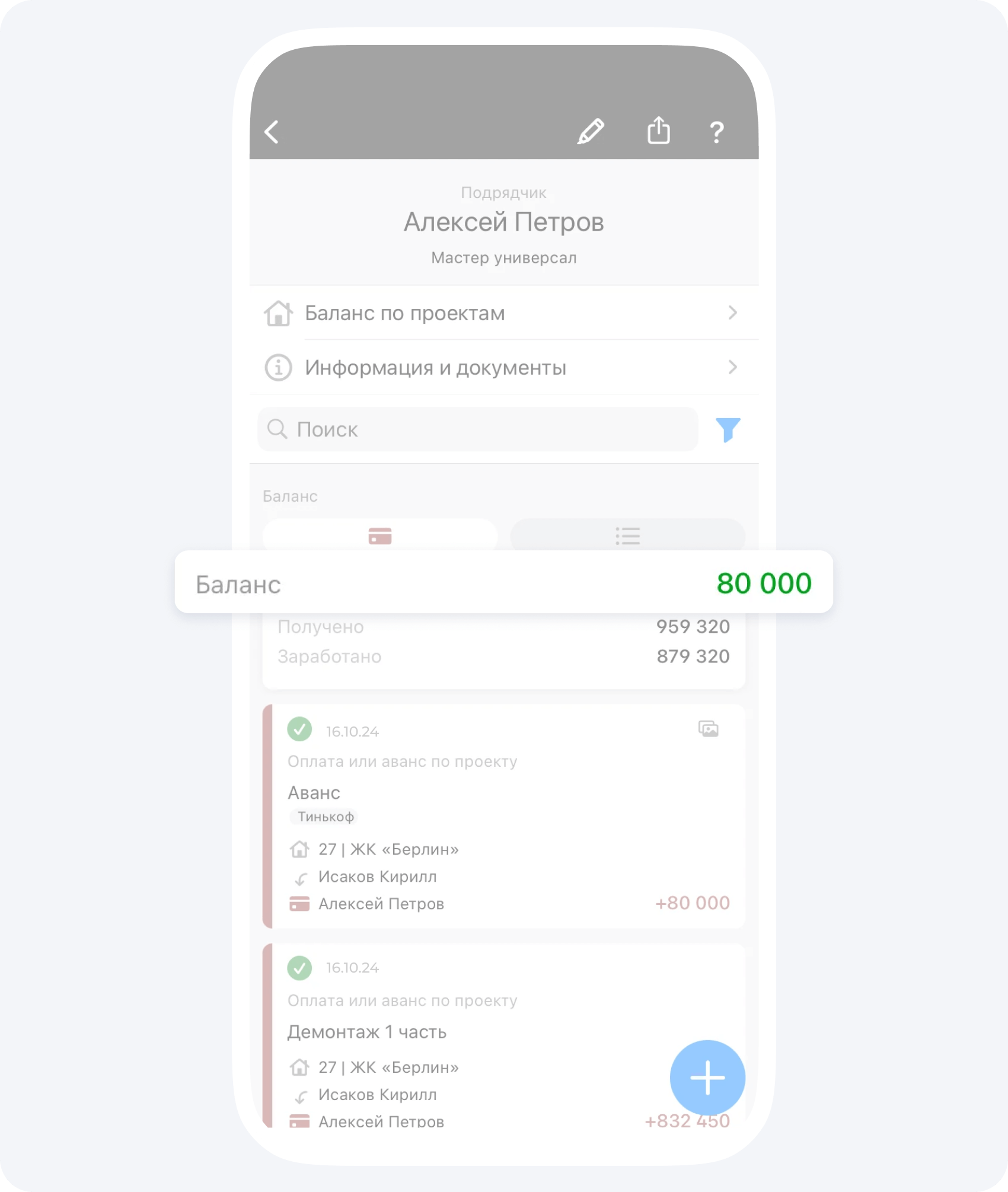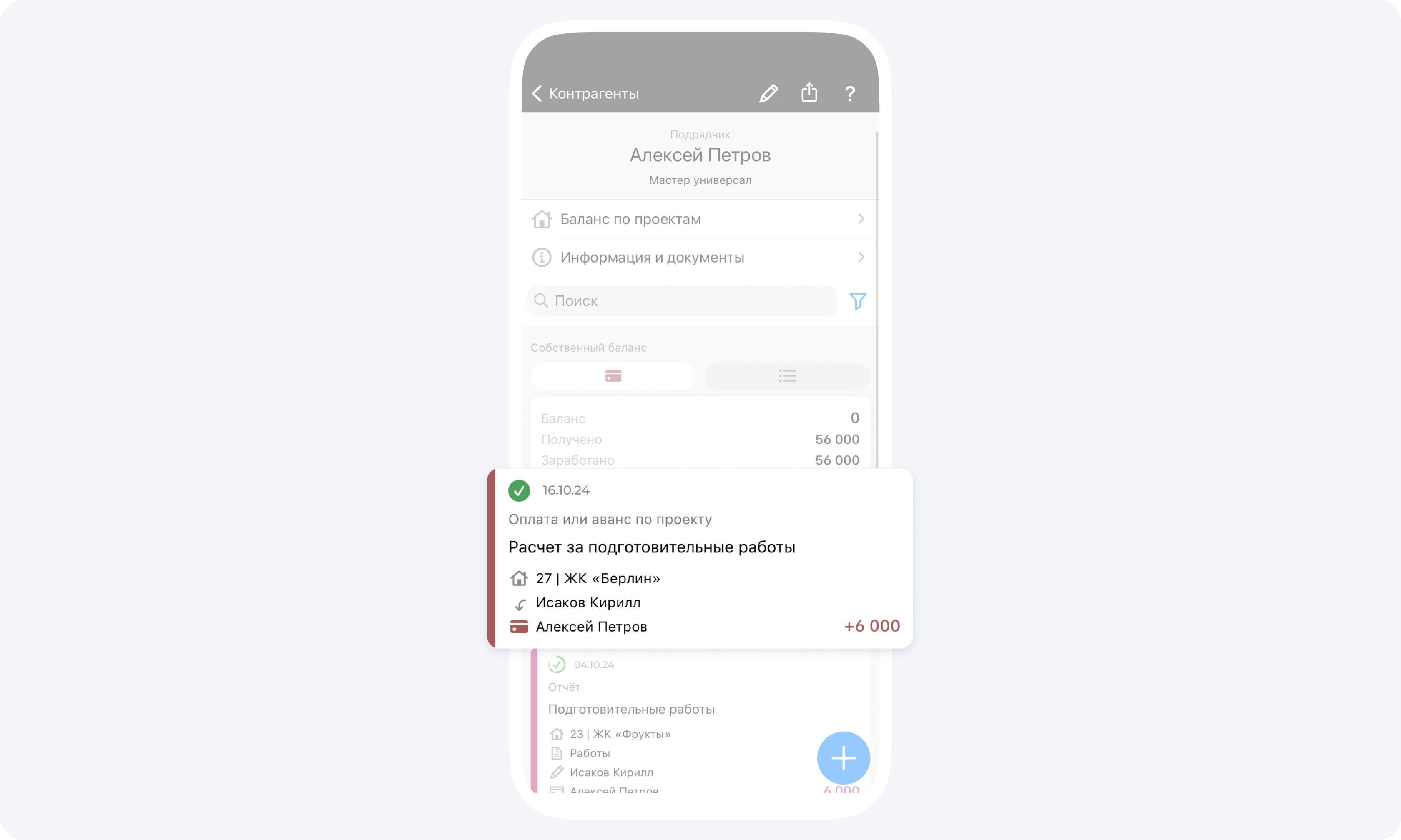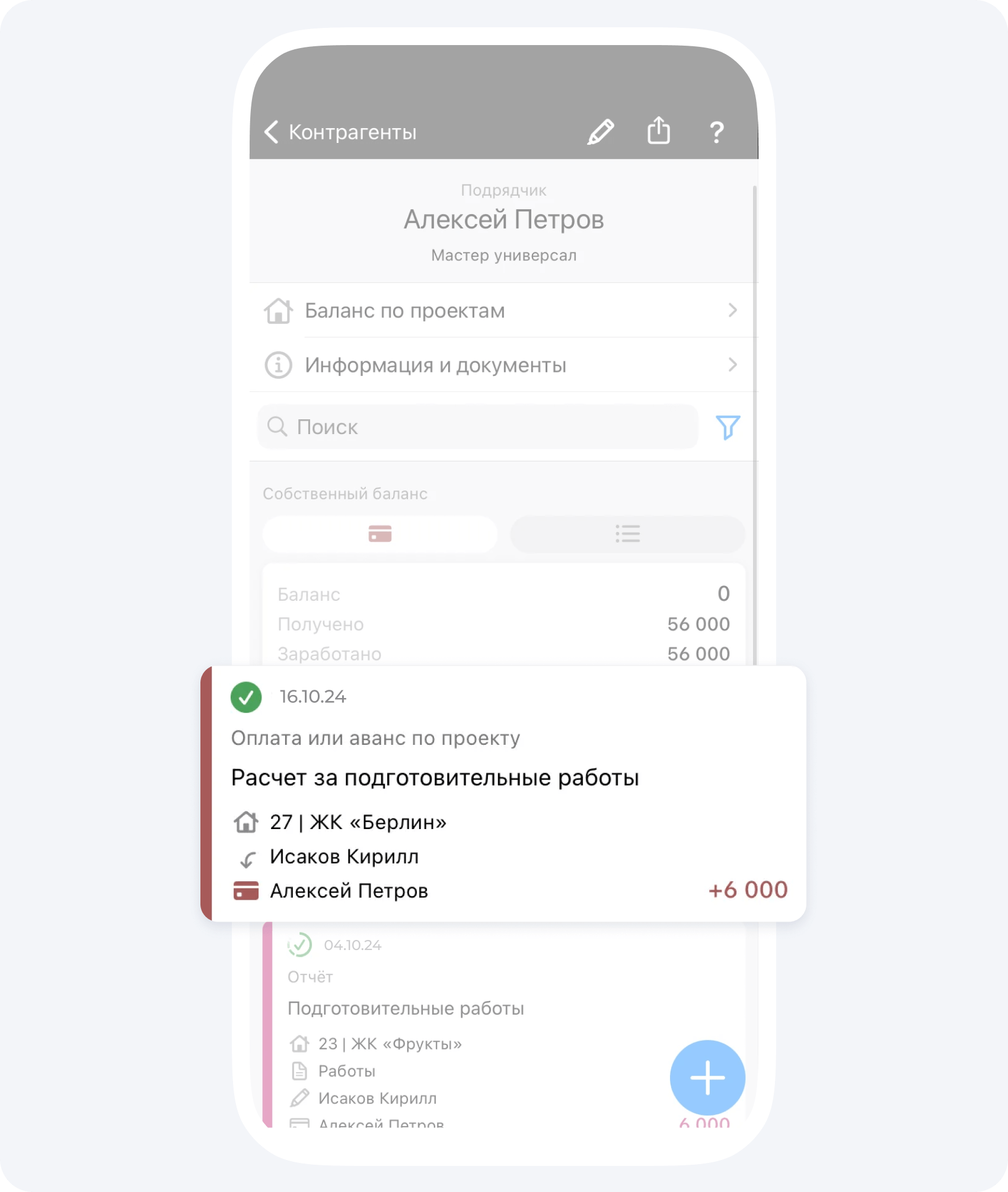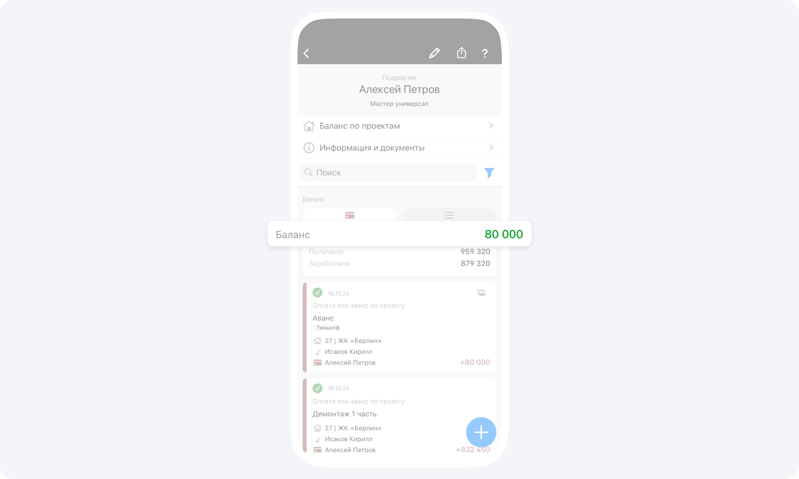 Ваш подрядчик 8 декабря выполнил работы на 832000₽ и создал событие Отчёт, а рассчитали вы его 15 декабря, так как на момент создания Отчёта у вас на подотчетном балансе не было денежных средств.