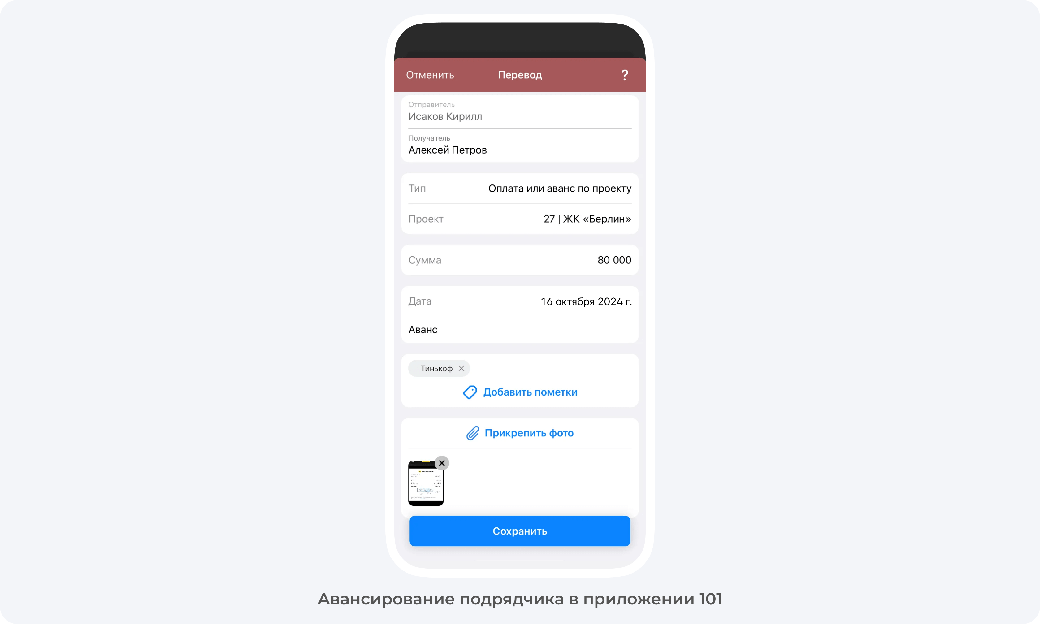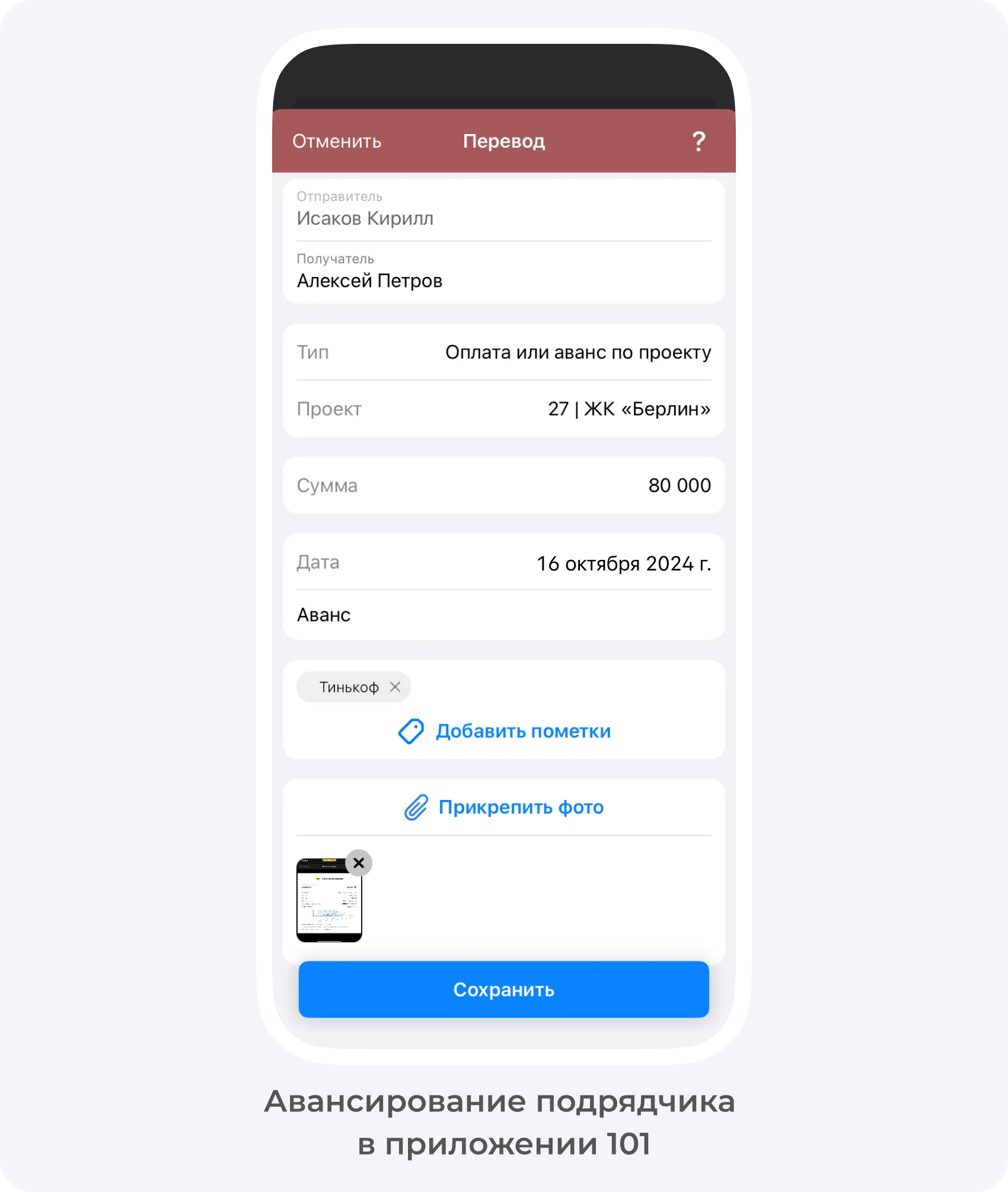 - Тип перевода — Оплата или аванс по проекту