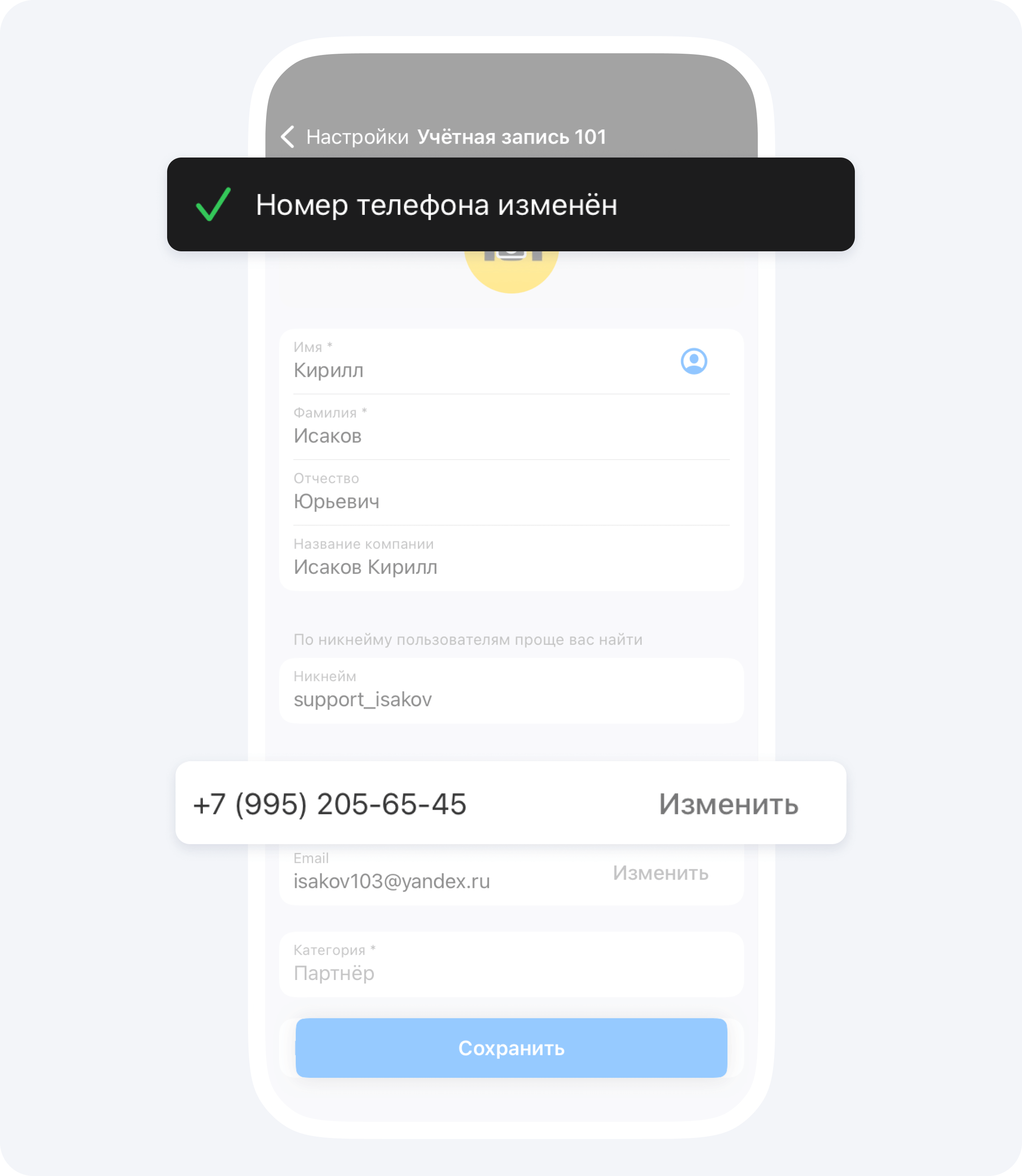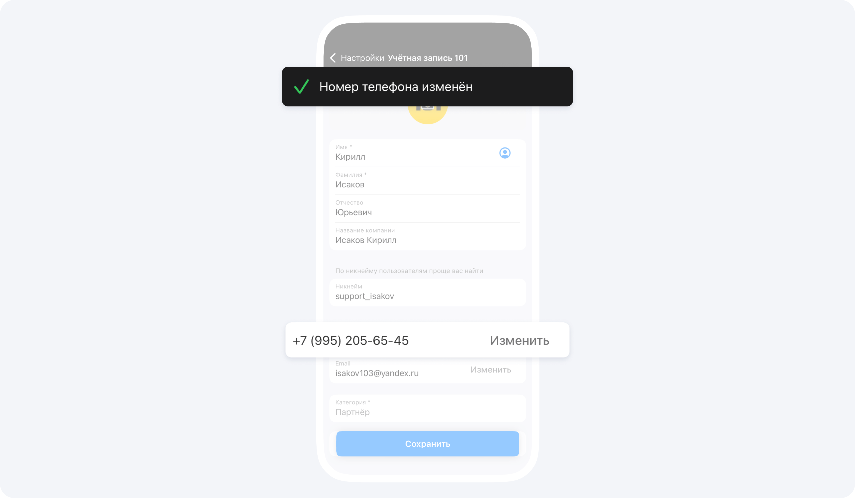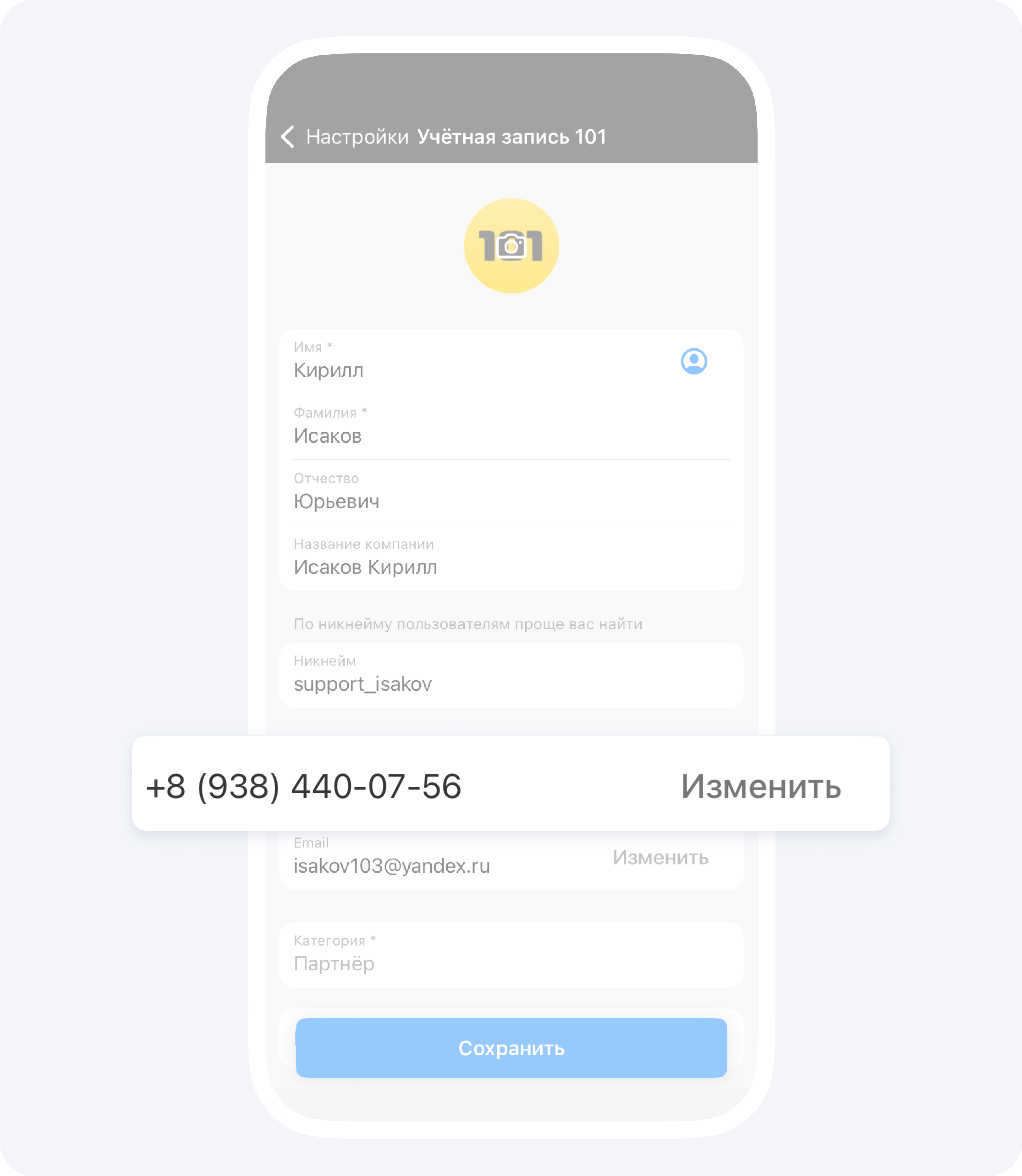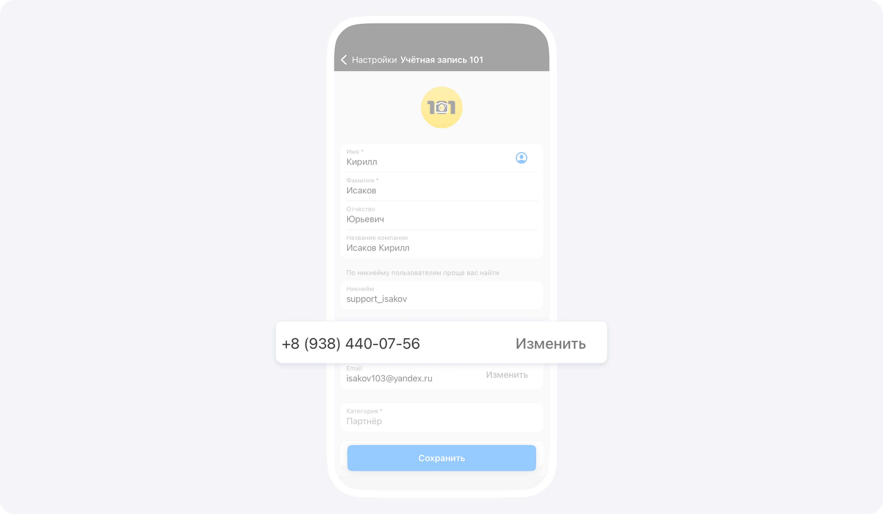 Важно! Номер можно заменить только на тот, который ранее не использовался в других учетных записях в Приложении 101.