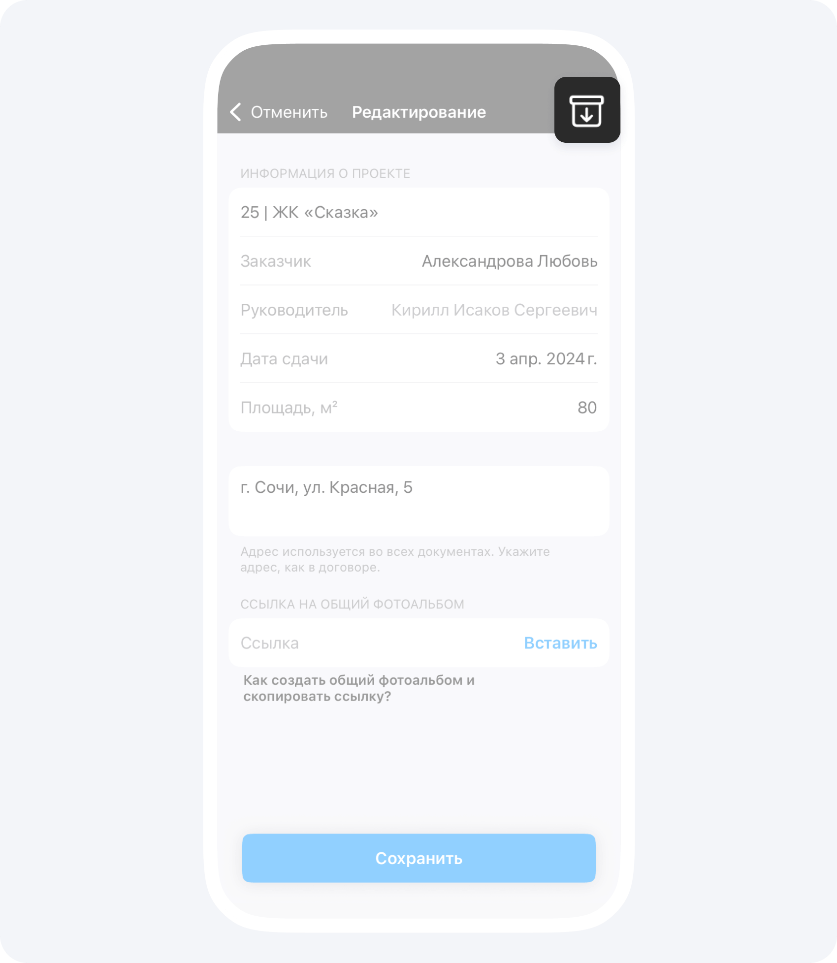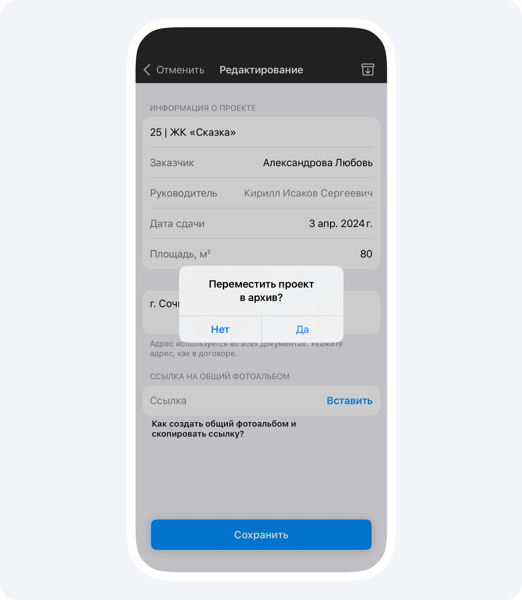 - Далее нажмите иконку со стрелкой и подтвердите перемещение проекта в архив