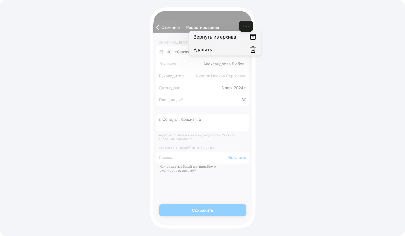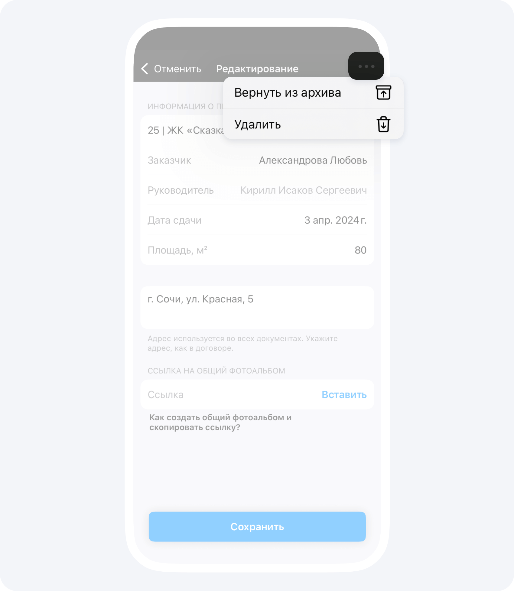Чтобы вернуть проект из Архива: