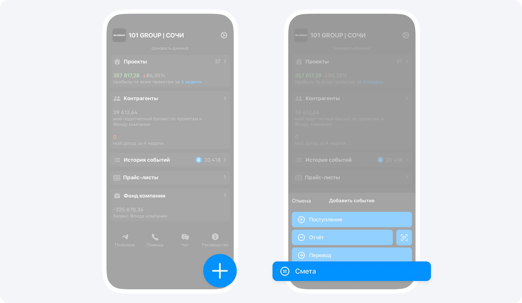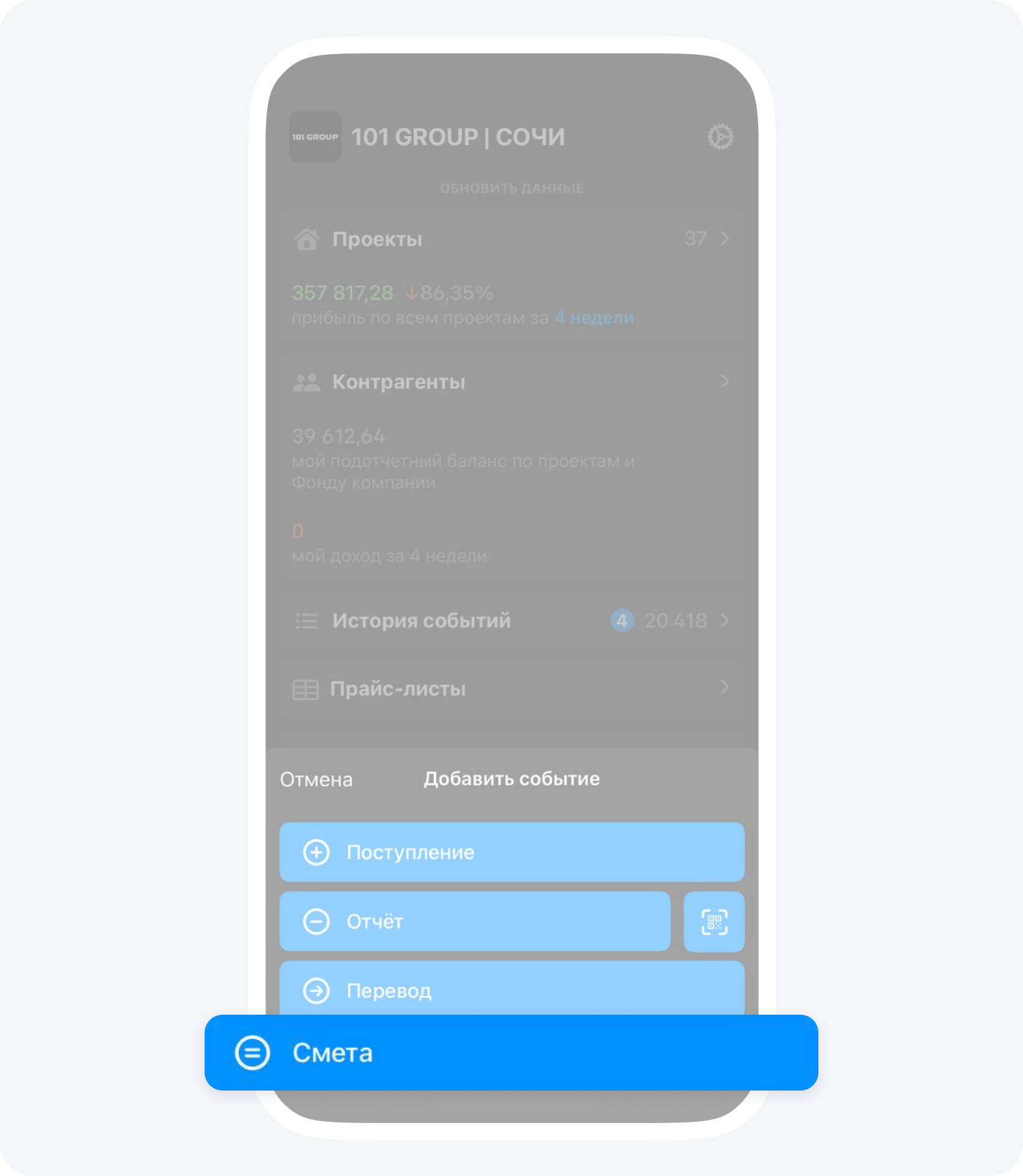 На панели управления нажмите кнопку «+» и выберите событие Смета.