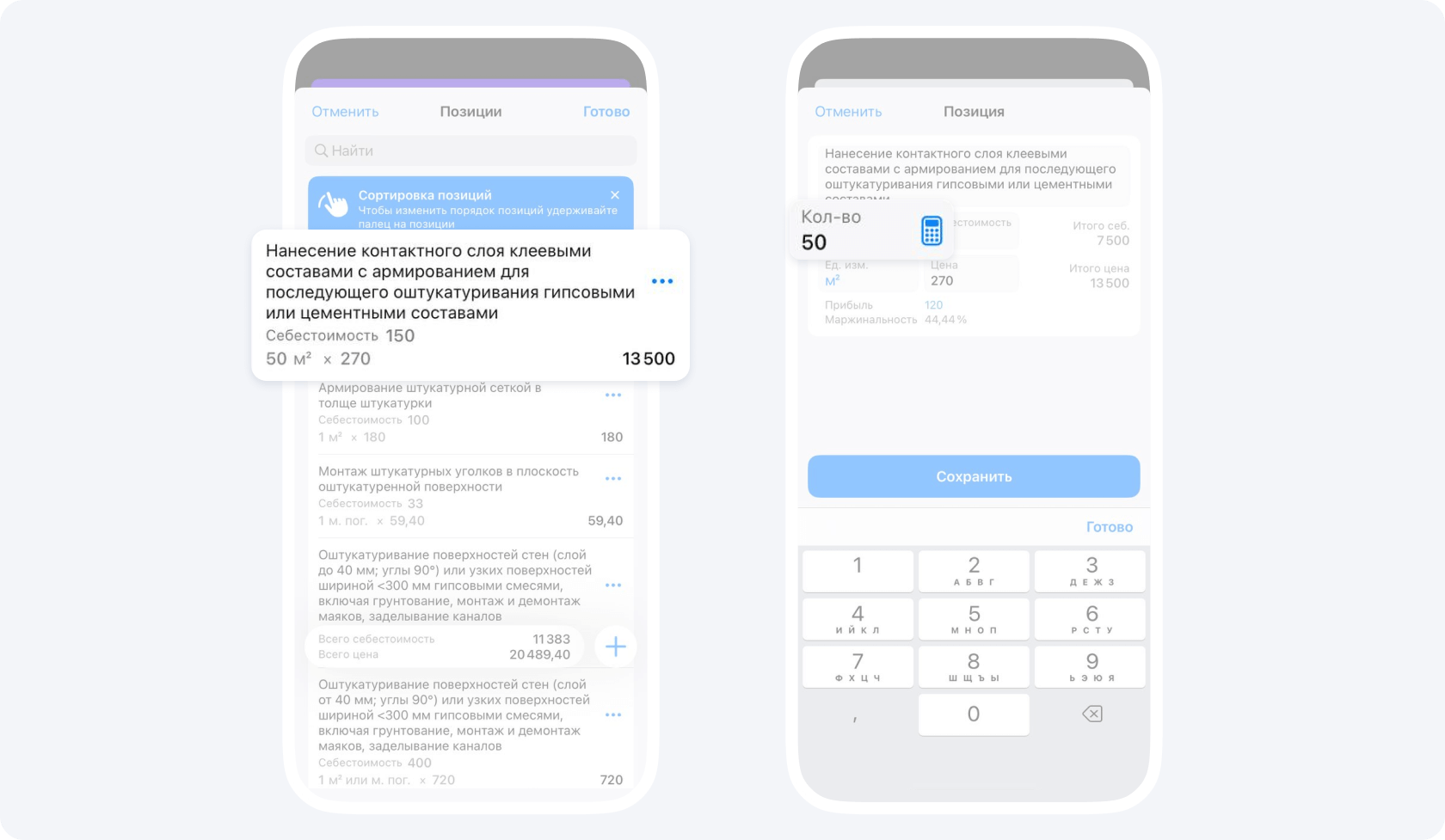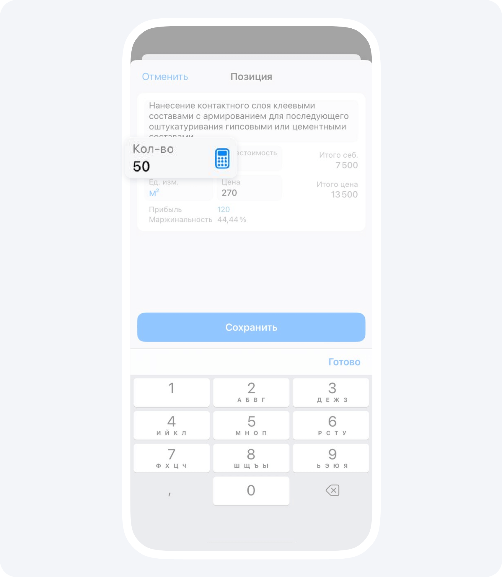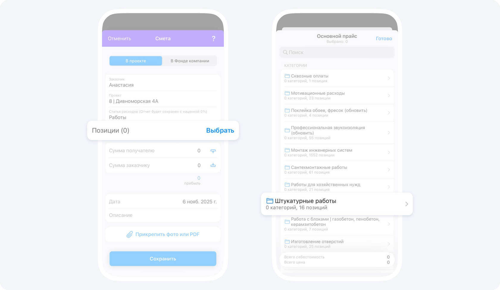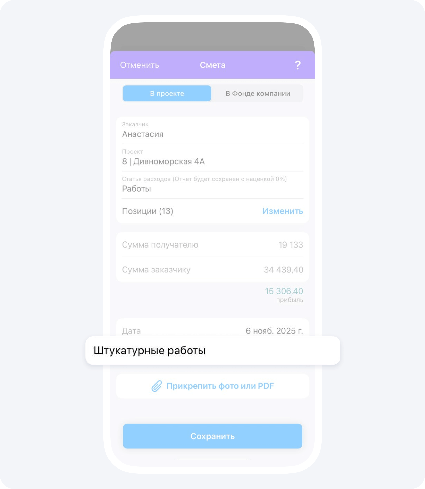 Важно разбивать смету на отдельные виды работ, либо на отдельные этапы, чтобы была возможность превратить смету в отчёт, если заказчик согласовал объемы, а мастер данные работы уже выполнил.