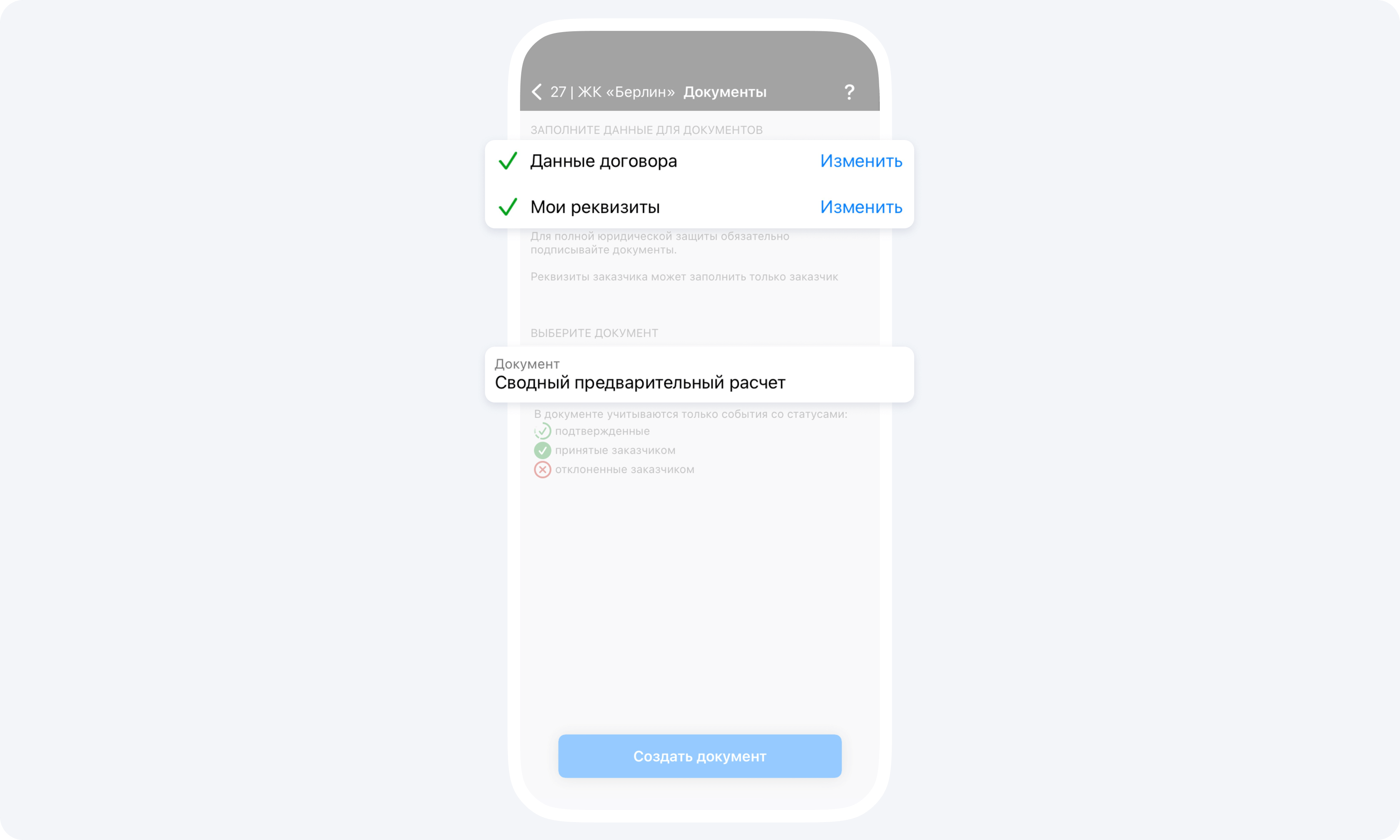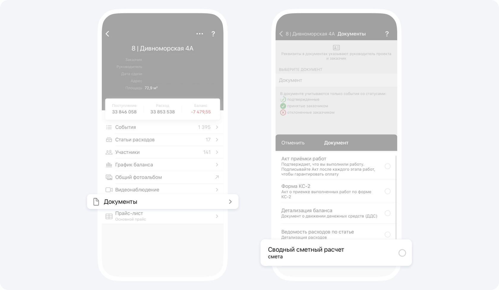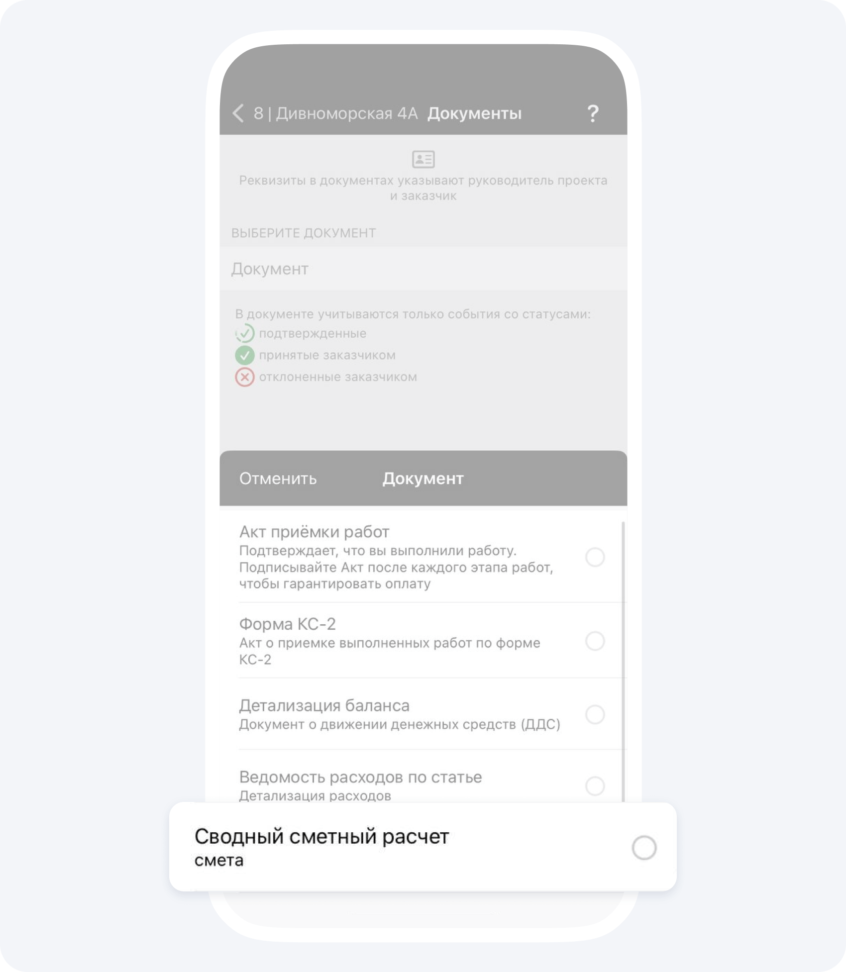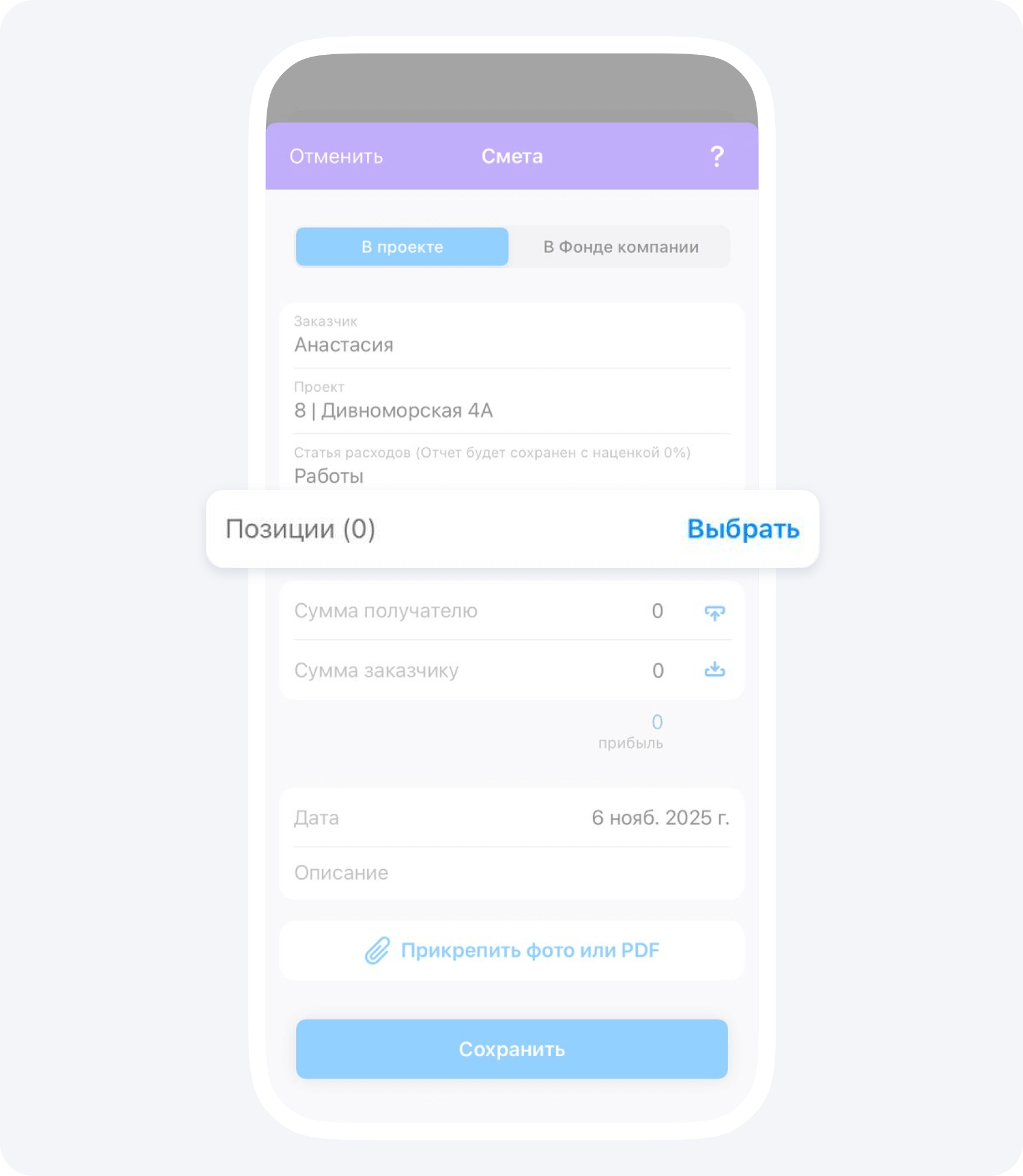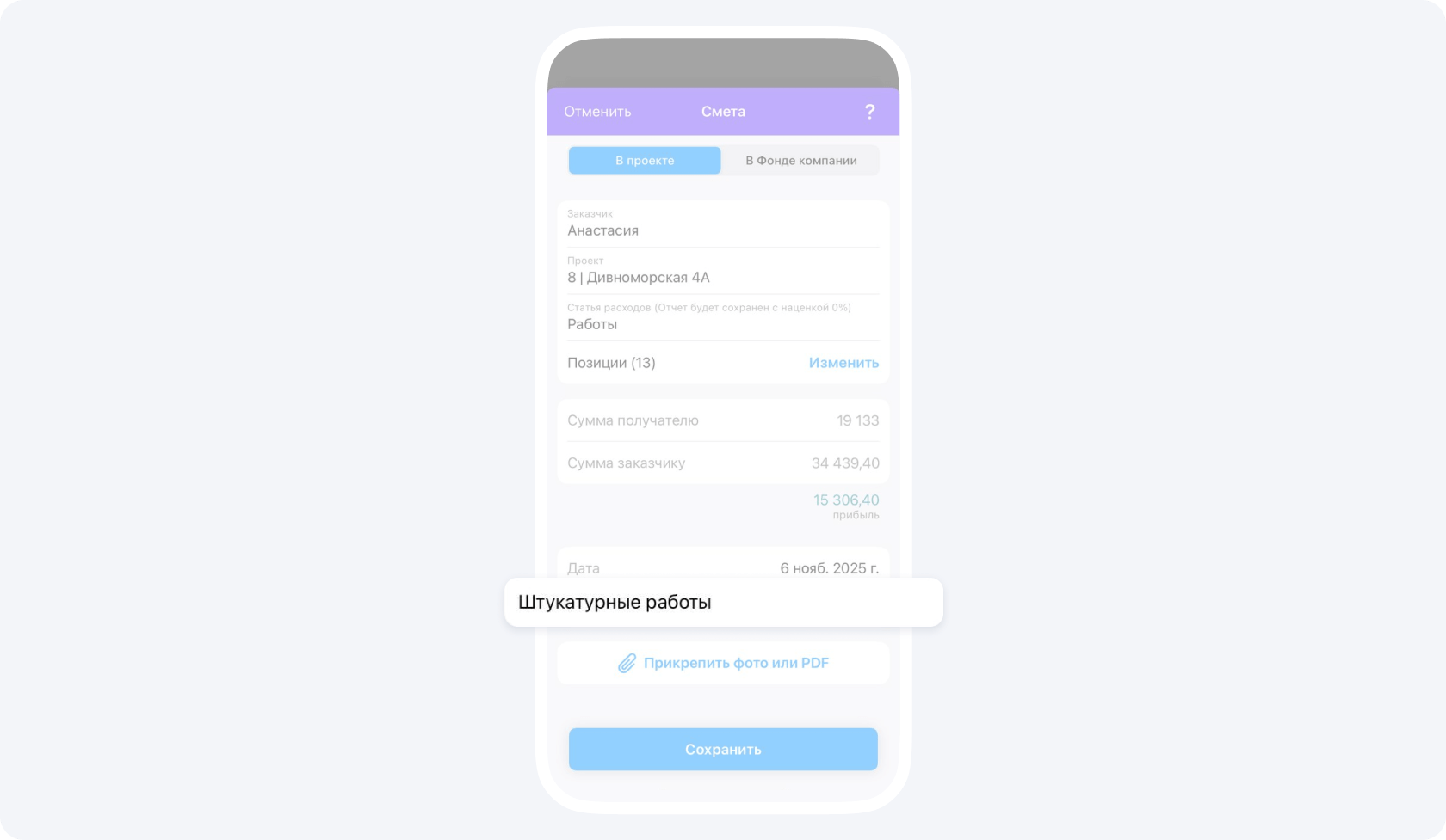С помощью события Смета вы можете реализовать планирование на объекте. Очень удобно создавать сметы на предполагаемую дату завершения тех или иных видов работ. Это поможет задать ориентировочные сроки и зафиксировать ожидаемые суммы. Вся информация будет отображаться в приложении и станет доступна заказчику при закрытии соответствующих работ через событие Отчёт. Такой подход упрощает коммуникацию, позволяет сопоставлять запланированные показатели с фактическими и существенно снижает количество вопросов и звонков со стороны заказчика.