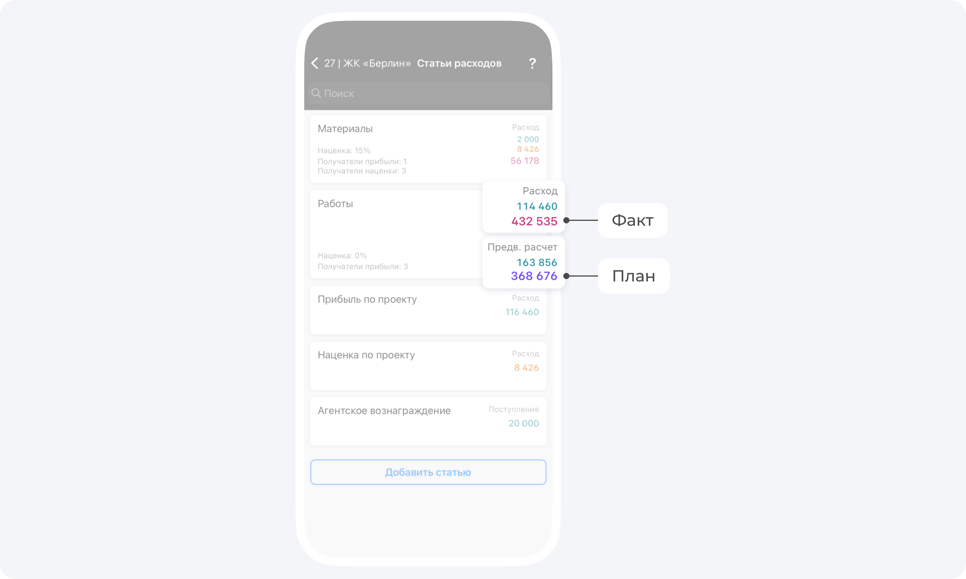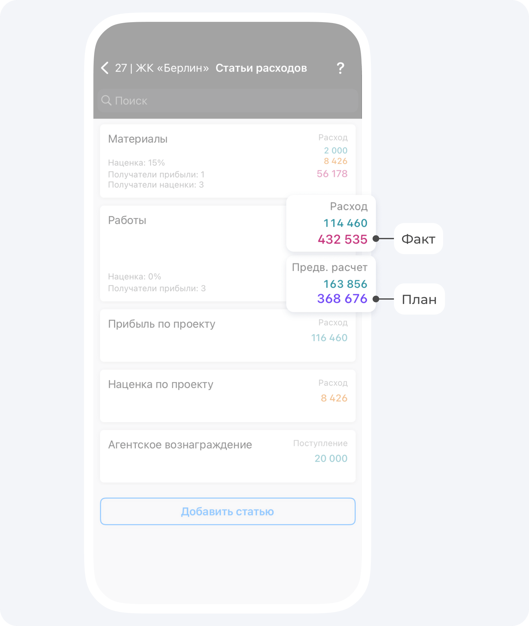 В статьях расходов по проекту вы сможете отслеживать план-факт выполнения работ.