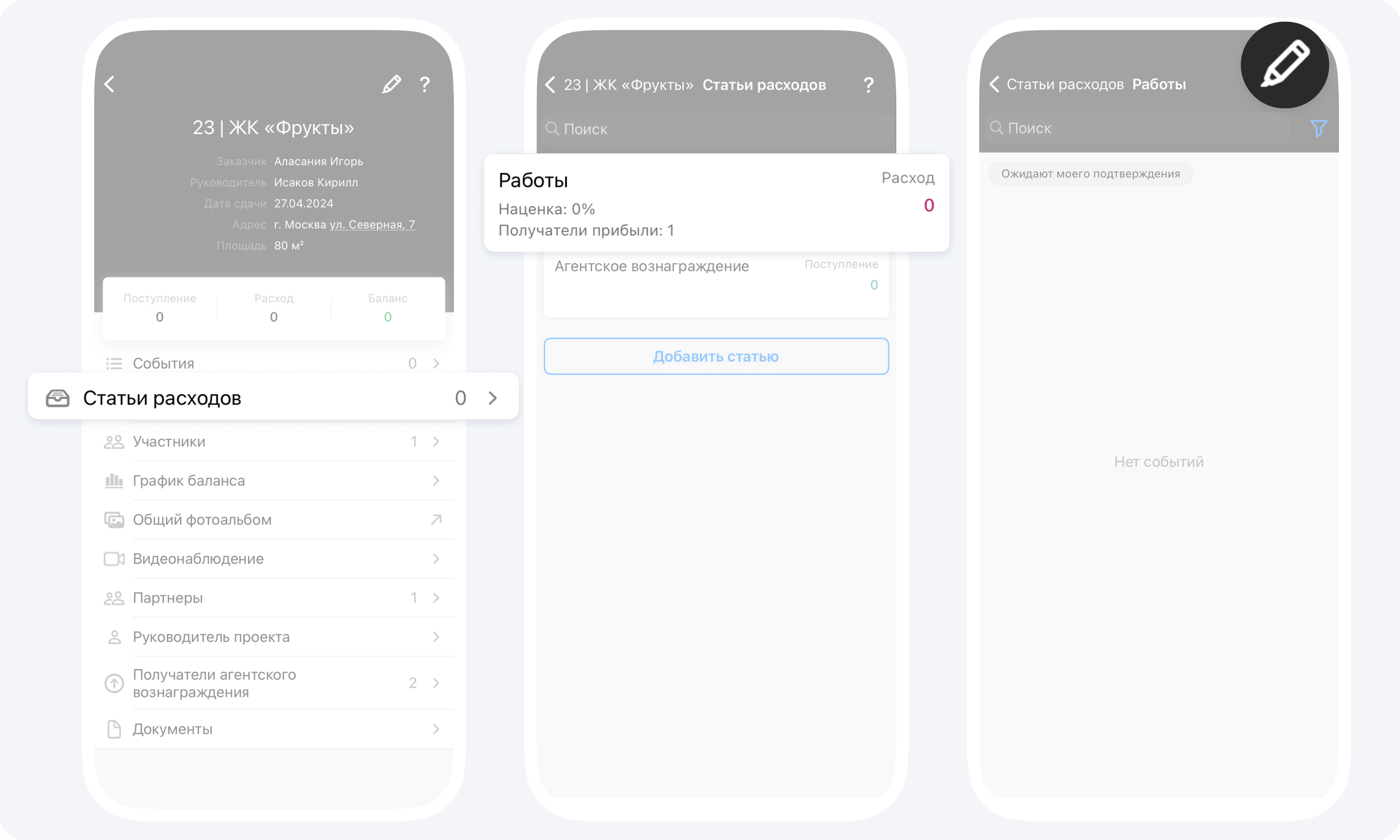 После того, как вы настроили распределение прибыли или наценки, все новые события: отчёты и сметы по статьям, будут хранить данное распределение. Начисления долей прибыли и наценки будут учитываться в собственном балансе контрагентов.