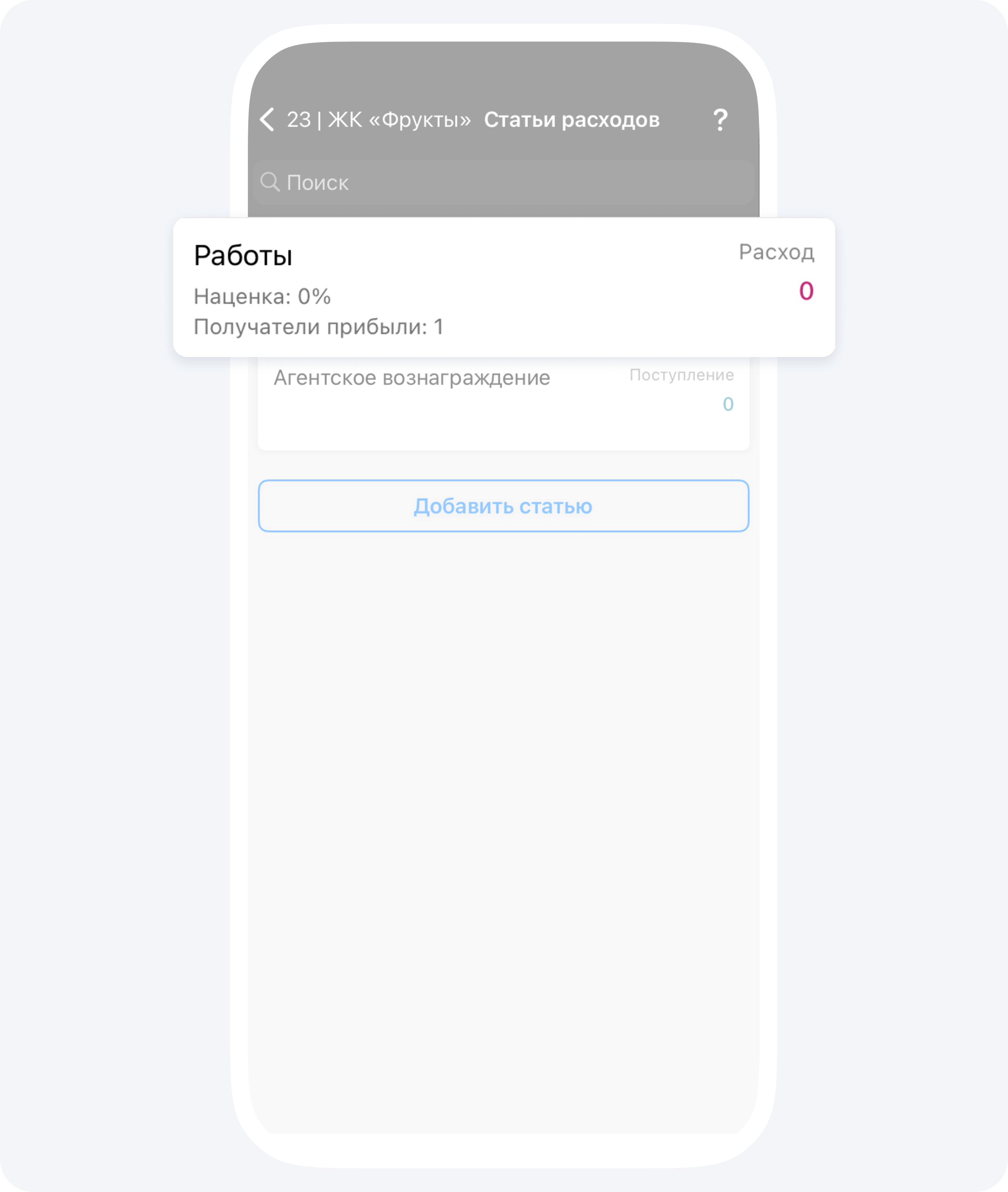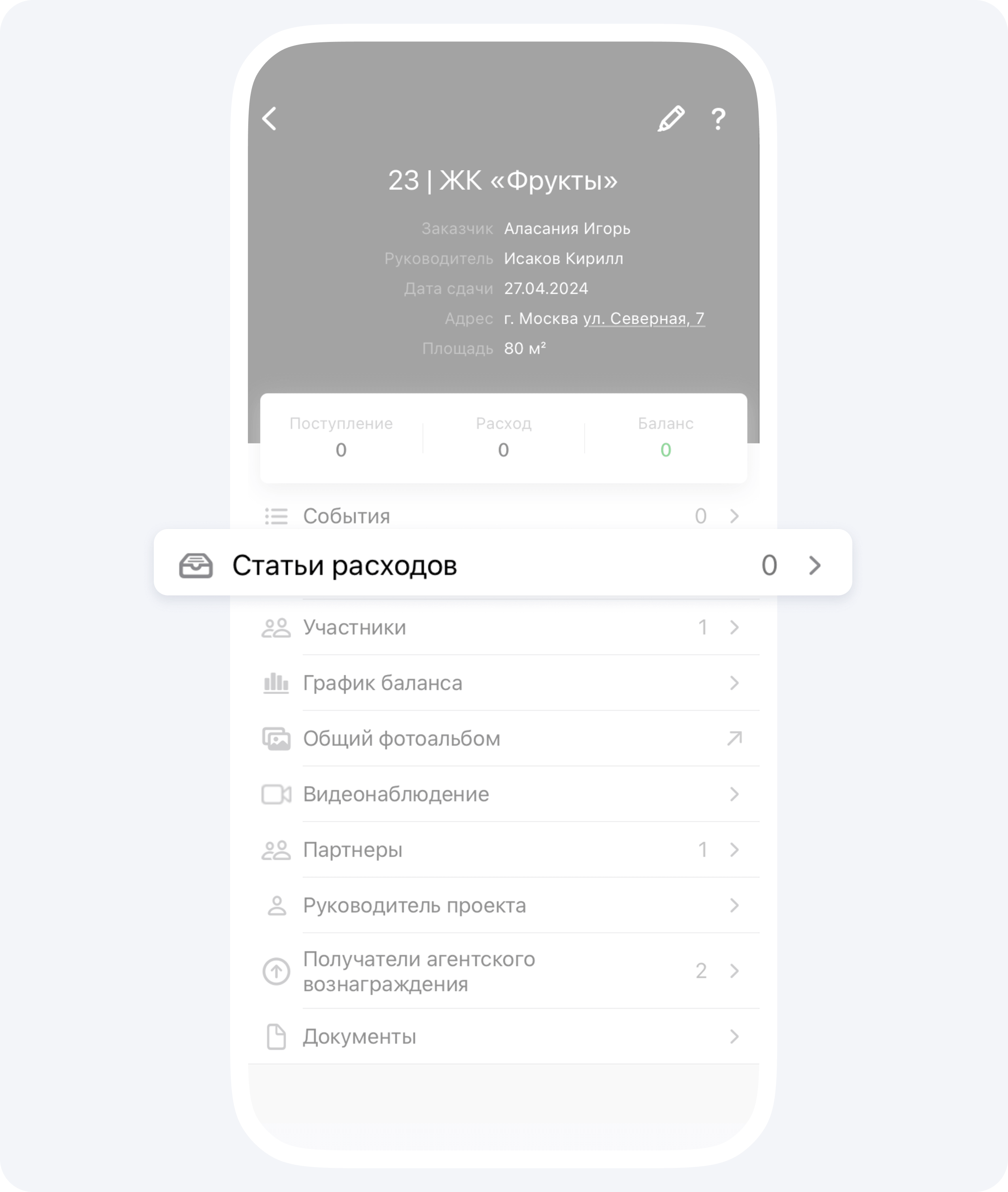 1. Зайдите в раздел Проекты на главном экране приложения и выберите проект2. Выберите раздел Статьи расходов