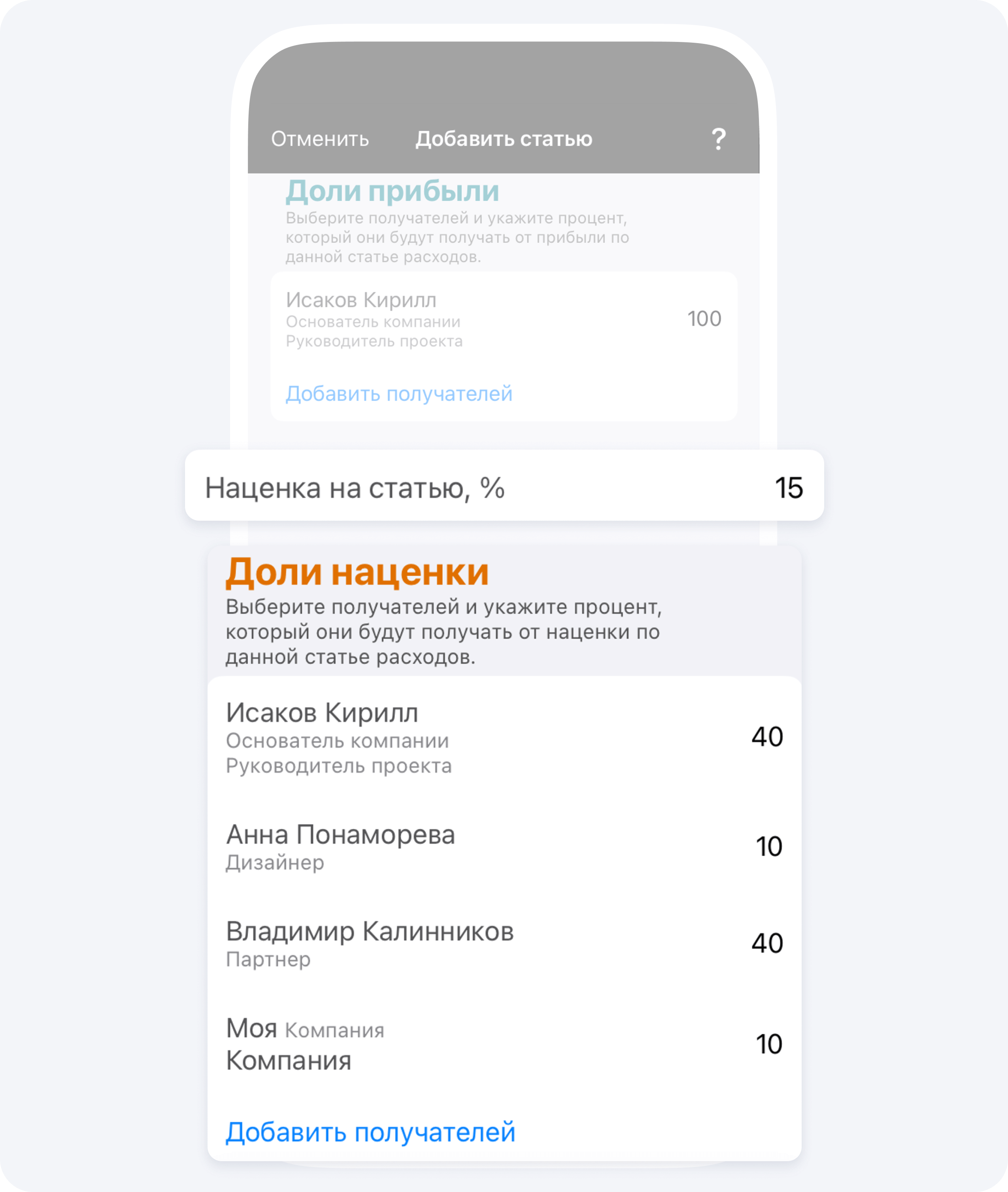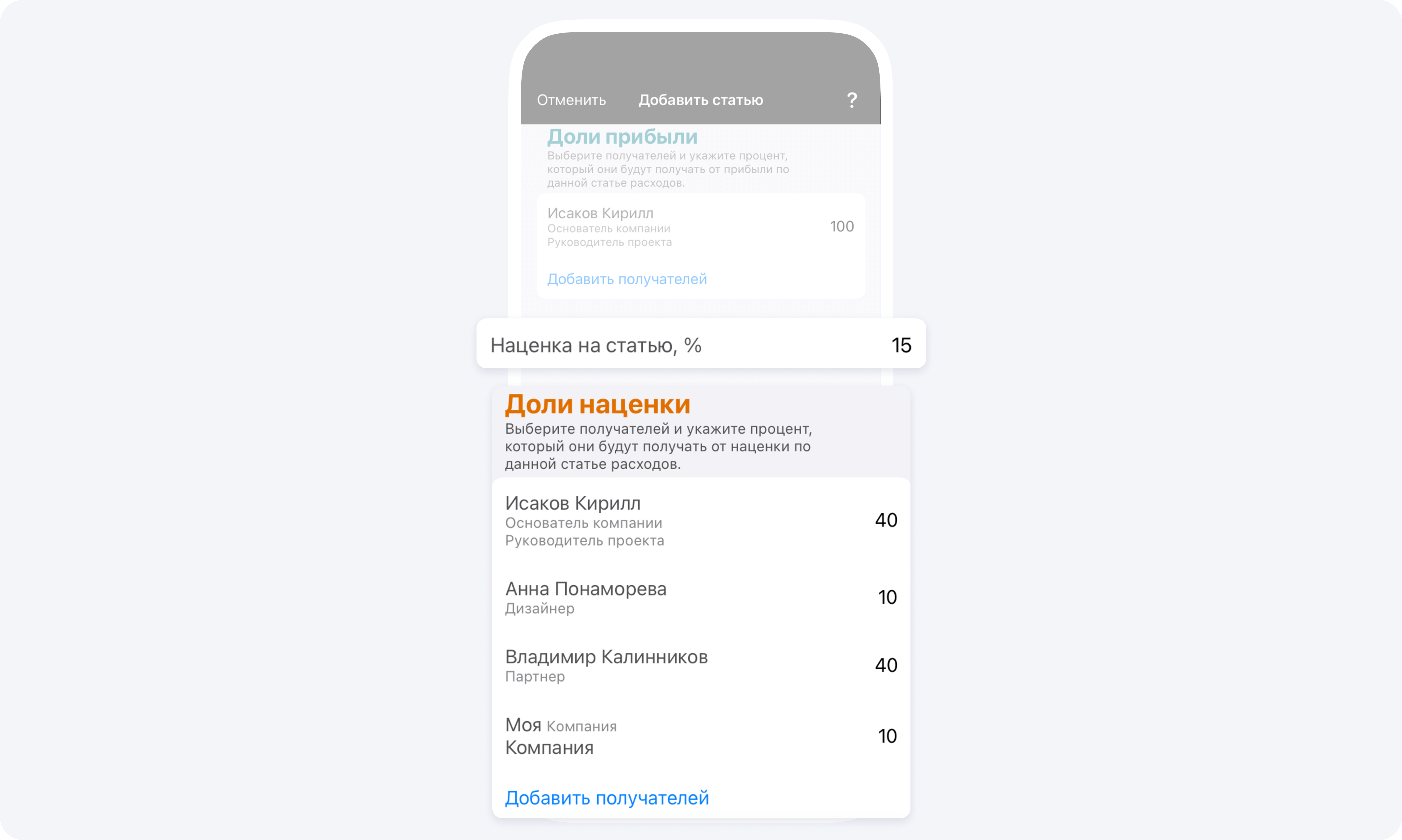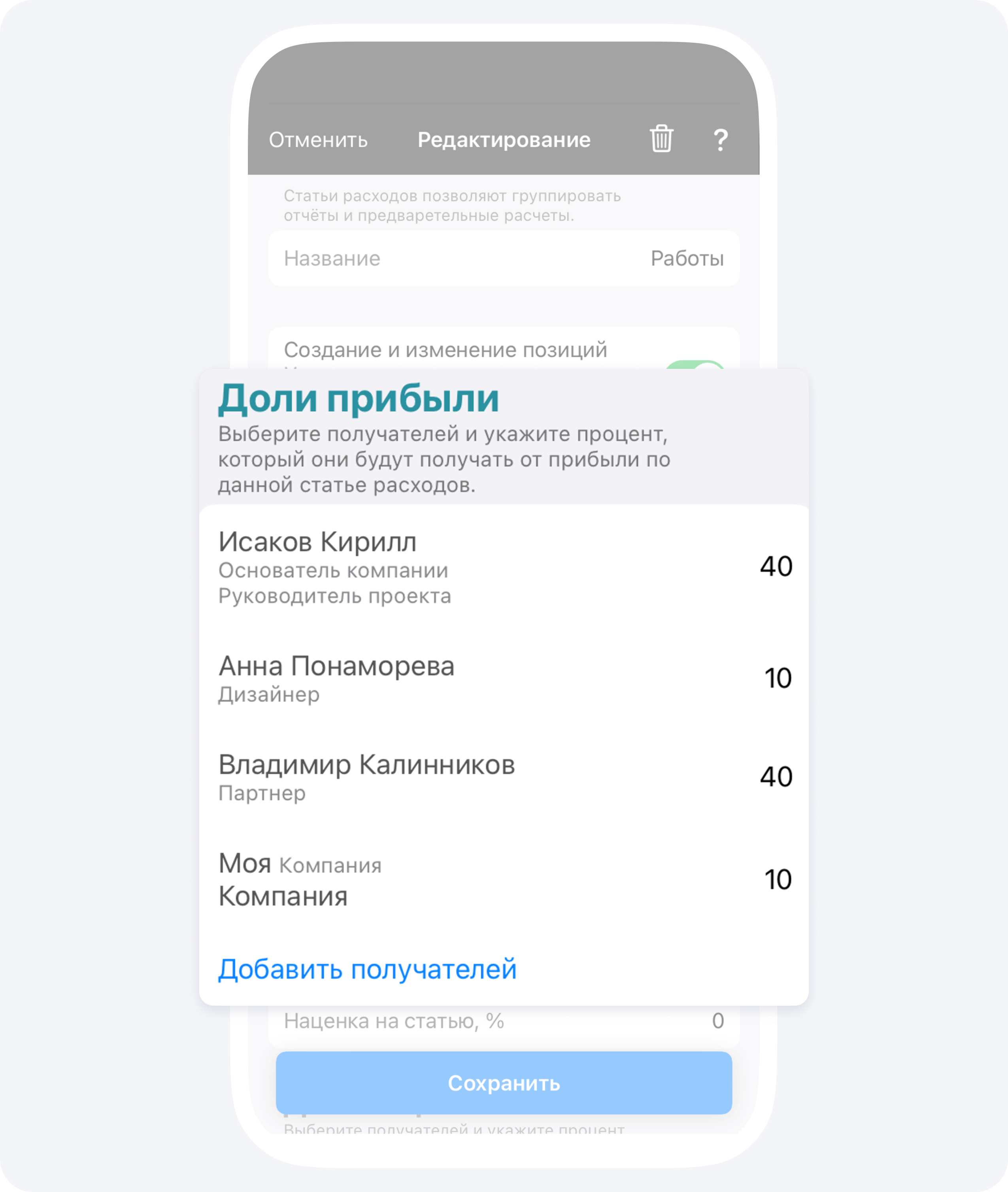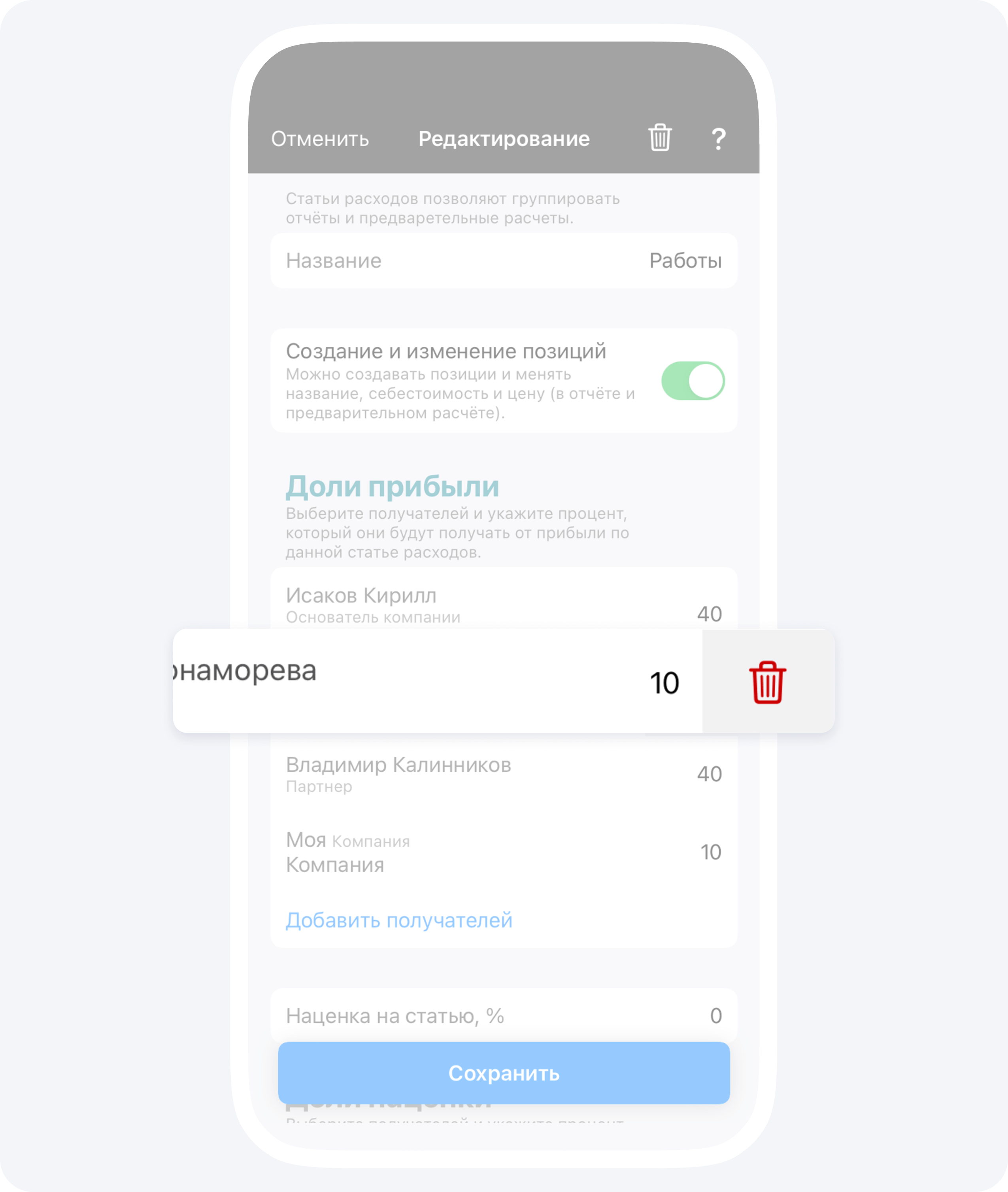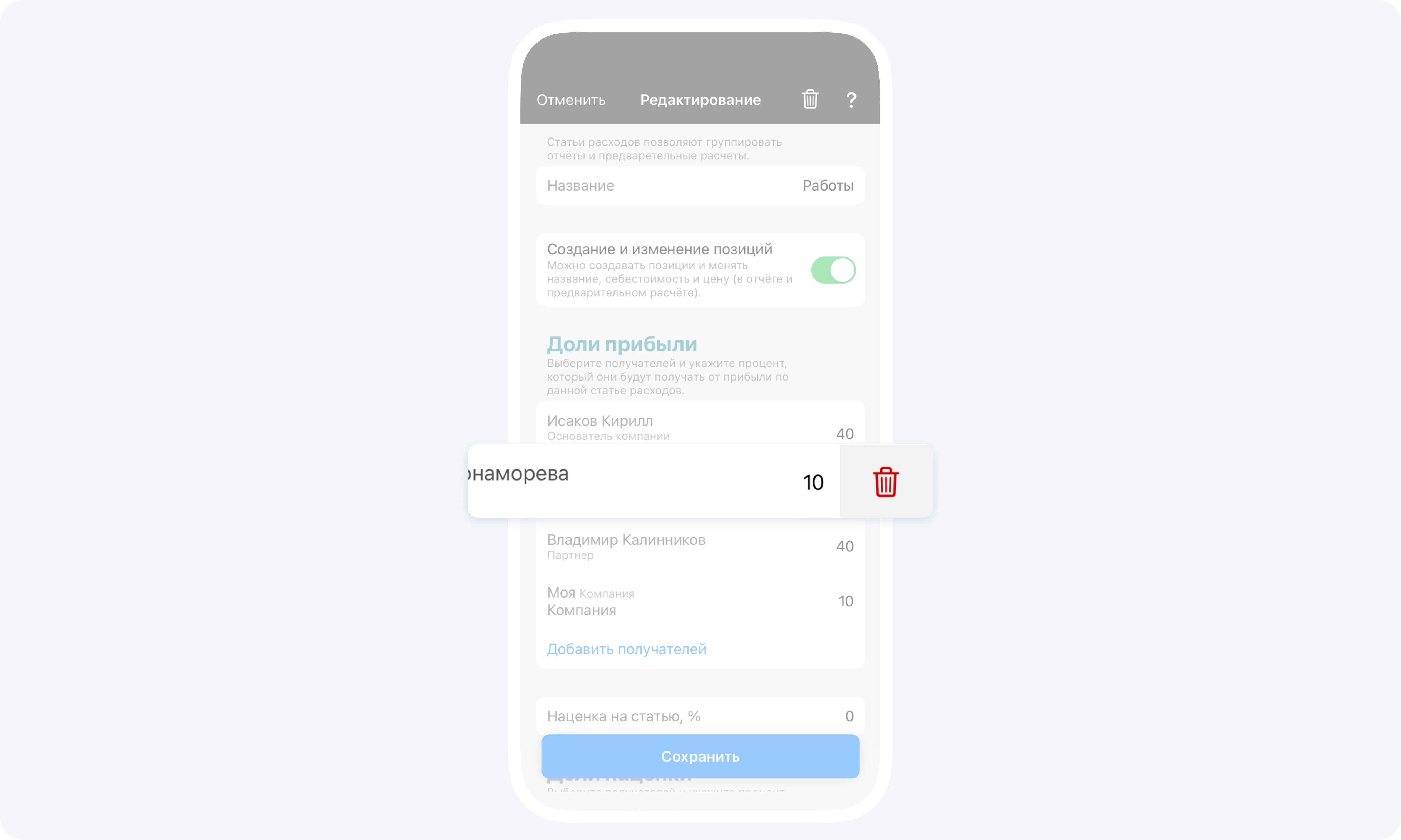 Чтобы удалить получателя долей прибыли или наценки используйте свайп влево.