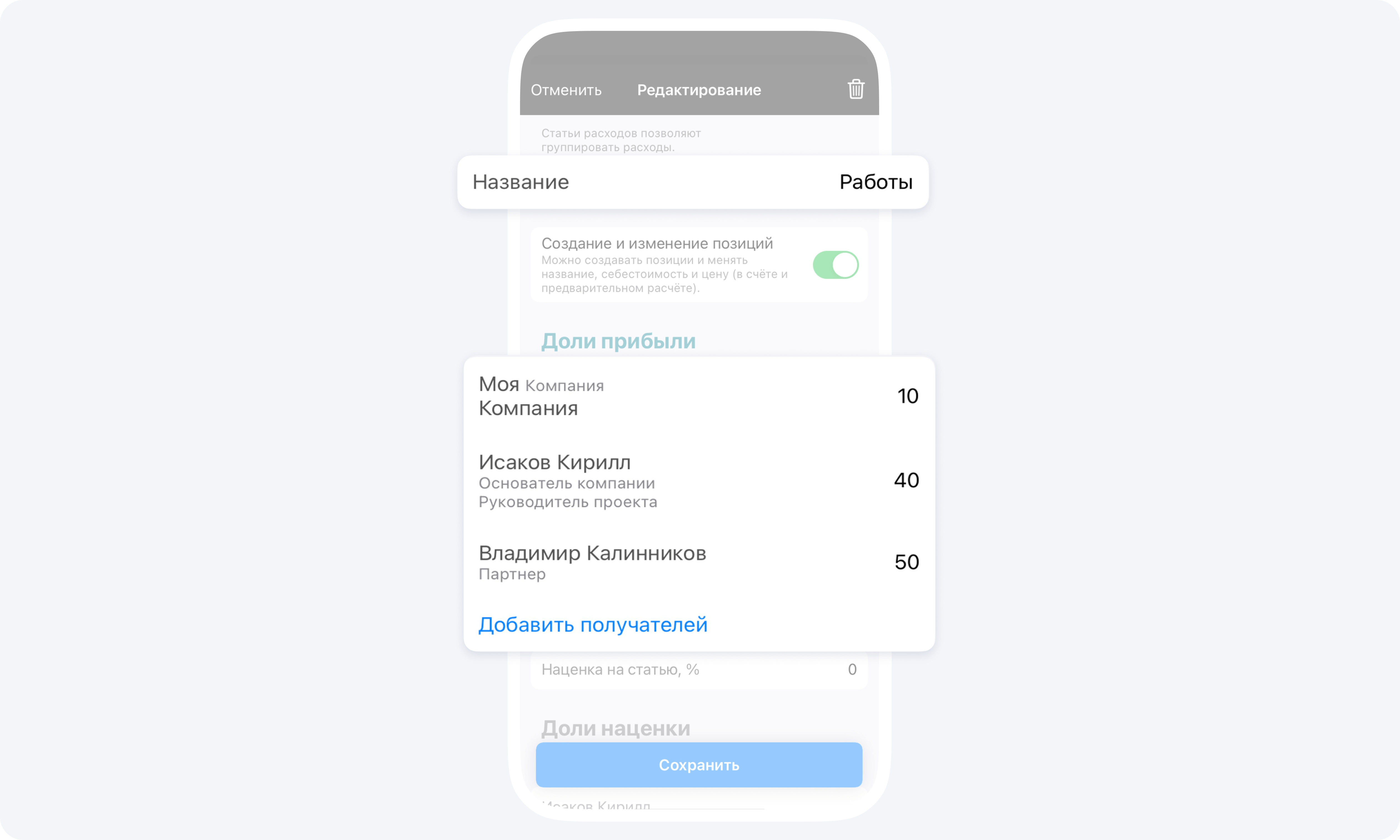 В статье расходов настраивается распределение наценки, прибыли и управление возможностью создавать позиции и менять название, себестоимость и цену в отчёте и предварительном расчёте.
